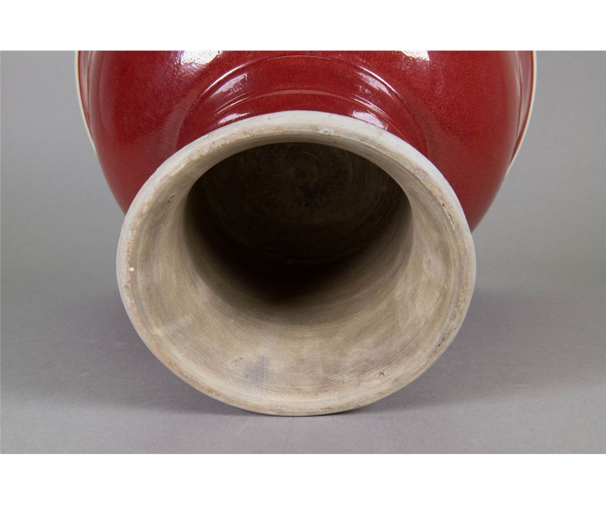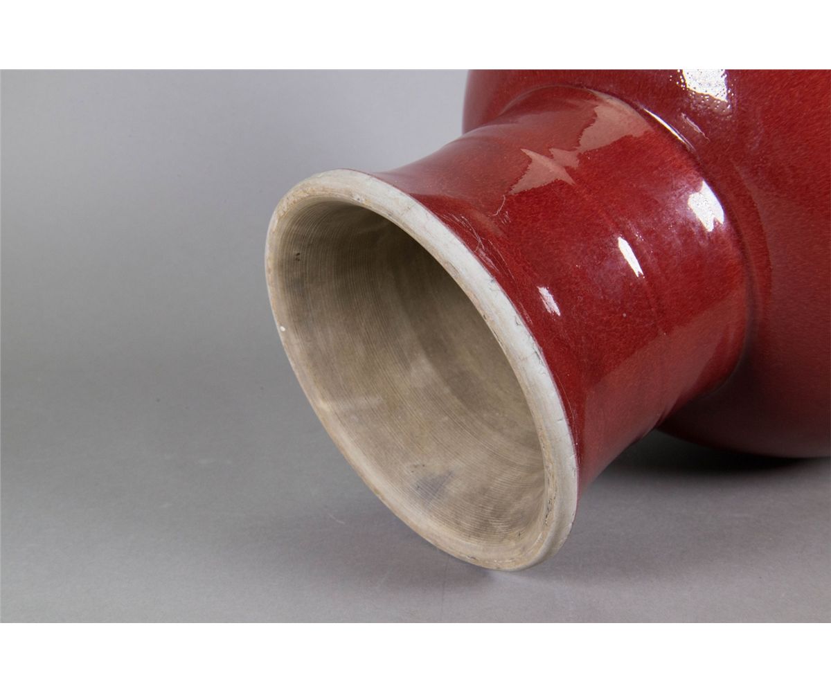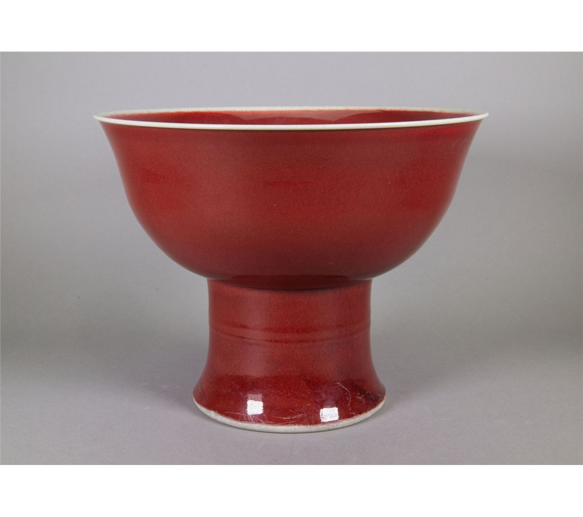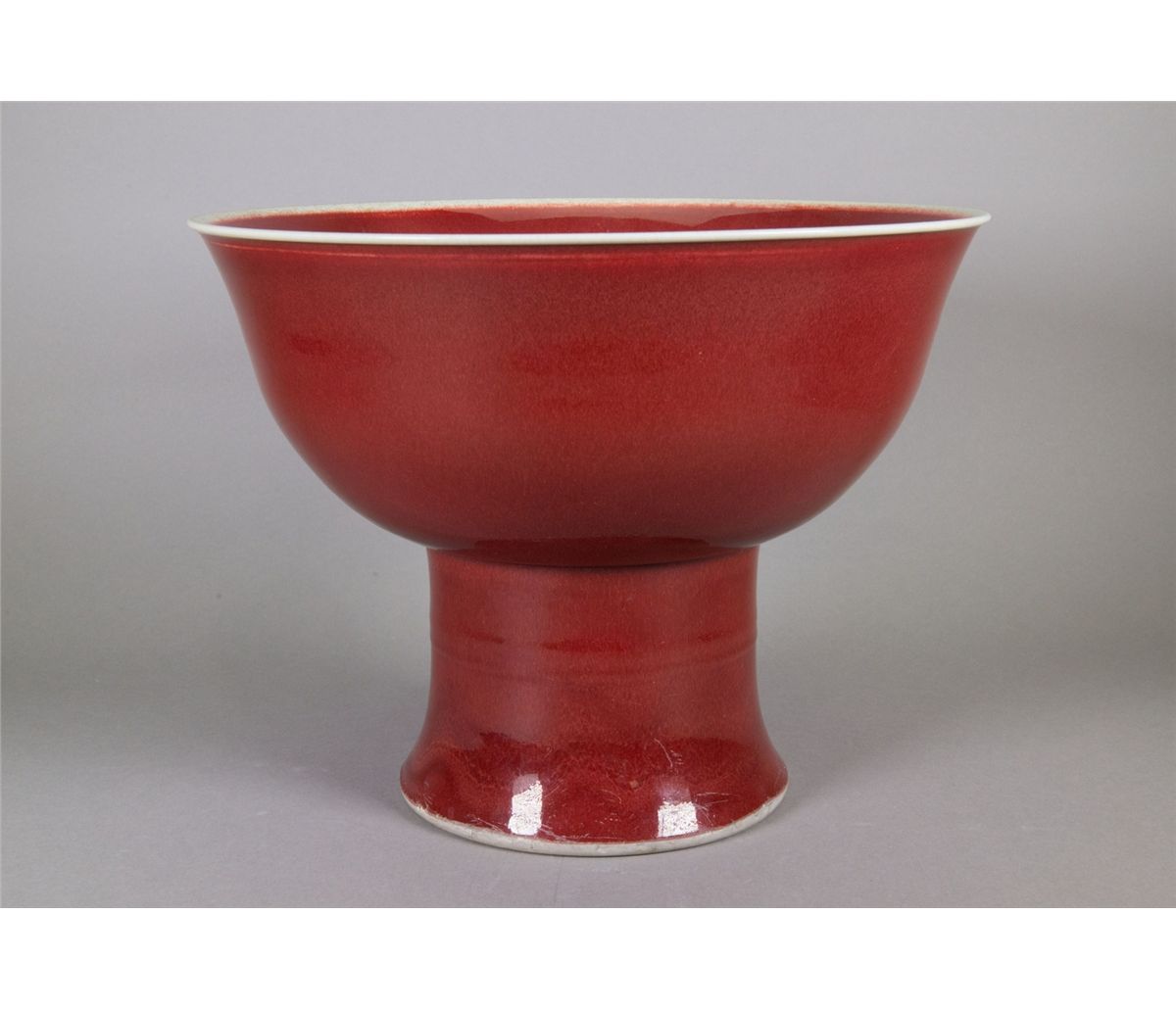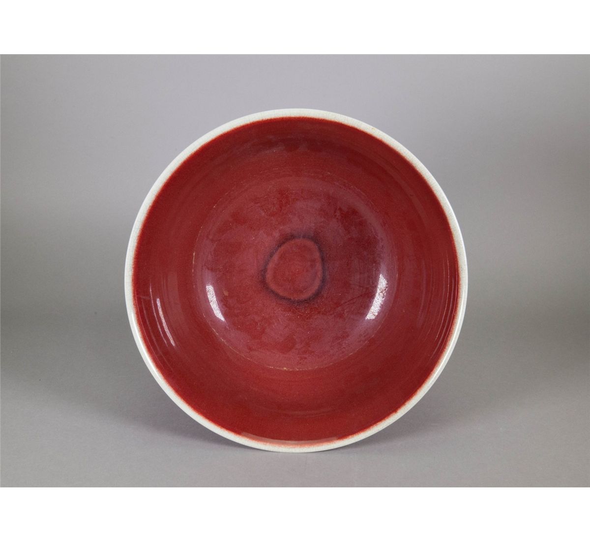 Chinese red flambe large porcelain bowl; raised on everted high foot rim; H: 27 cm, W: 35 cm, 5 kg