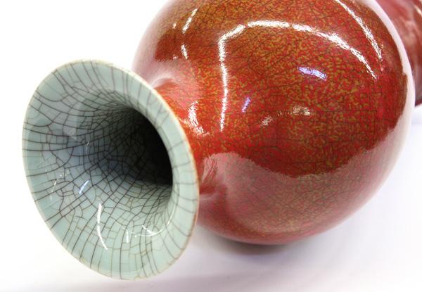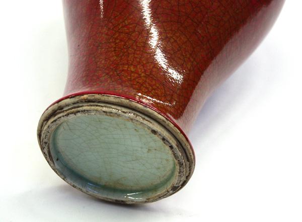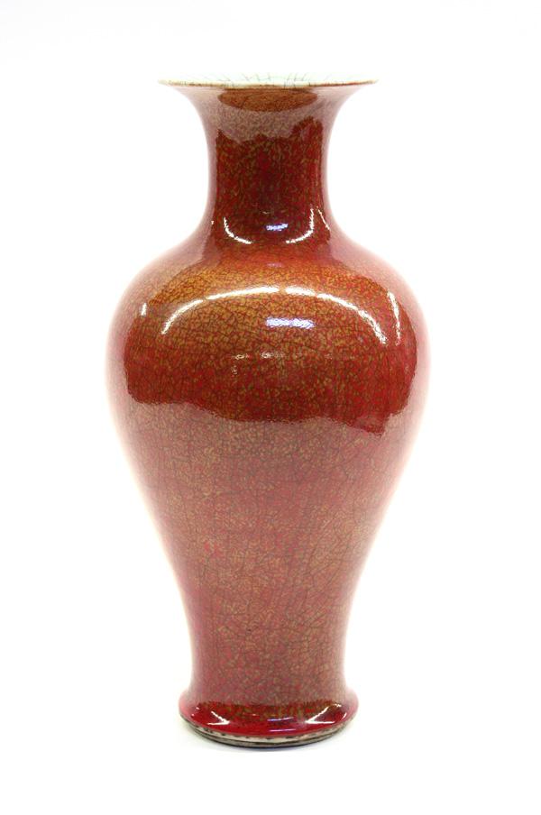 Chinese red glazed porcelain baluster vase, with a tall waisted neck and tapering body covered overall in a mottled deep red glaze with a wide crackle pattern repeated on the celadon-glazed interior of the flaring mouth, 15.375''h