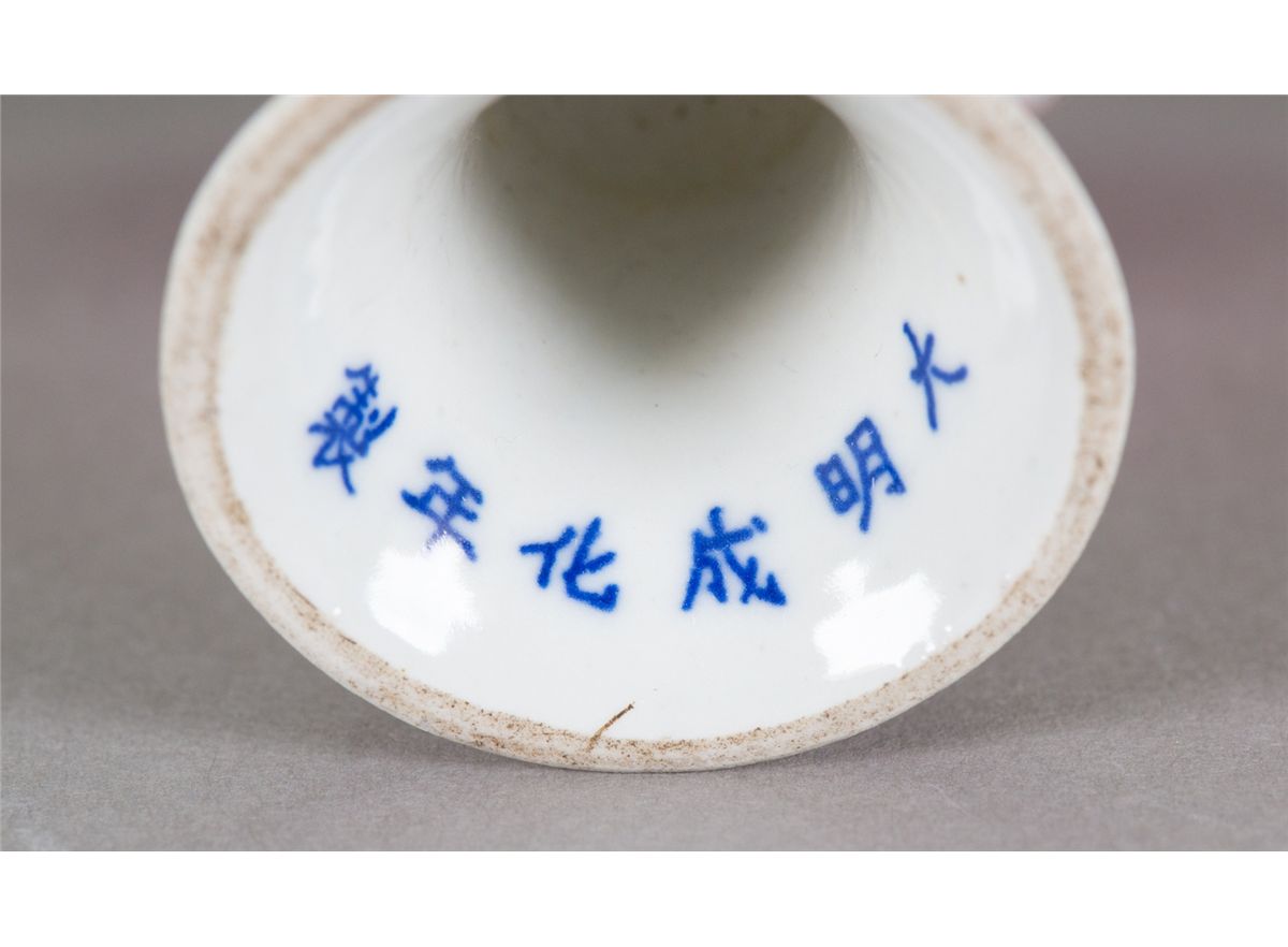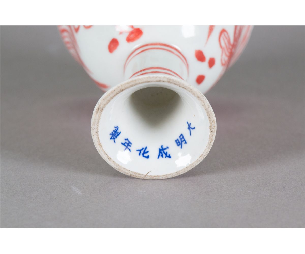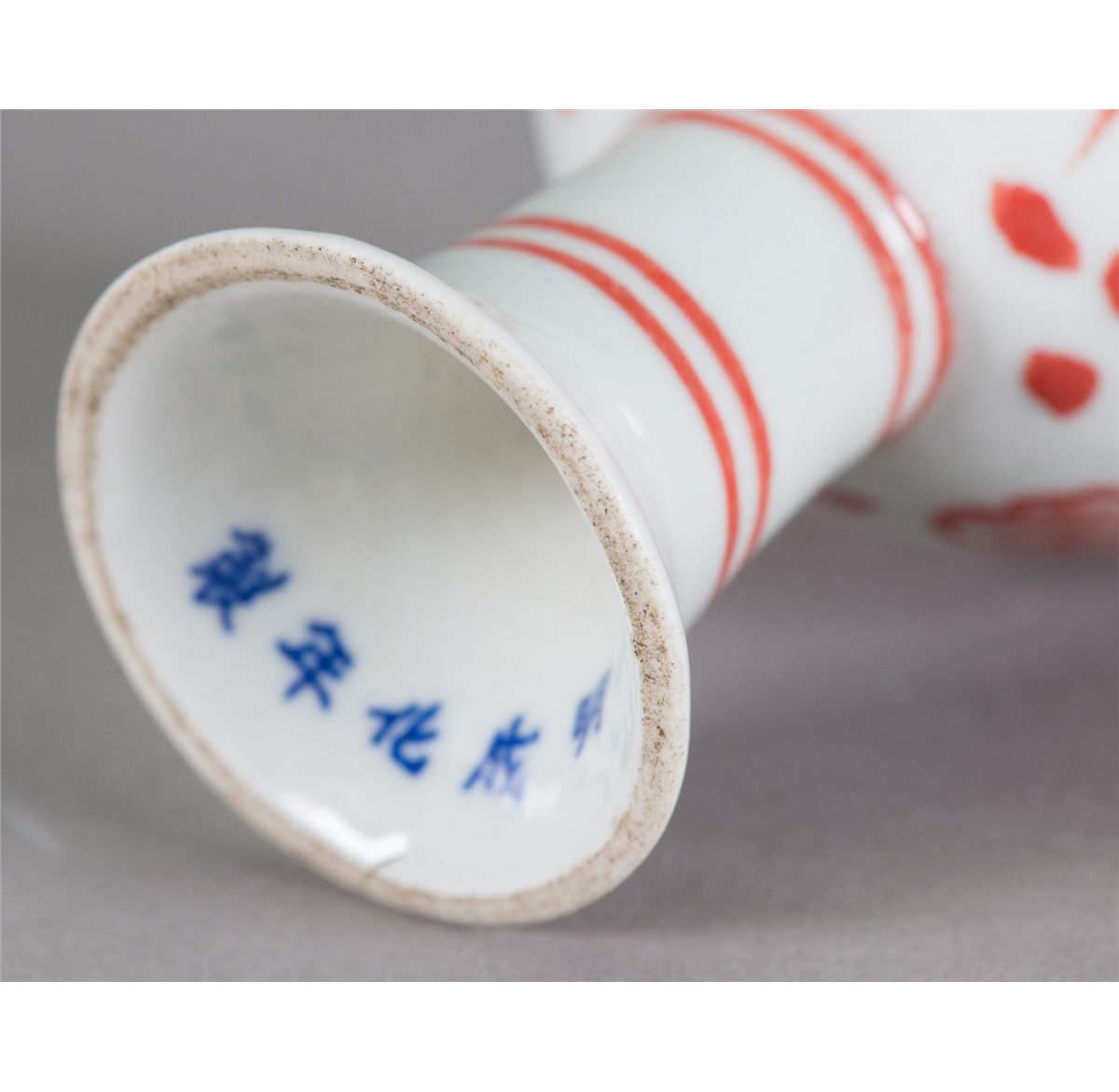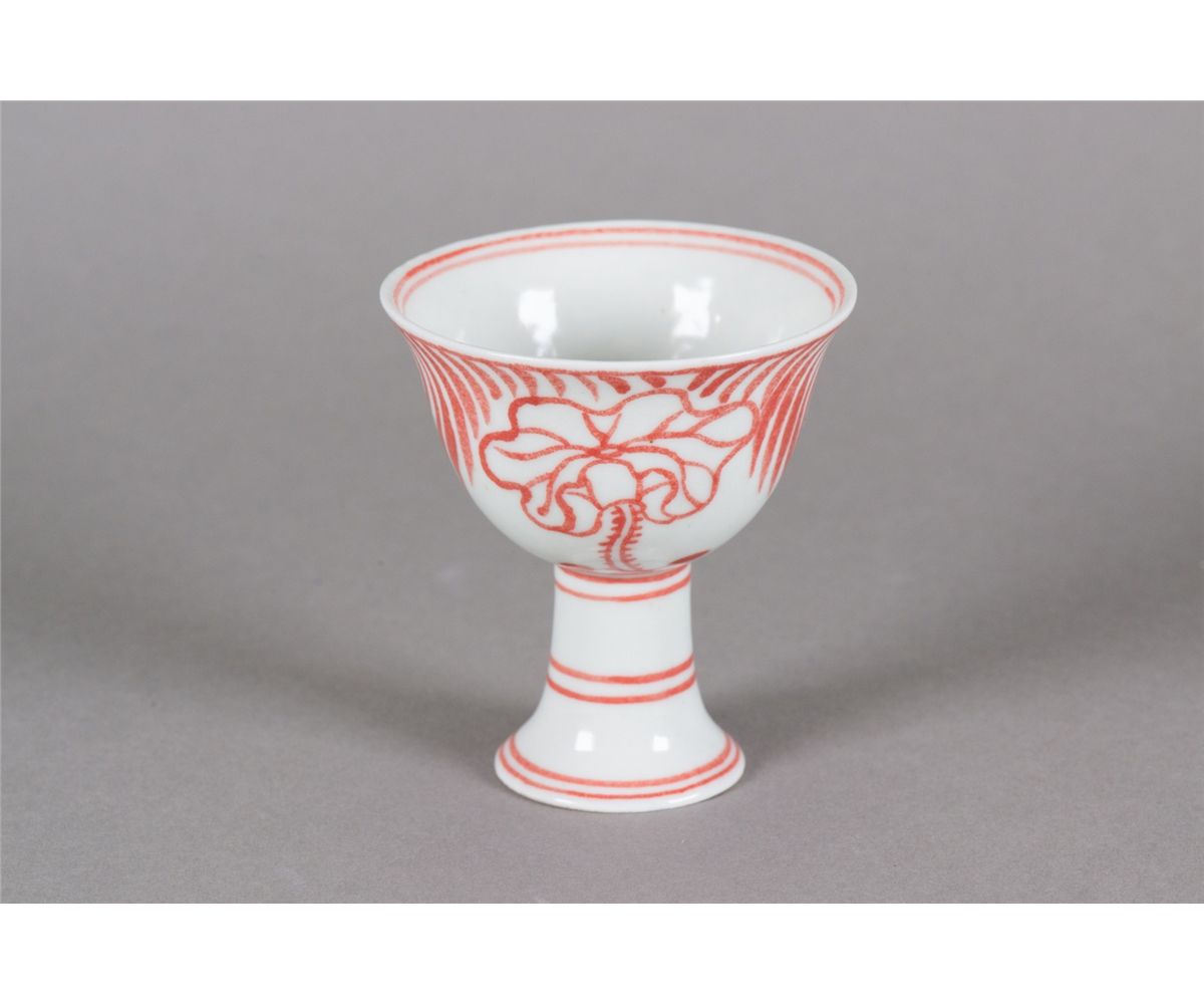 Chinese red and white glazed porcelain stem cup; raised on high flared foot rim; featuring fish and lotus leaf on body; six-character Ming Chenghua mark on base; H: 8 cm, D: 8.5 cm, 83 grams