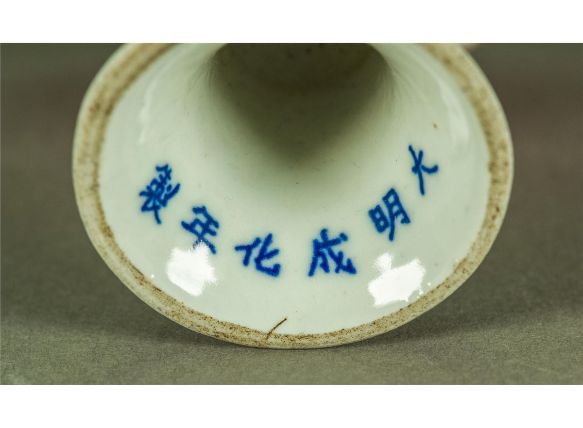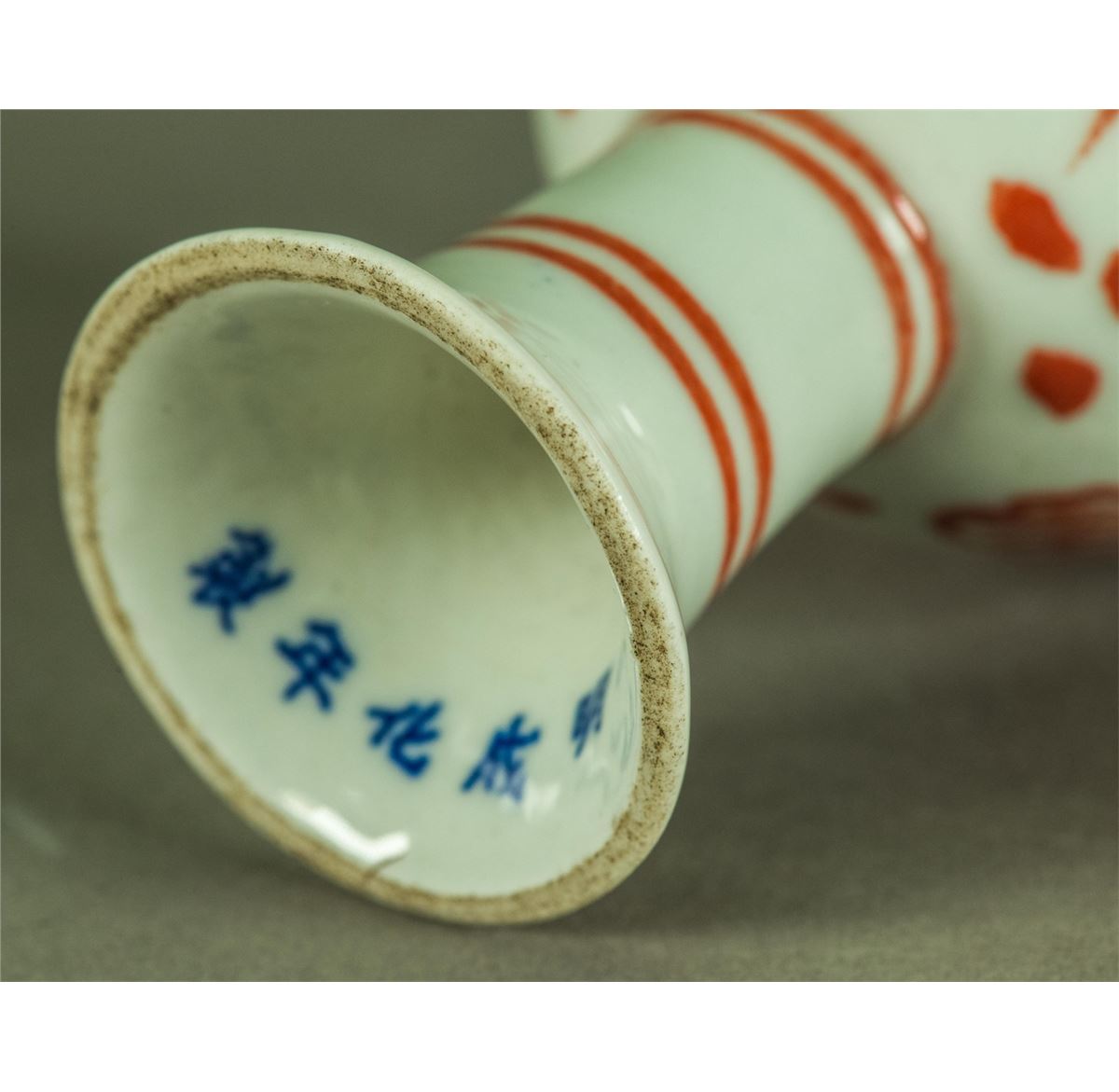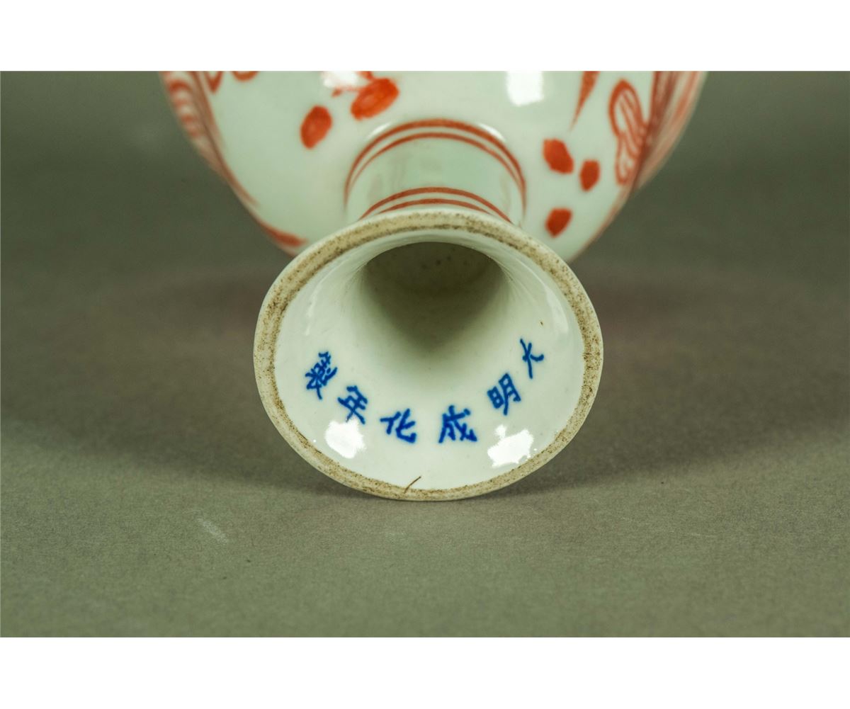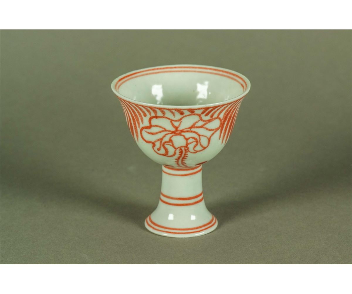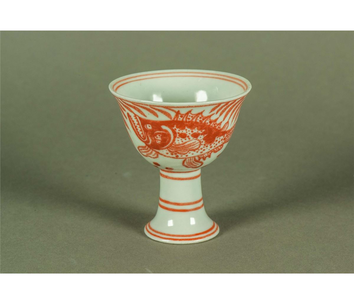 Chinese red and white glazed porcelain stem cup; raised on high flared foot rim; featuring fish and lotus leaf on body; six-character Ming Chenghua mark on base; H: 8 cm, D: 8.5 cm, 83 grams