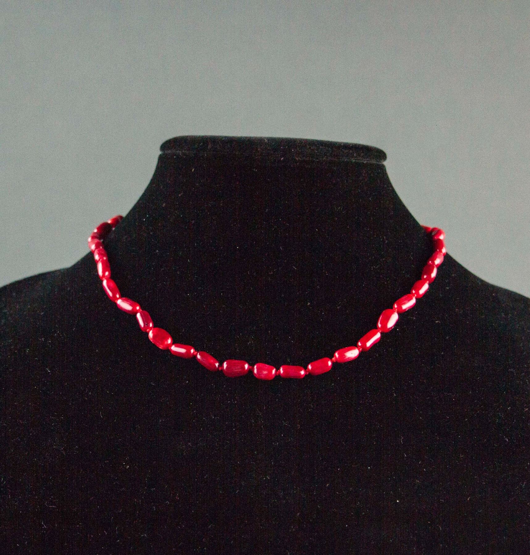 Chinese red hardstone carved necklace; comprised of numerous cylinder form beads; D: 21.5 cm, W: 0.5 cm, 17 grams