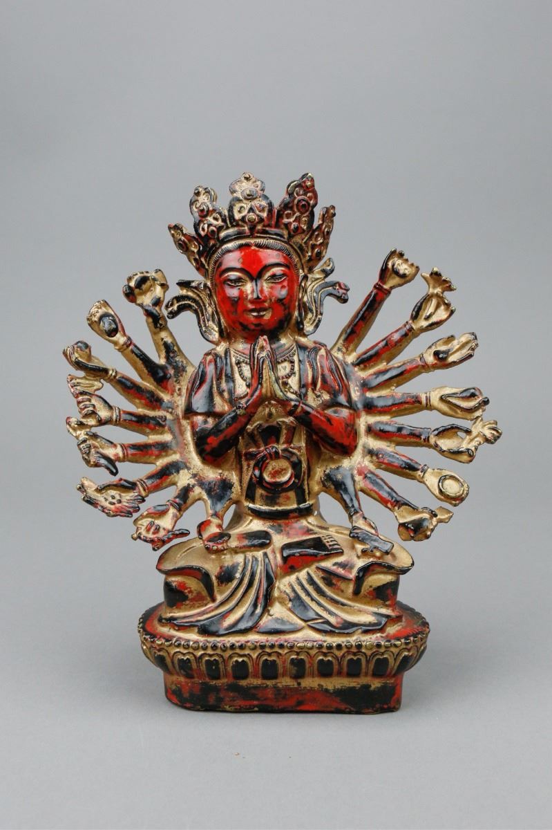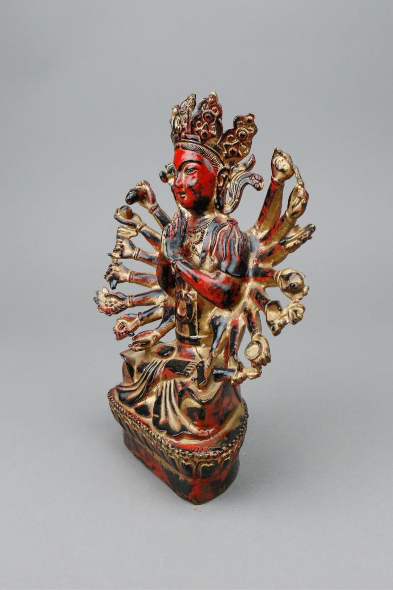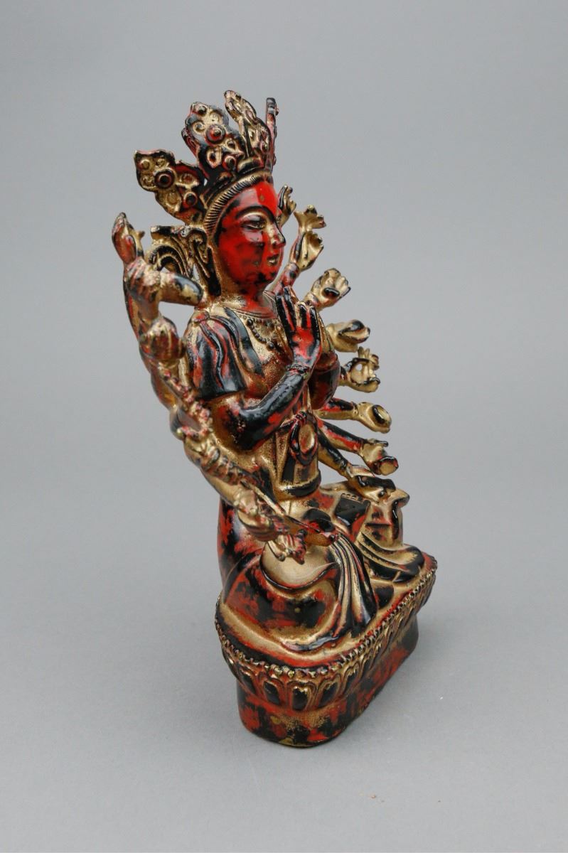 Chinese red lacquer bronze Buddha figure; depicting Buddha wearing a crown with numerous hands; covered by gilt red lacquer; H: 20 cm, W: 17 cm, 1106 grams