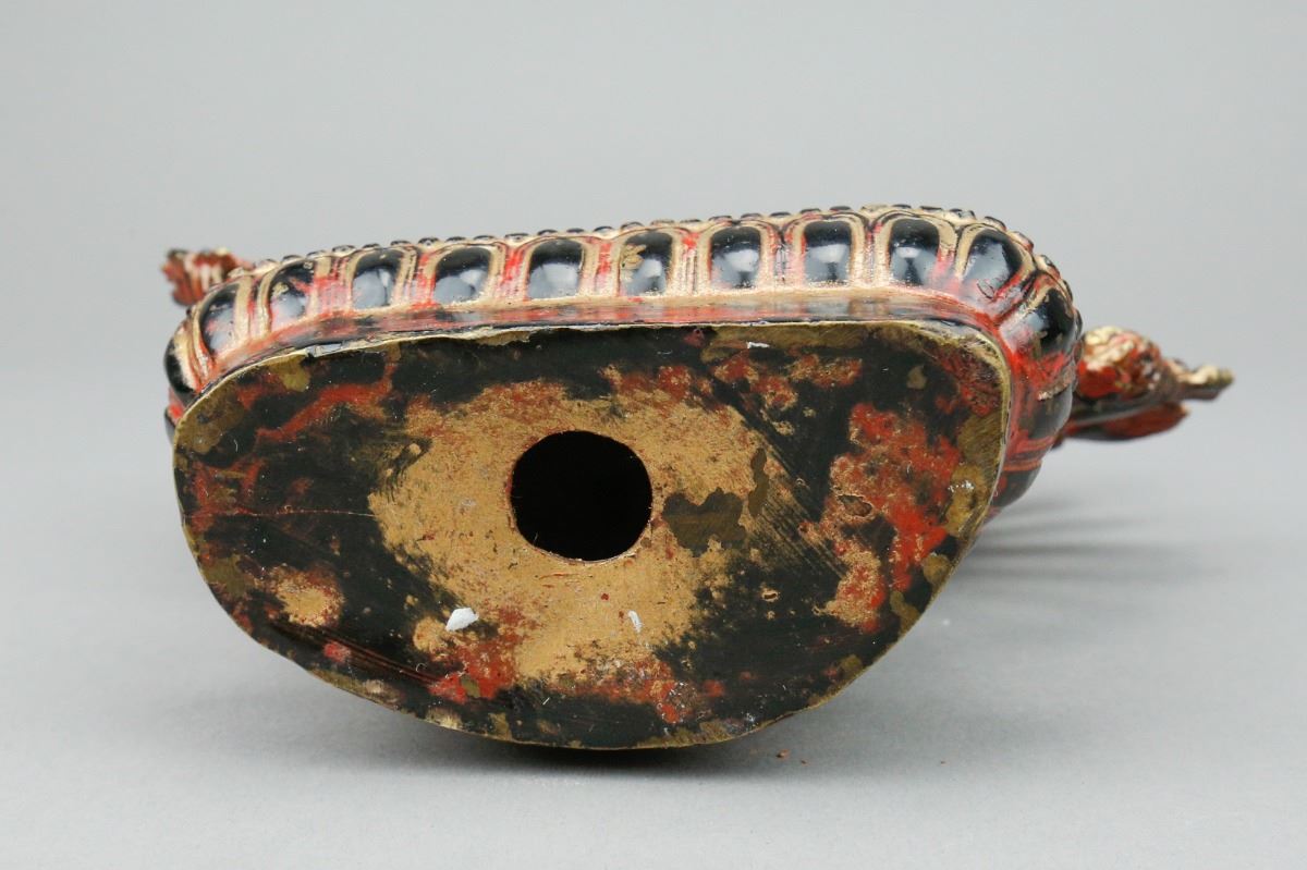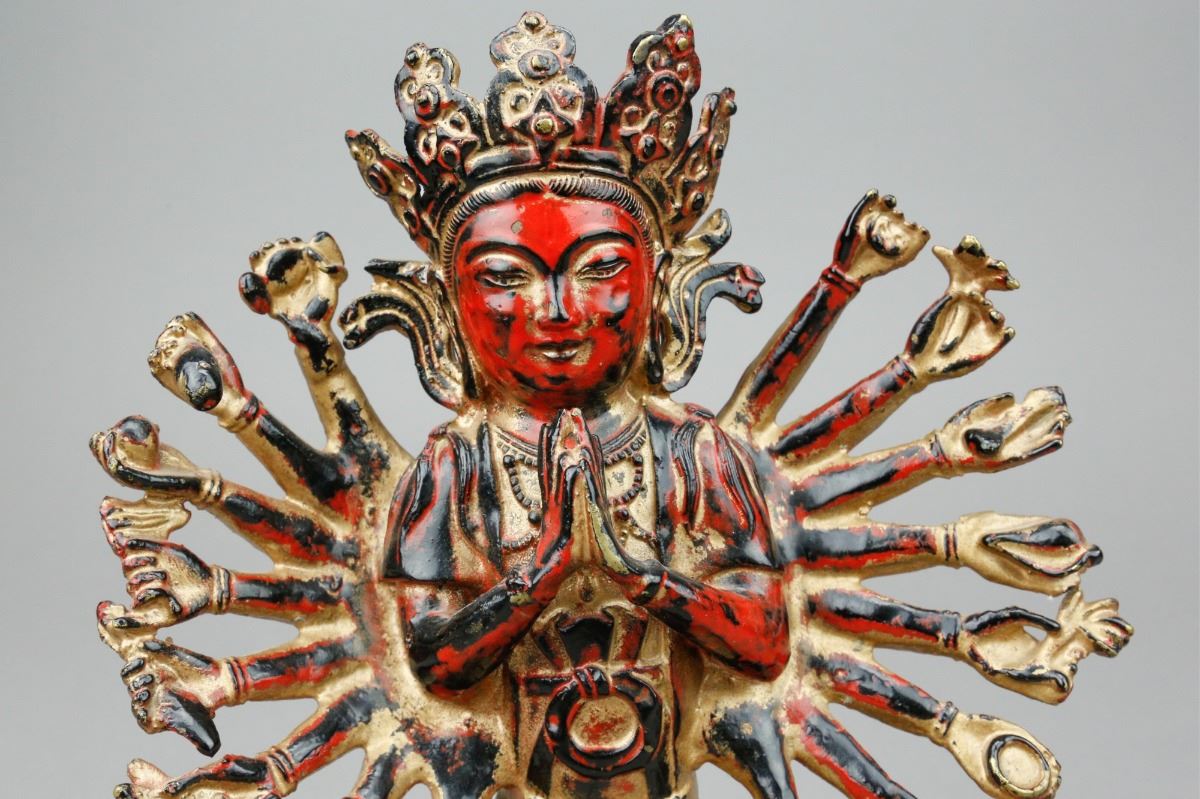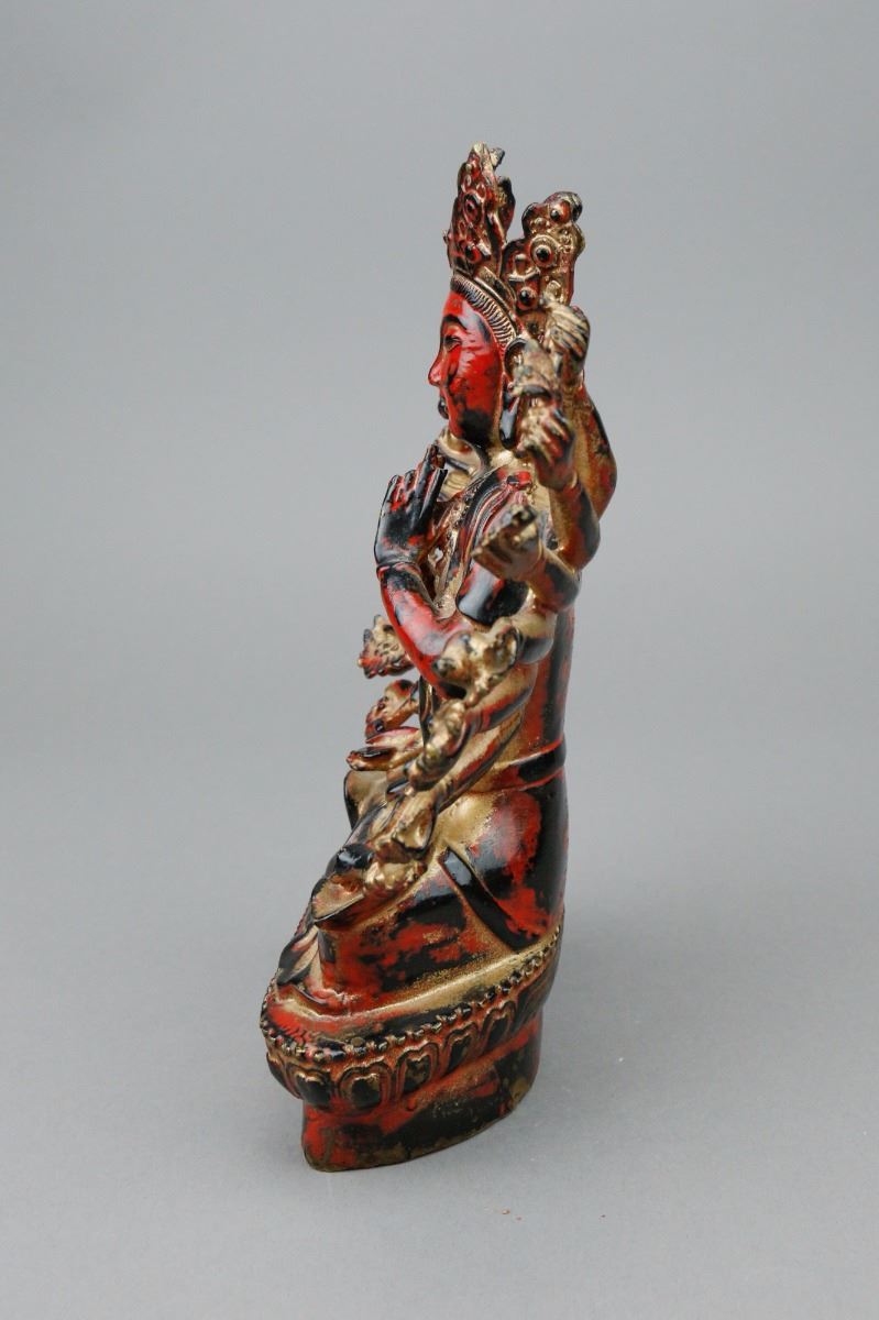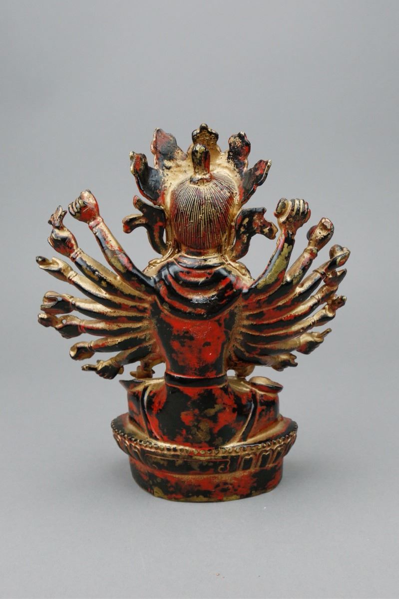 Chinese red lacquer bronze Buddha figure; depicting Buddha wearing a crown with numerous hands; covered by gilt red lacquer; H: 20 cm, W: 17 cm, 1106 grams