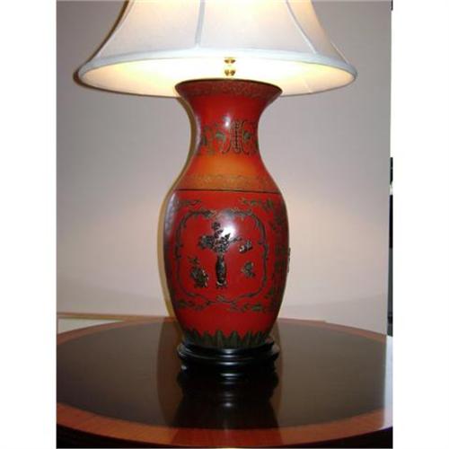 <tr><td><font size="2" face="Arial, Helvetica, sans-serif"><strong><font color="#000033">Title:</font></strong>Chinese Red Lacquer Lamp with Raised Curios</font></td></tr>
