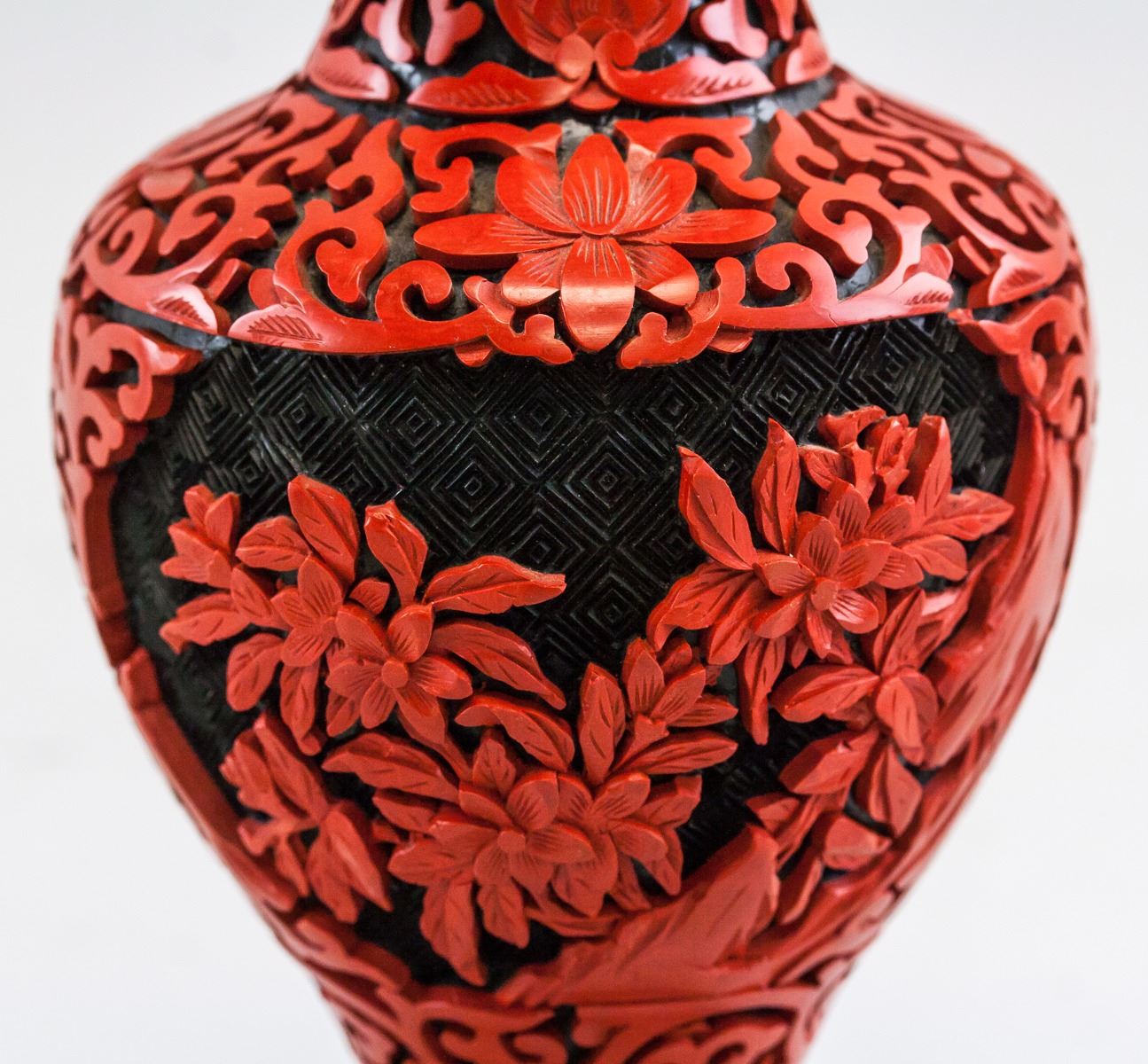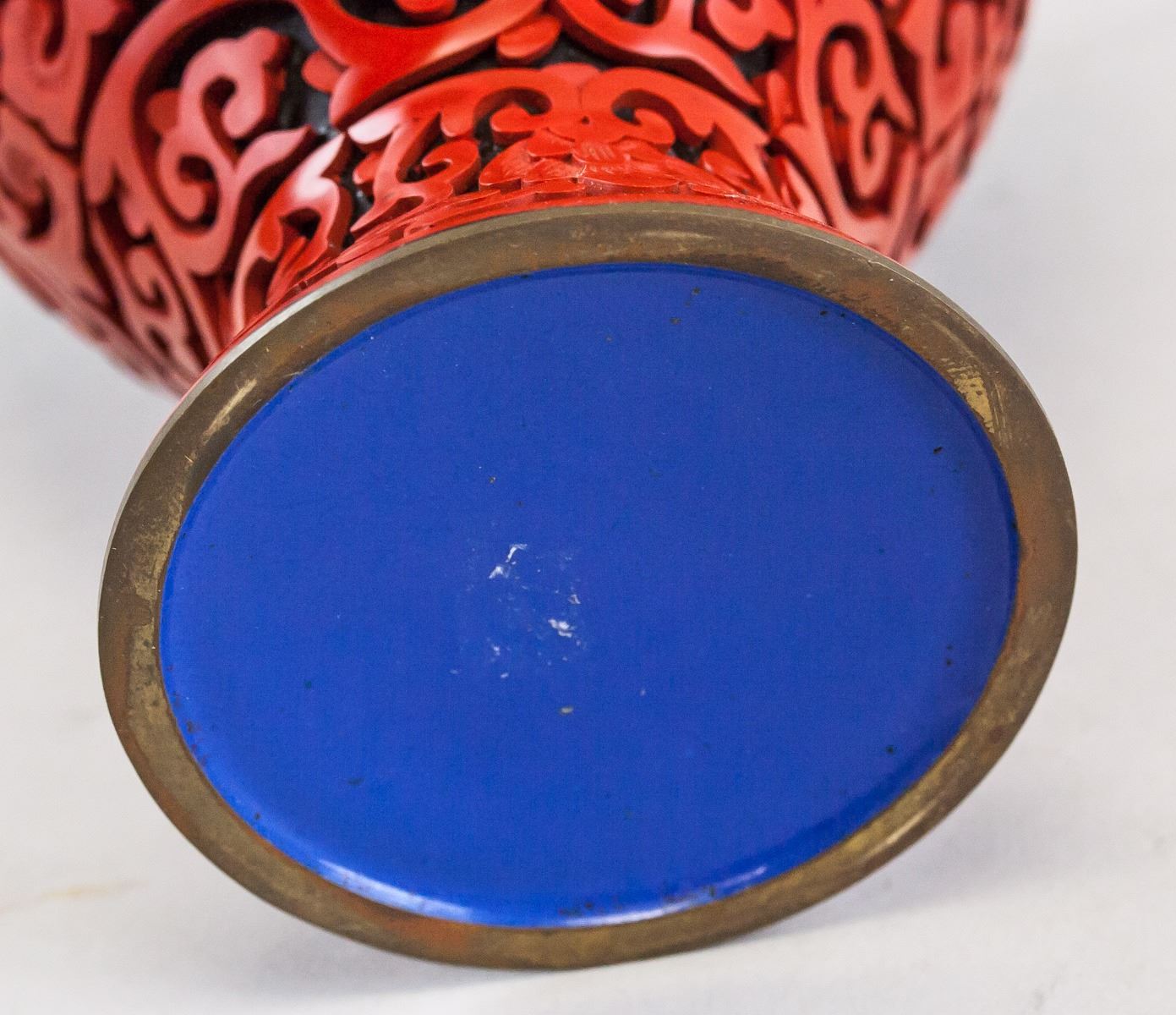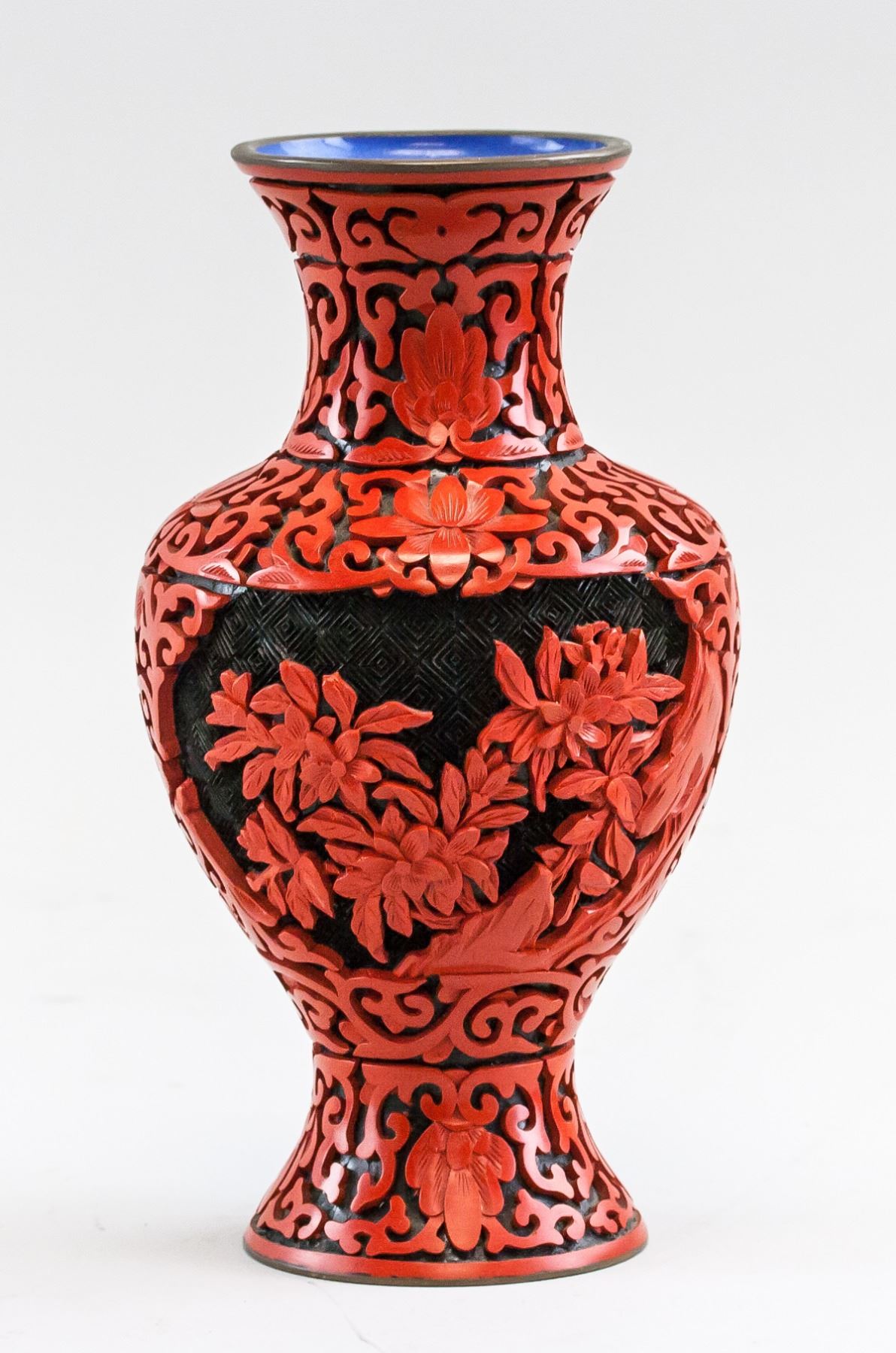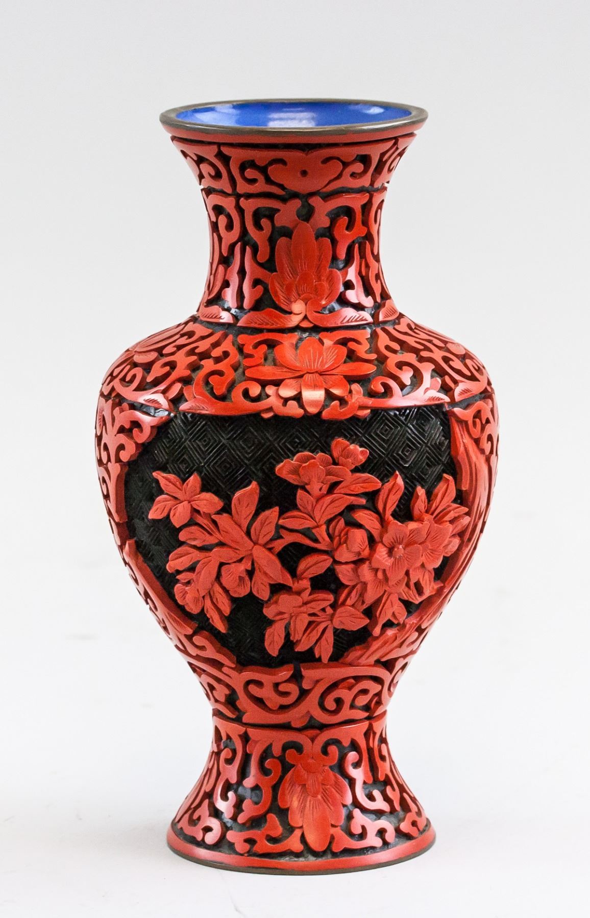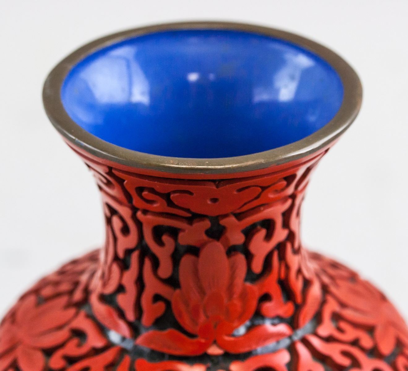 Chinese lacquer porcelain vase. Of red coloring with blue interior. Decorated with carved flowers. 17 x 9 cm, 277 grams.