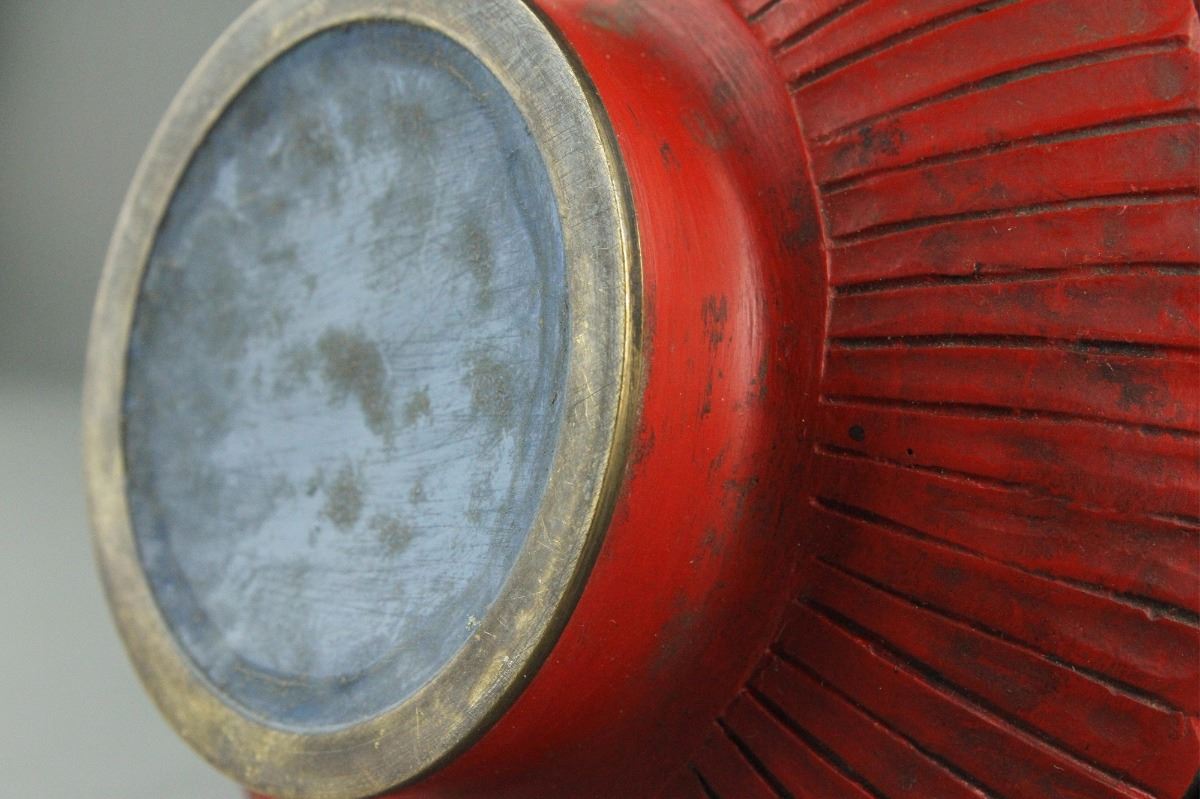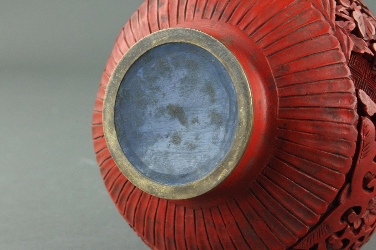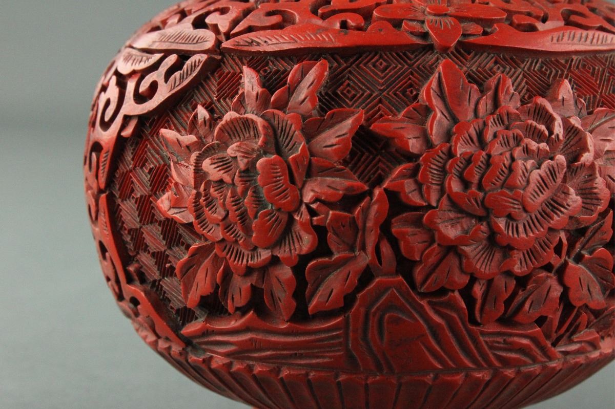 Chinese red lacquer vase; of Shang bottle vase form; featuring peonies and orchid scrollwork in relief; H: 20 cm, D: 13 cm, 3030 grams