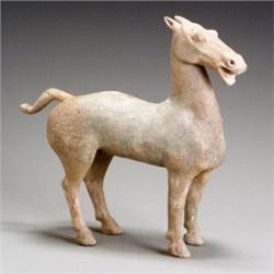 Chinese Red Painted Gray Pottery, Figure of a Horse, Han Dynasty (206 B.C.-220 A.D.), Resto...