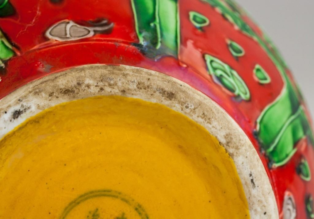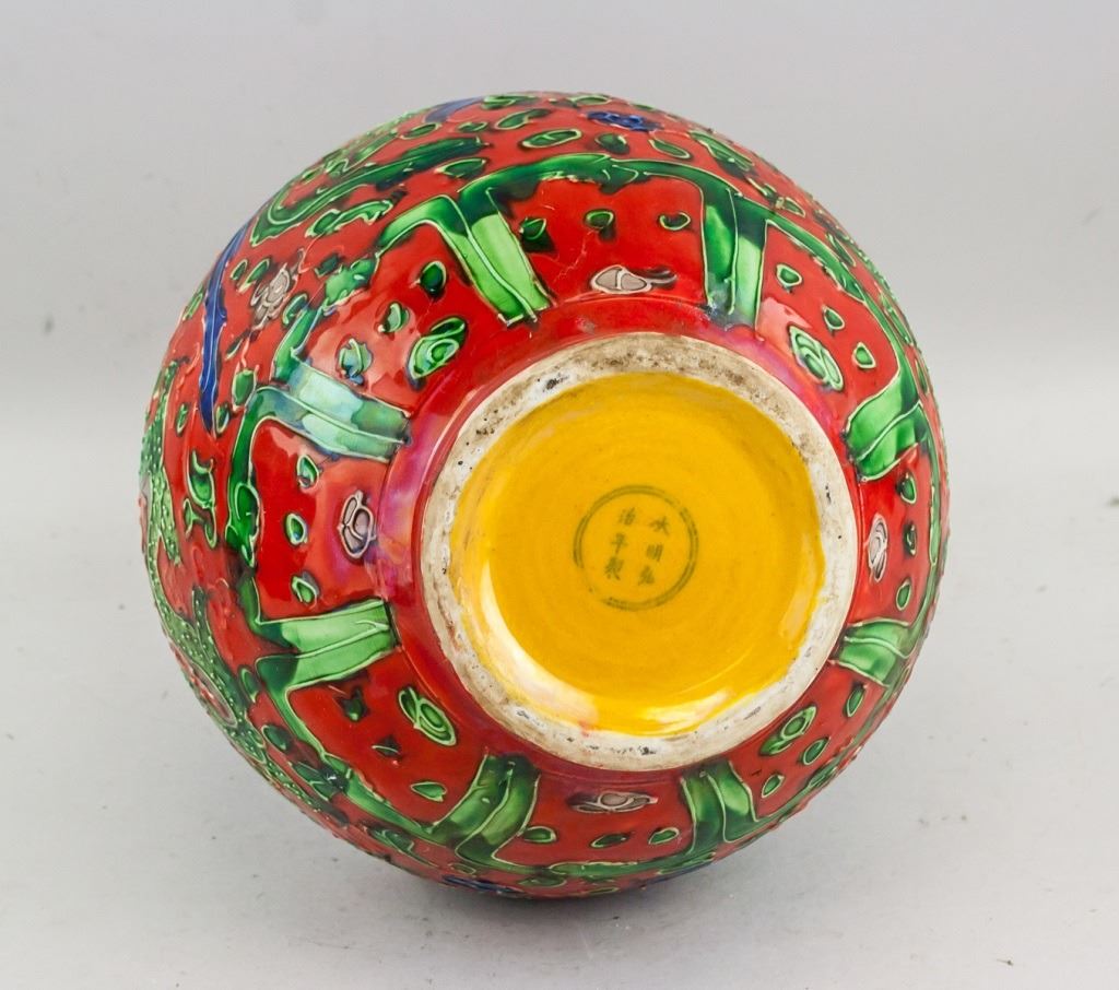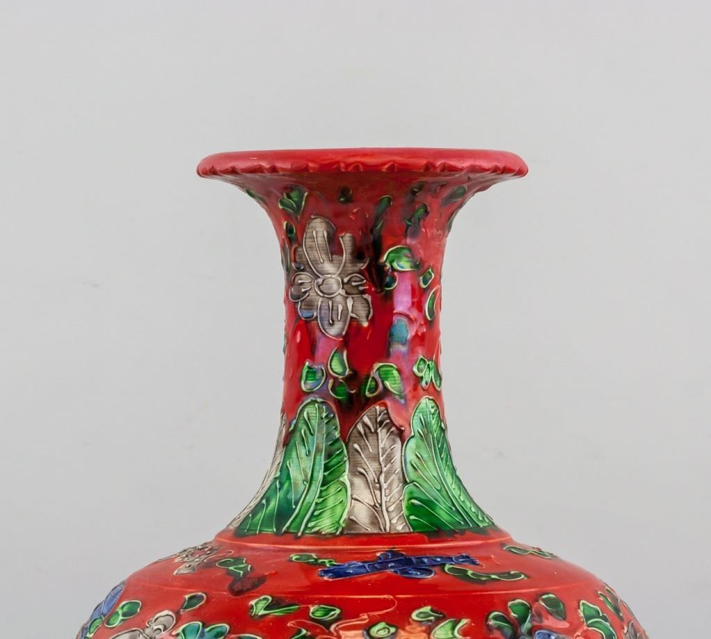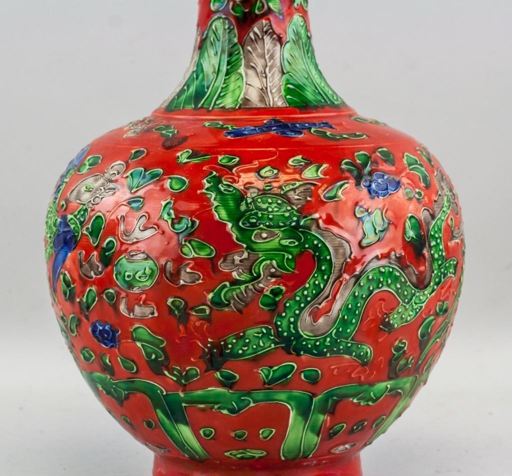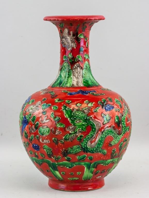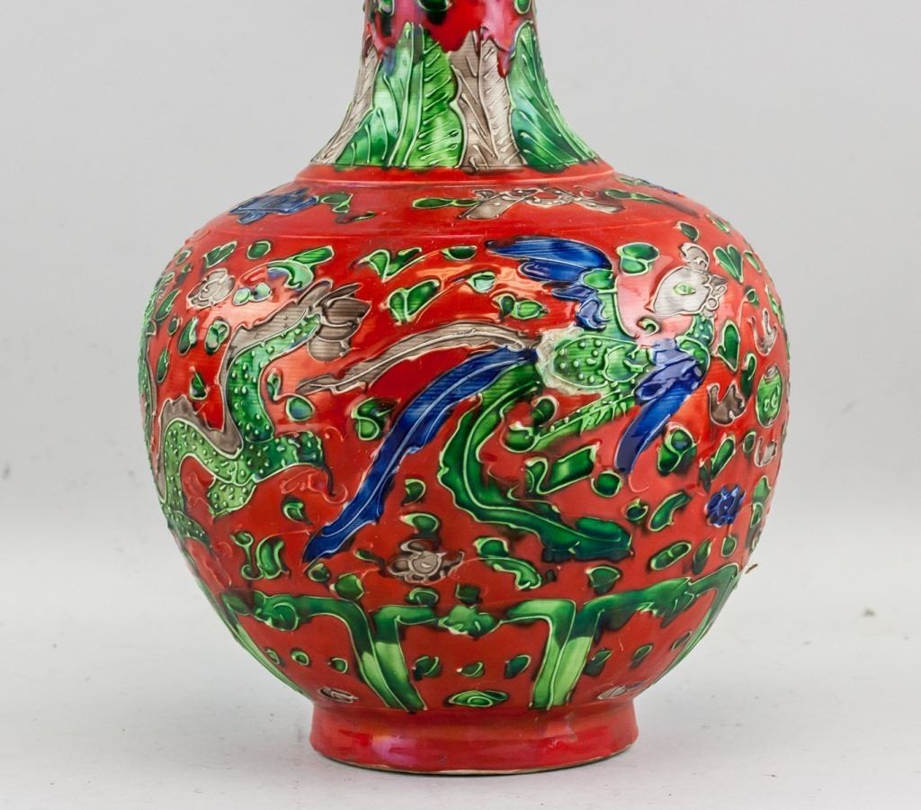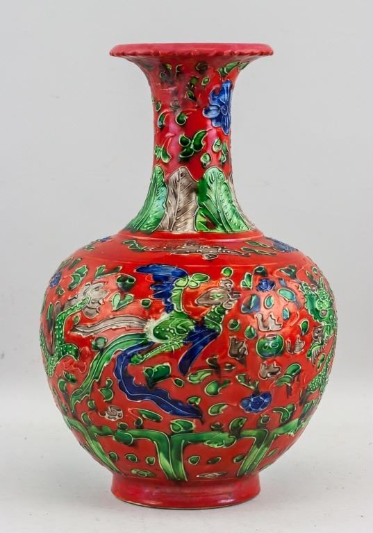 Chinese red porcelain vase. Of globular body. Narrowed neck with splayed mouth rim. Painted with dragon and phoenix. Decorated with floral and leafy pattern. Six-character Ming dynasty Hongzhi mark. 33 x 22 cm, 2776 grams