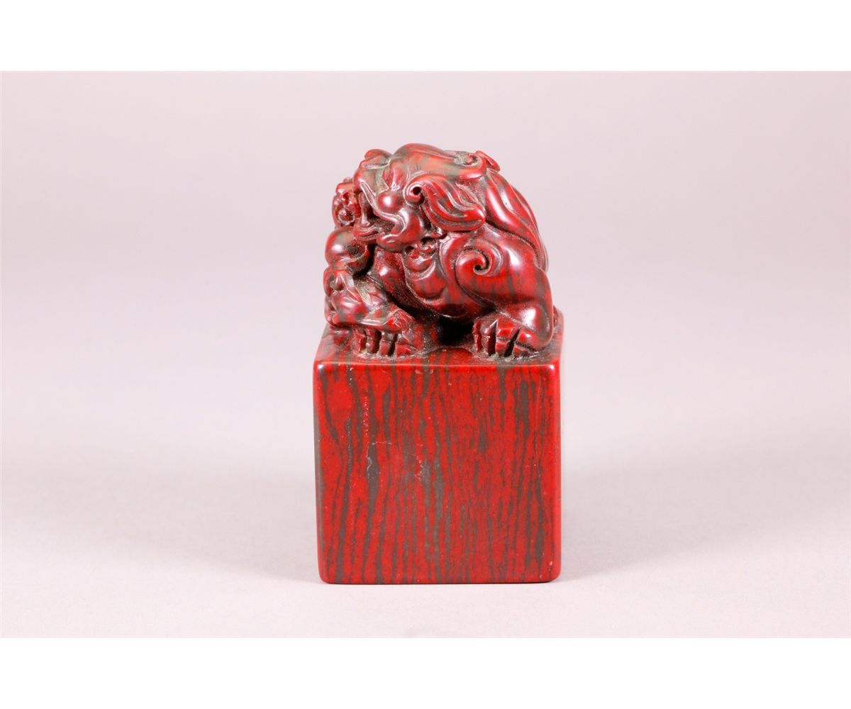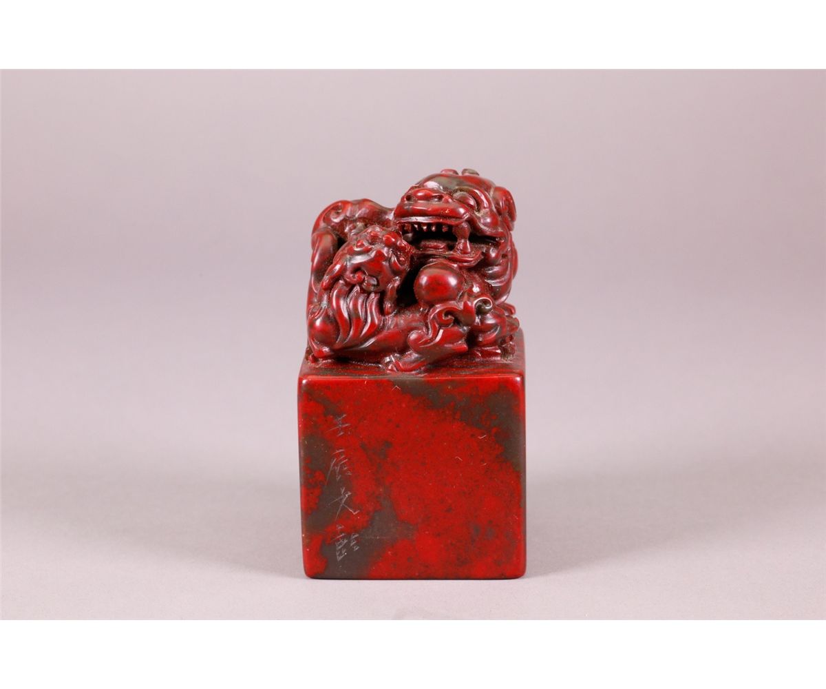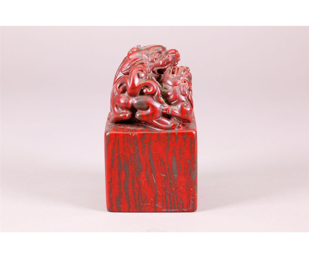 Chinese red blood stone seal; of square form; featuring a mother lion with a baby lion on top; mark on side; carved bottom; of red tone with grey suffusions; H: 10 cm, W: 6 cm, 637 grams