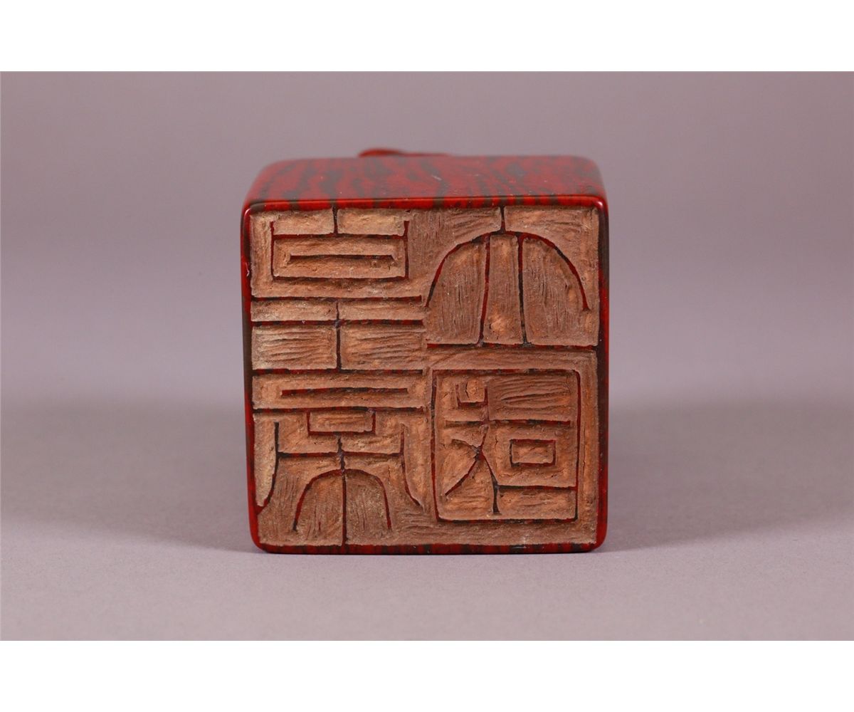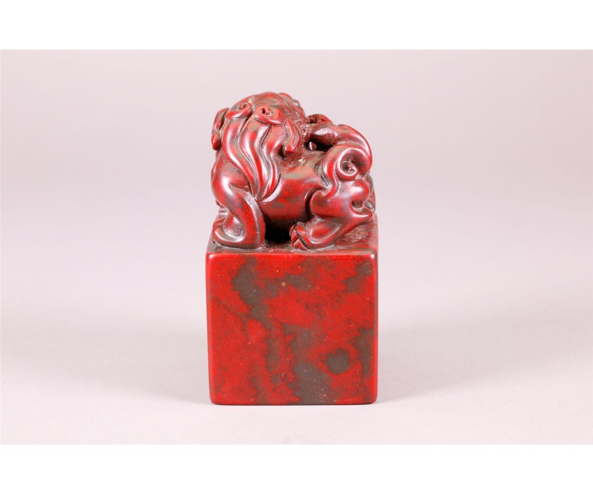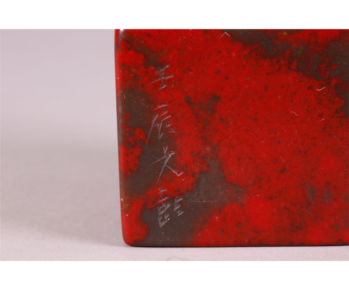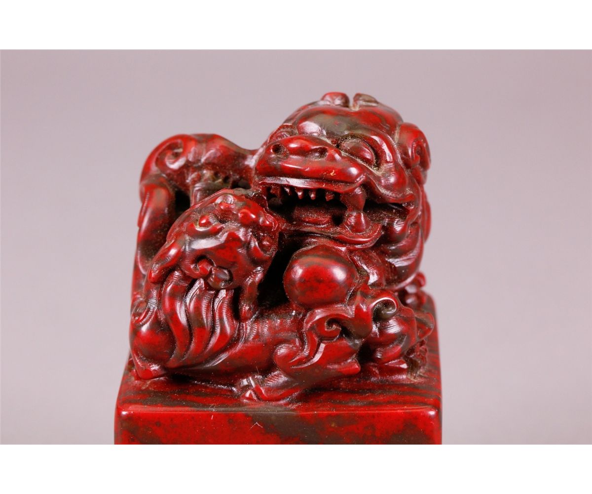 Chinese red blood stone seal; of square form; featuring a mother lion with a baby lion on top; mark on side; carved bottom; of red tone with grey suffusions; H: 10 cm, W: 6 cm, 637 grams