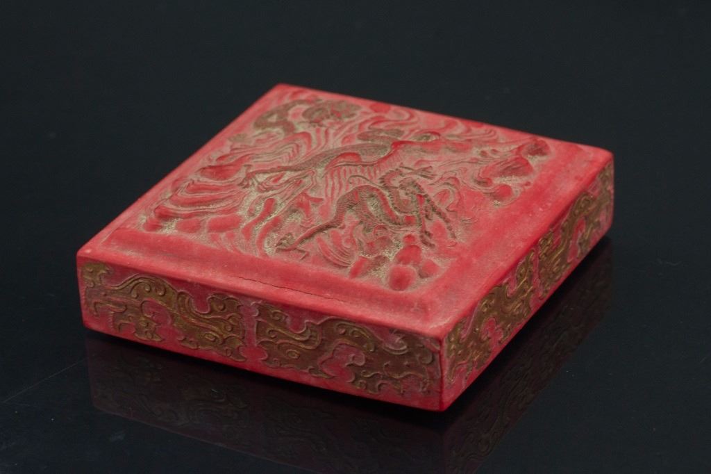 Chinese red stone seal; of flatten square shape; with low relief dragon pattern on top; abstract beast pattern on exterior body; four characters on base; H: 2.8 cm, W: 8.5 cm, L: 8.5 cm, 336 grams