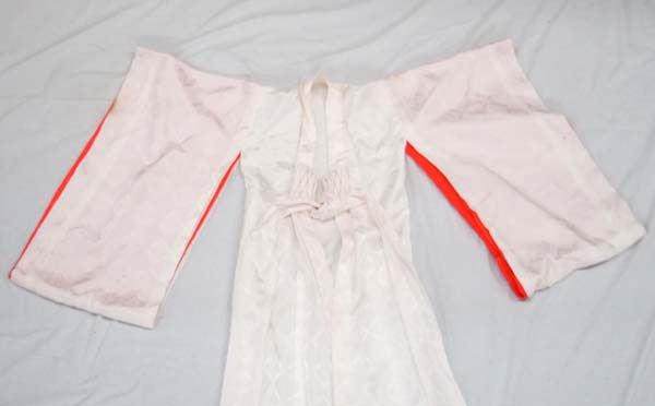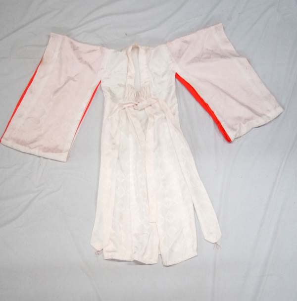 Chinese Red & White Silk Kimono. This piece has delicate bird designs and a shoulder to shoulder measurement of 14 1/2''. Chest measures 24'' and it is 36'' from center back to hem. Has one quarter size spot.