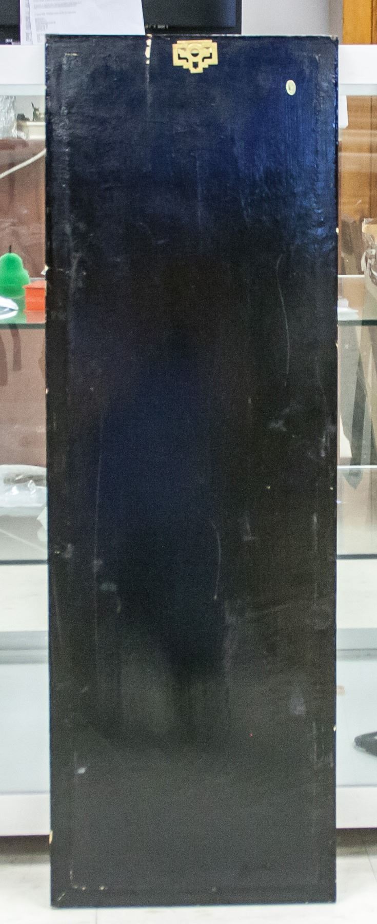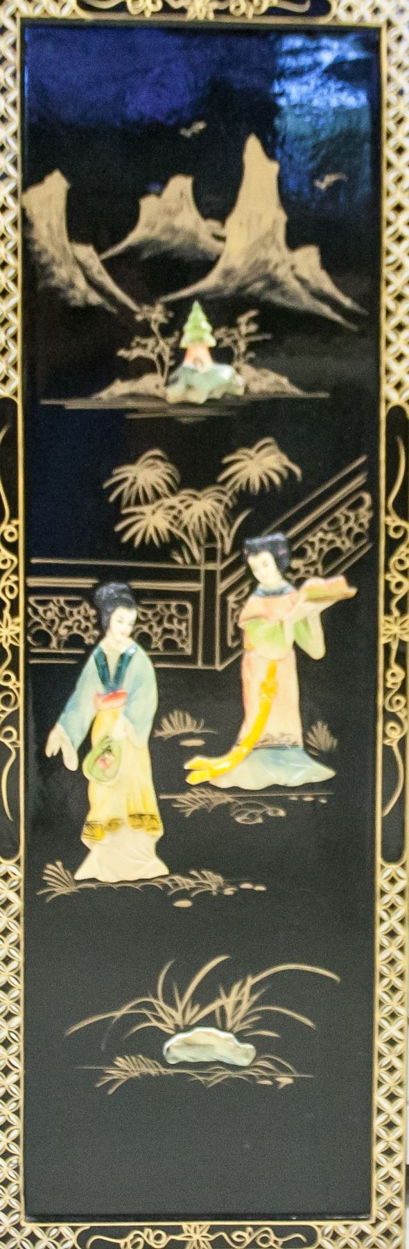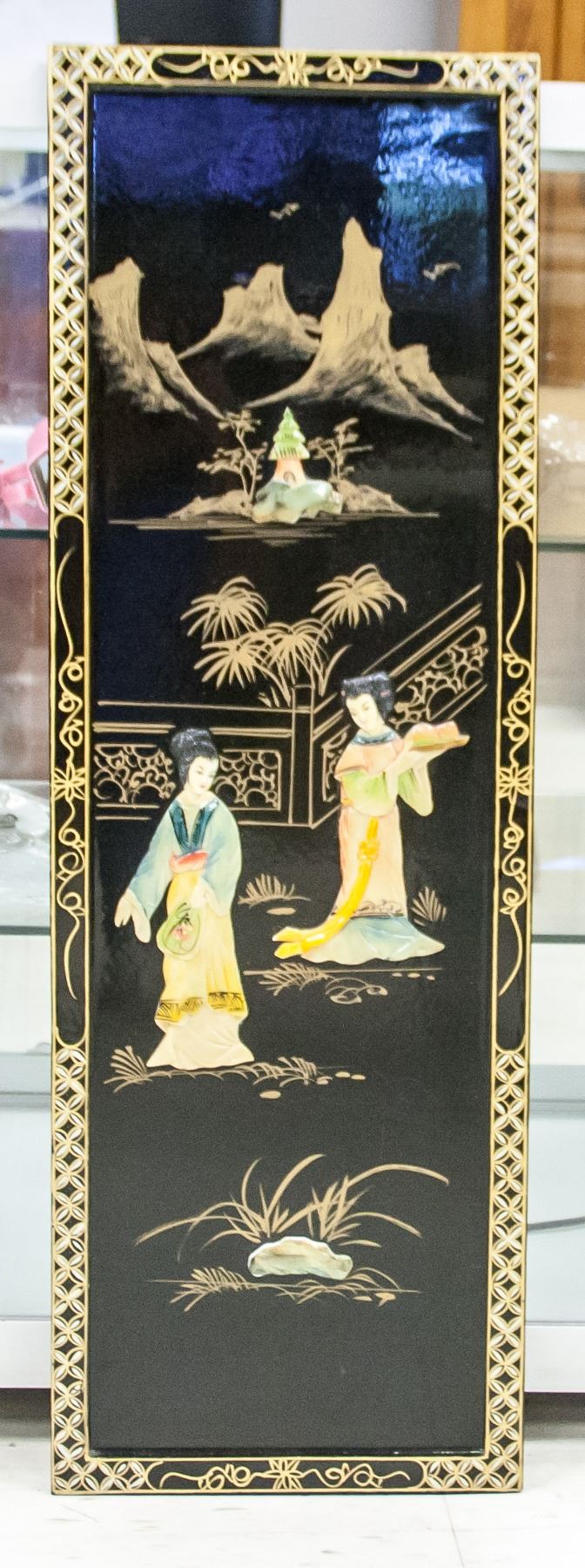 Chinese Republic lacquer wood panel, of rectangle shape, set with stone carving of beauties, decorated with geometric pattern on edge, 91 x 30.5 cm