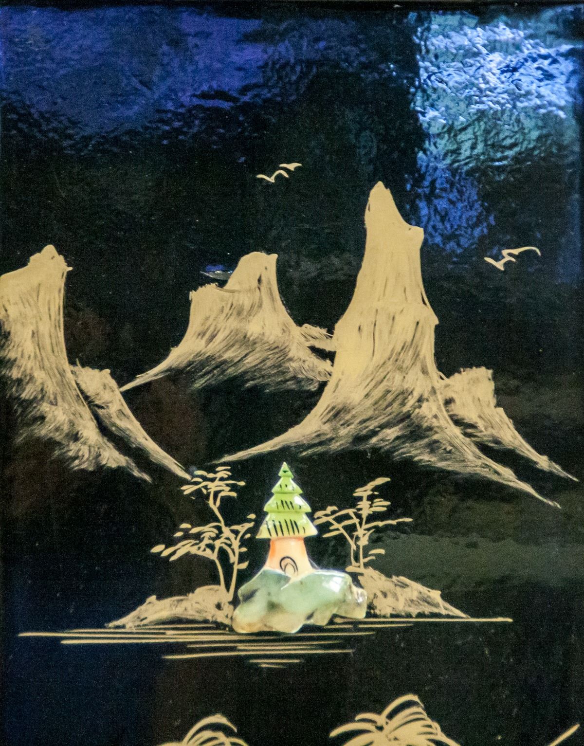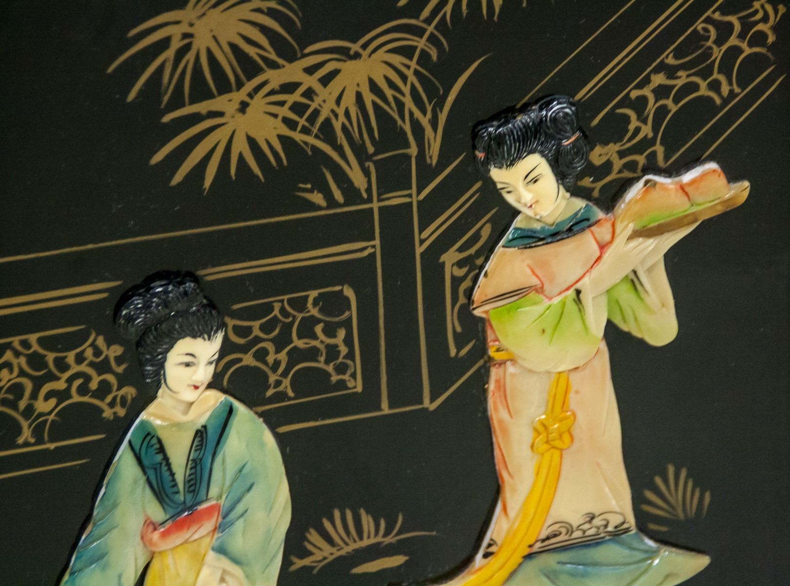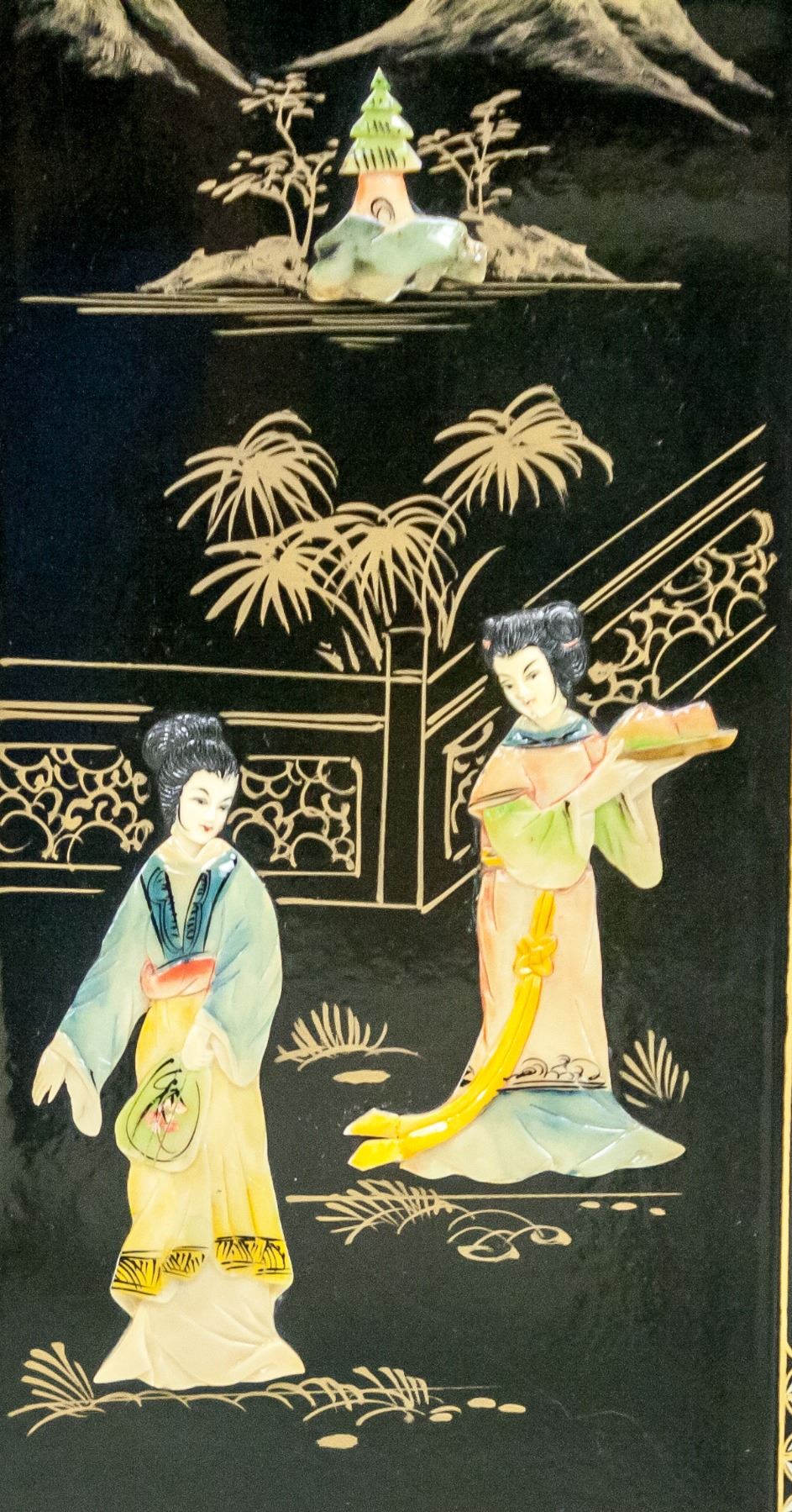 Chinese Republic lacquer wood panel, of rectangle shape, set with stone carving of beauties, decorated with geometric pattern on edge, 91 x 30.5 cm