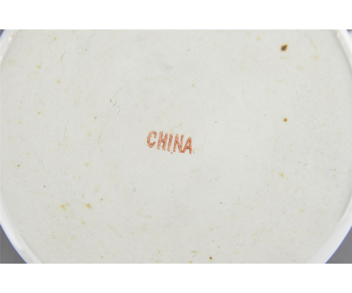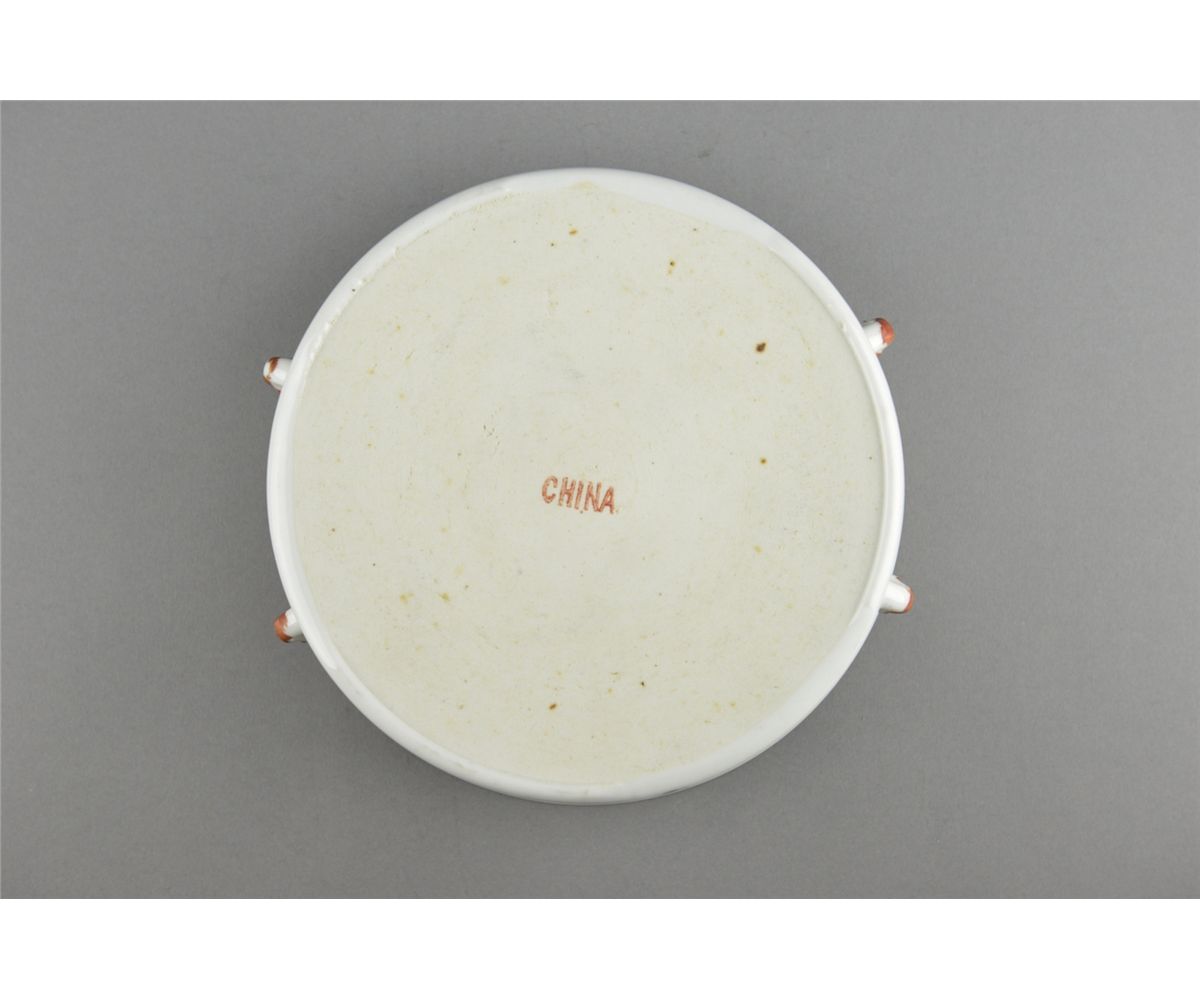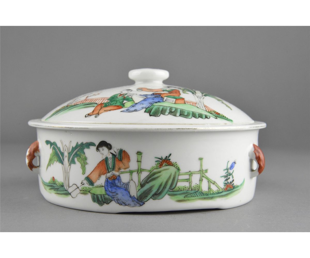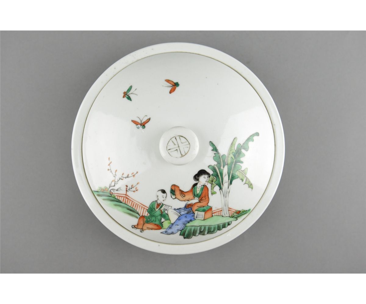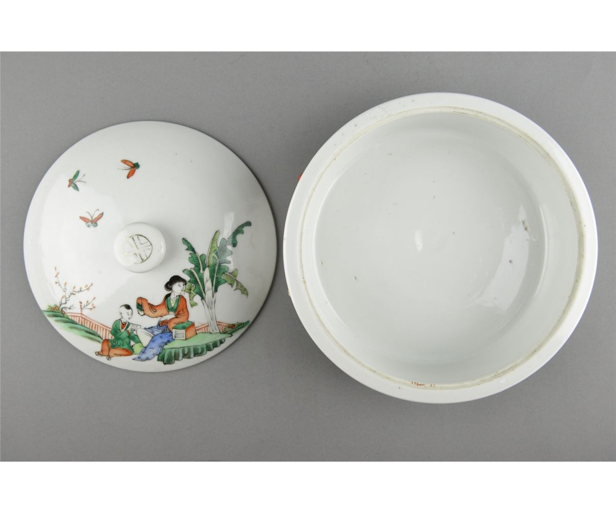Chinese Republic Period Famille Rose enameled porcelain bowl, with lid; cylindrical body featuring figural scene; Marked CHINA on base; D: 17 cm, H: 8 cm