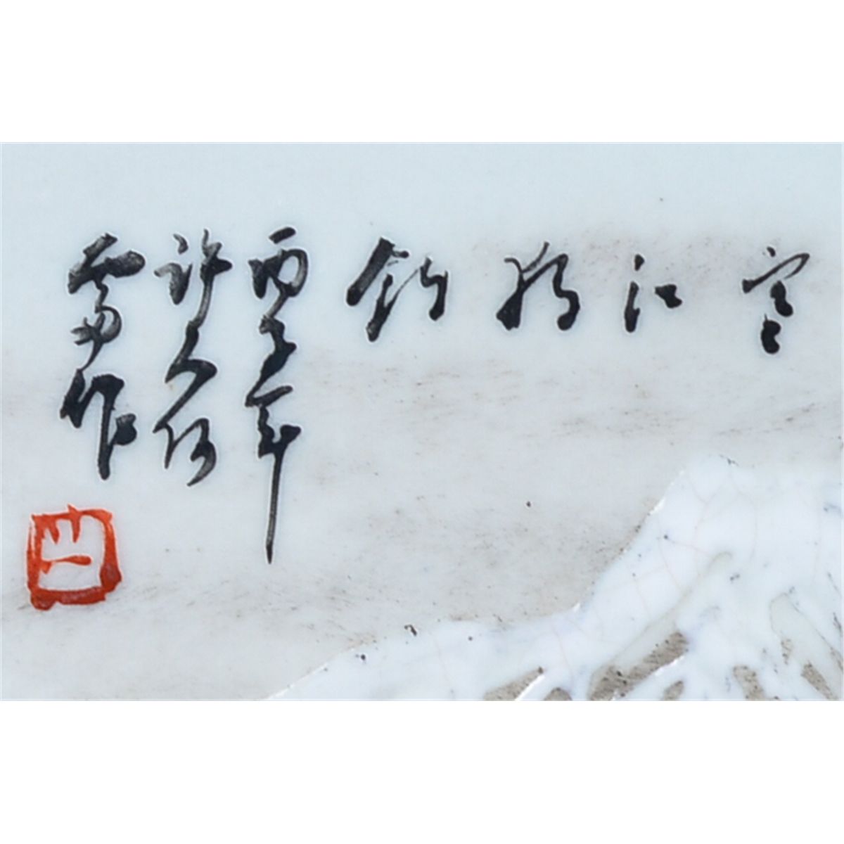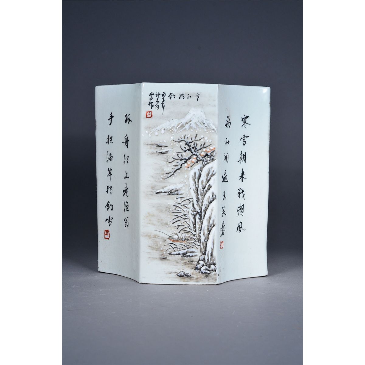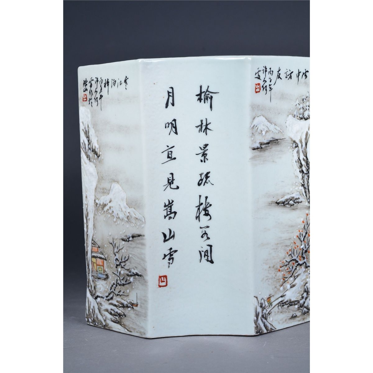 Chinese Republic Period Bi Tong brush pot: eight-paneled body featuring winter landscape scene; four-character Mark on base; H: 16 cm, L: 14 cm