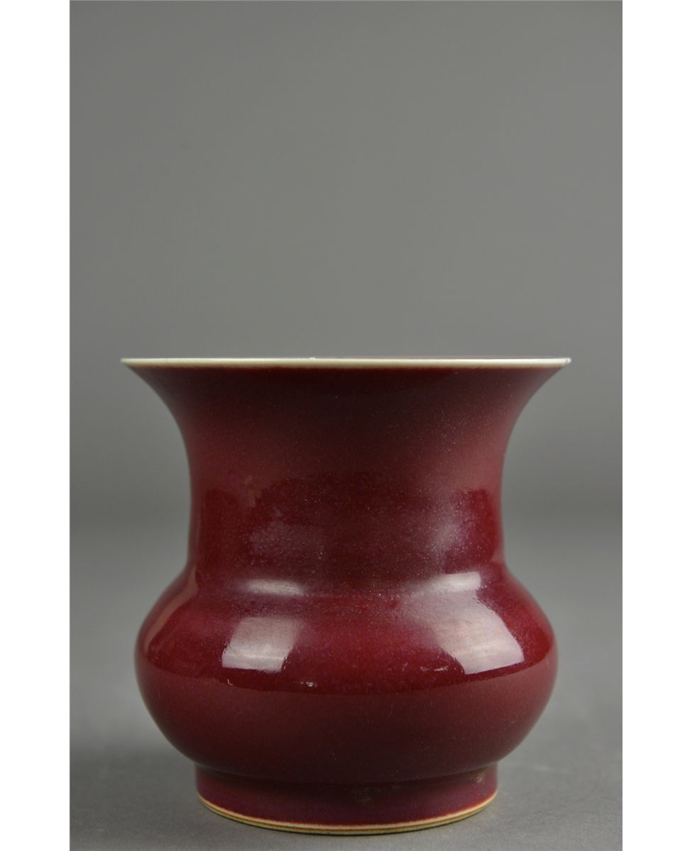 Chinese Republic Period Red Flambe glazed porcelain vase; ovoid body with flared rim, supported on short foot rim; (small chips on rim); six-character Mark on base; D: 10 cm, H: 10 cm