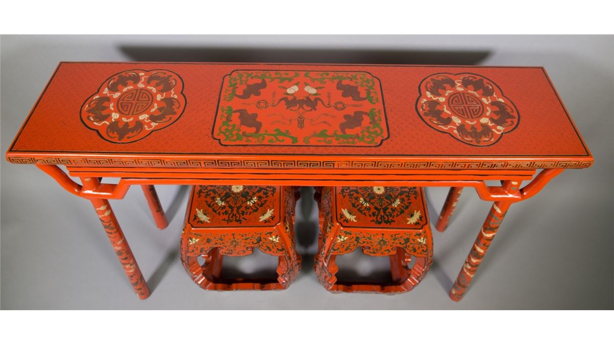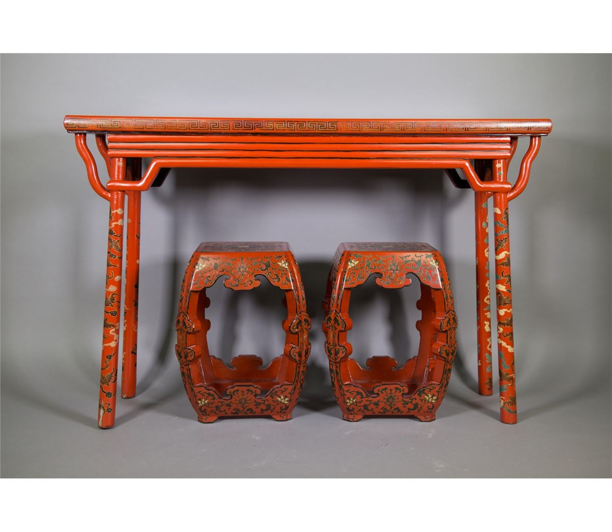 Chinese red lacquer alter table with two stools; supported by four cylindrical legs; with a red lacquer finish; featuring bats and Shou longevity symbol on top panel and legs; the stools of barrel form; supported on four curved legs; featuring chrysanthemum; Republic period; Provenance: Chang Estate; H: 82 cm, W: 30 cm, L: 123 cm (Table) H: 48 cm, W: 24 cm, L: 24 cm (Stools)