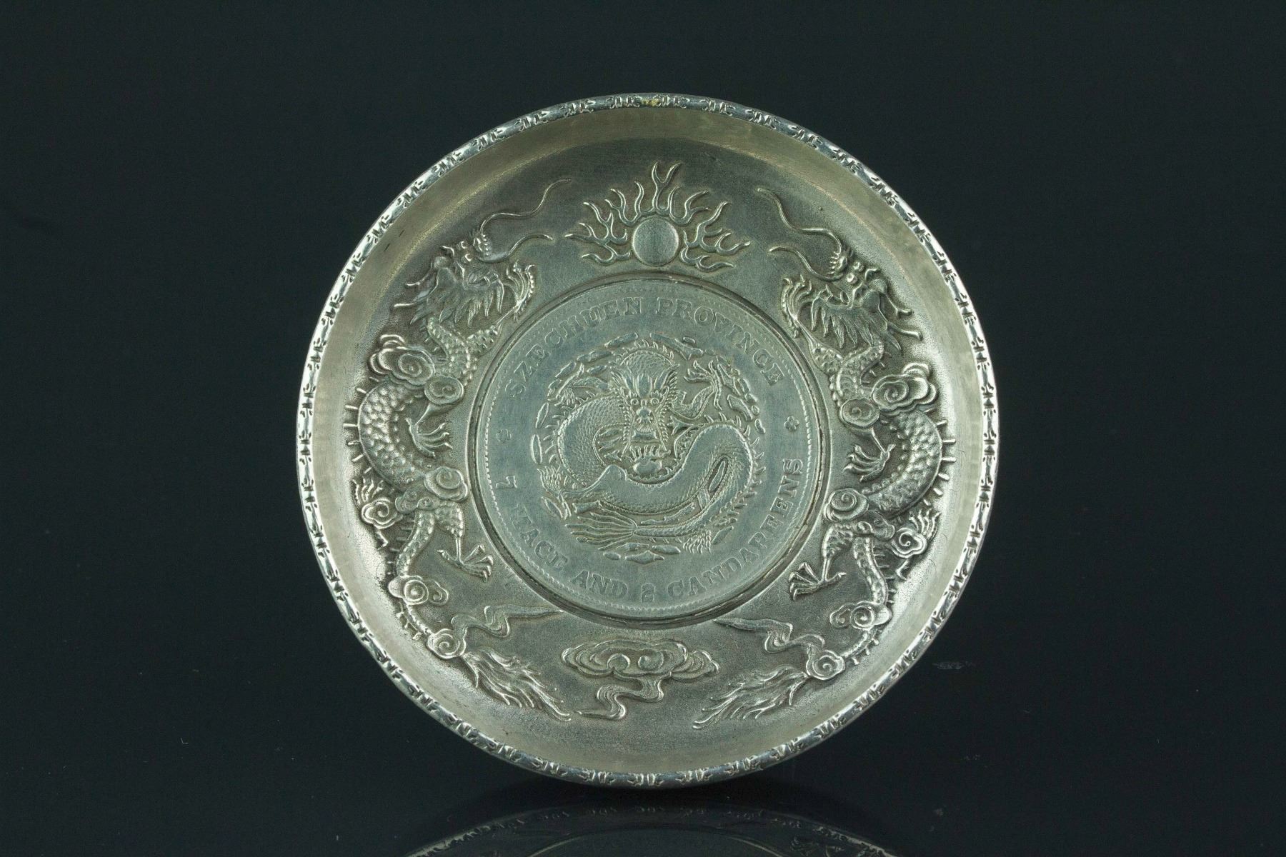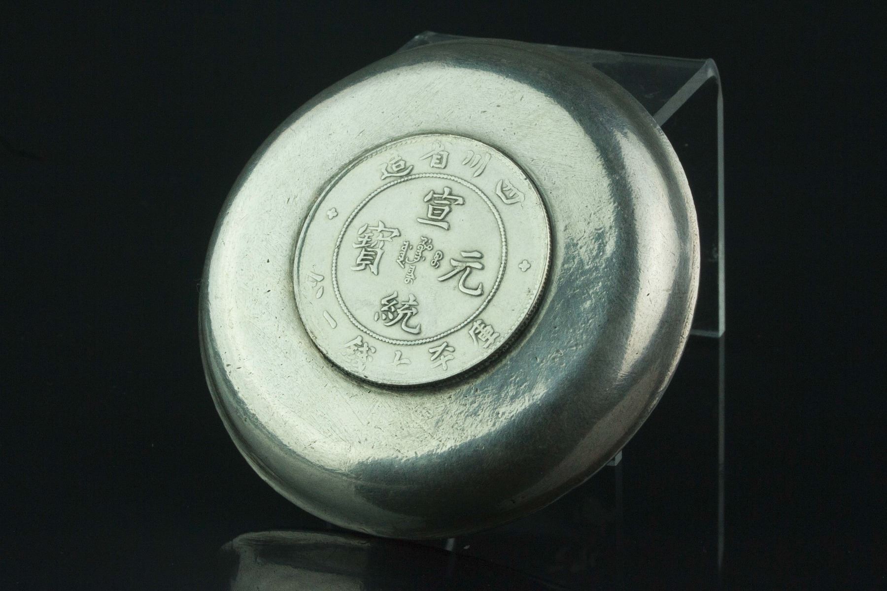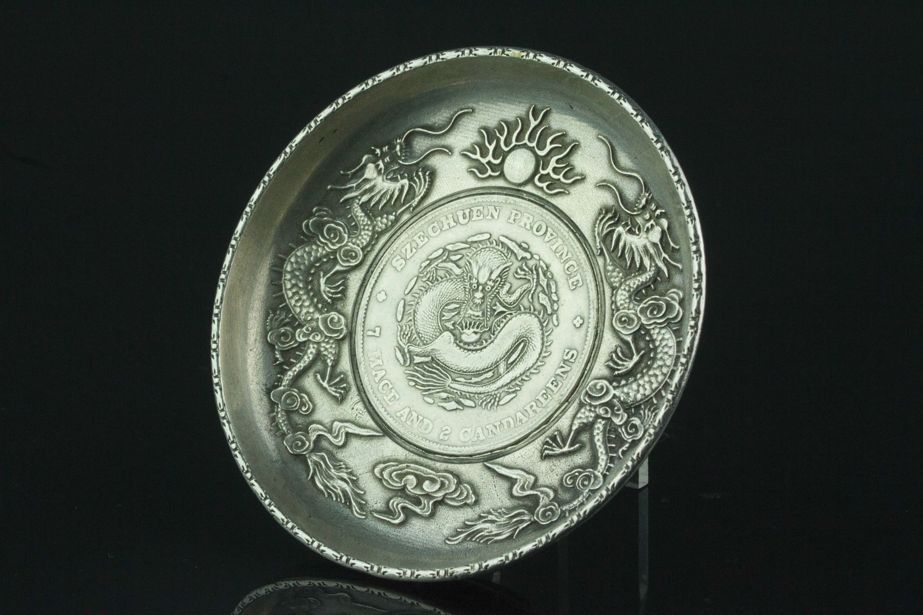 Chinese Republic silver coin with matching tray; the Xuan Tong Yuan Bao coin with Szechuen Province and 7 Mace And 2 Candareens mark; H: 1 cm, D: 8 cm, 84 grams