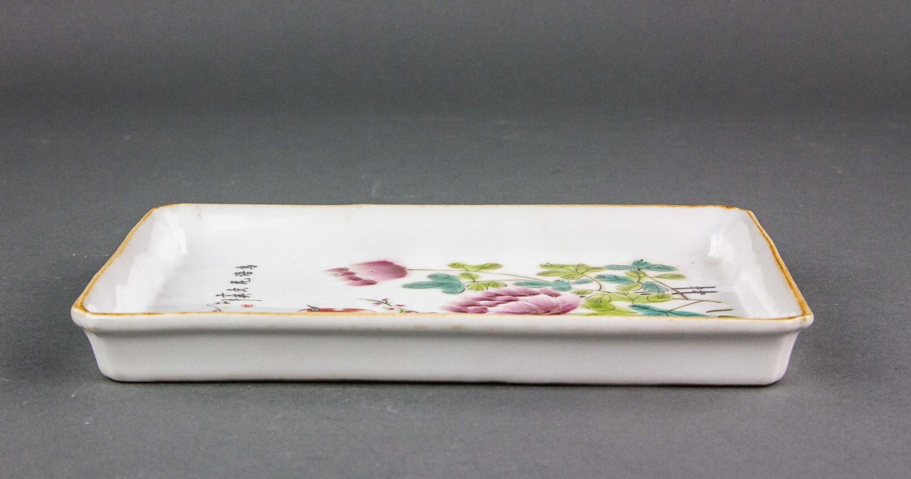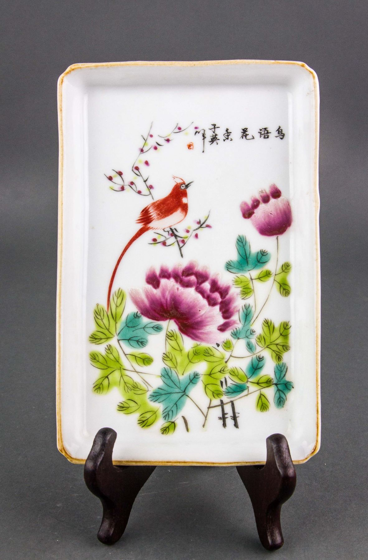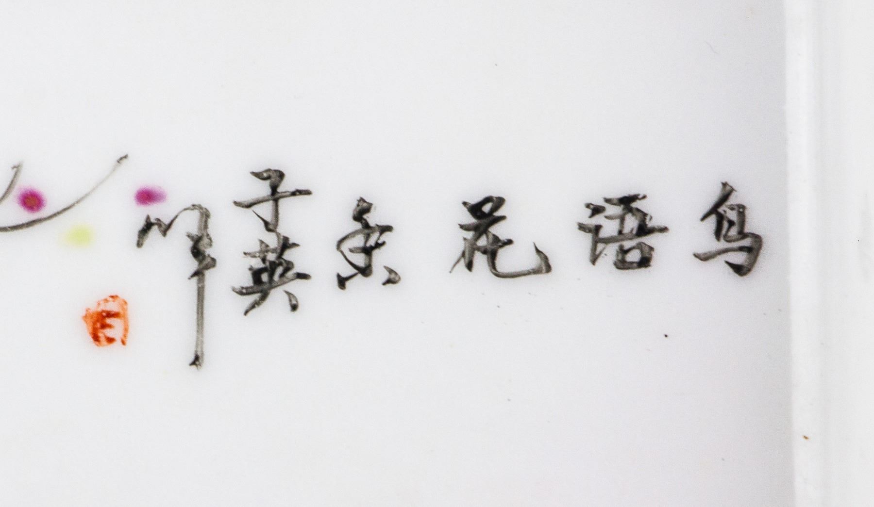 Chinese Republic square famille rose porcelain saucer; painted with birds and flowers; signed Zi Ying; inscribed with one artist seal; H: 2.5 cm, W: 13.5 cm, L: 19.5 cm, 327 grams
