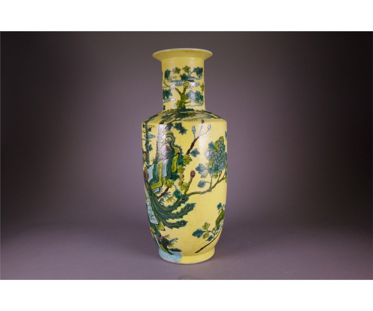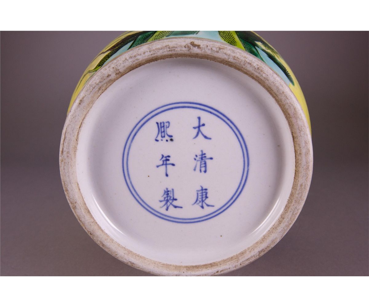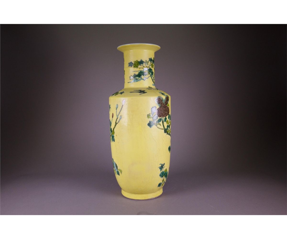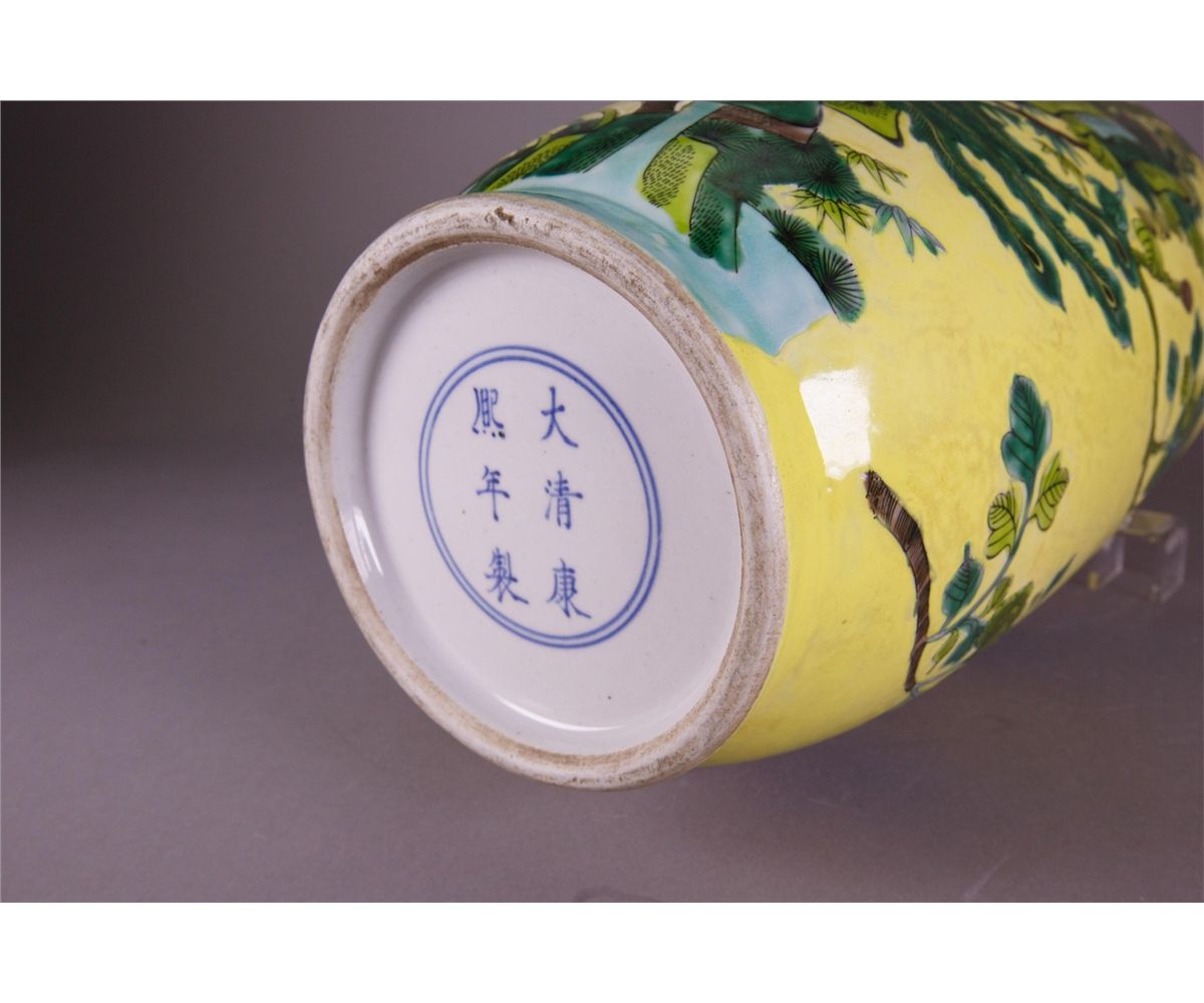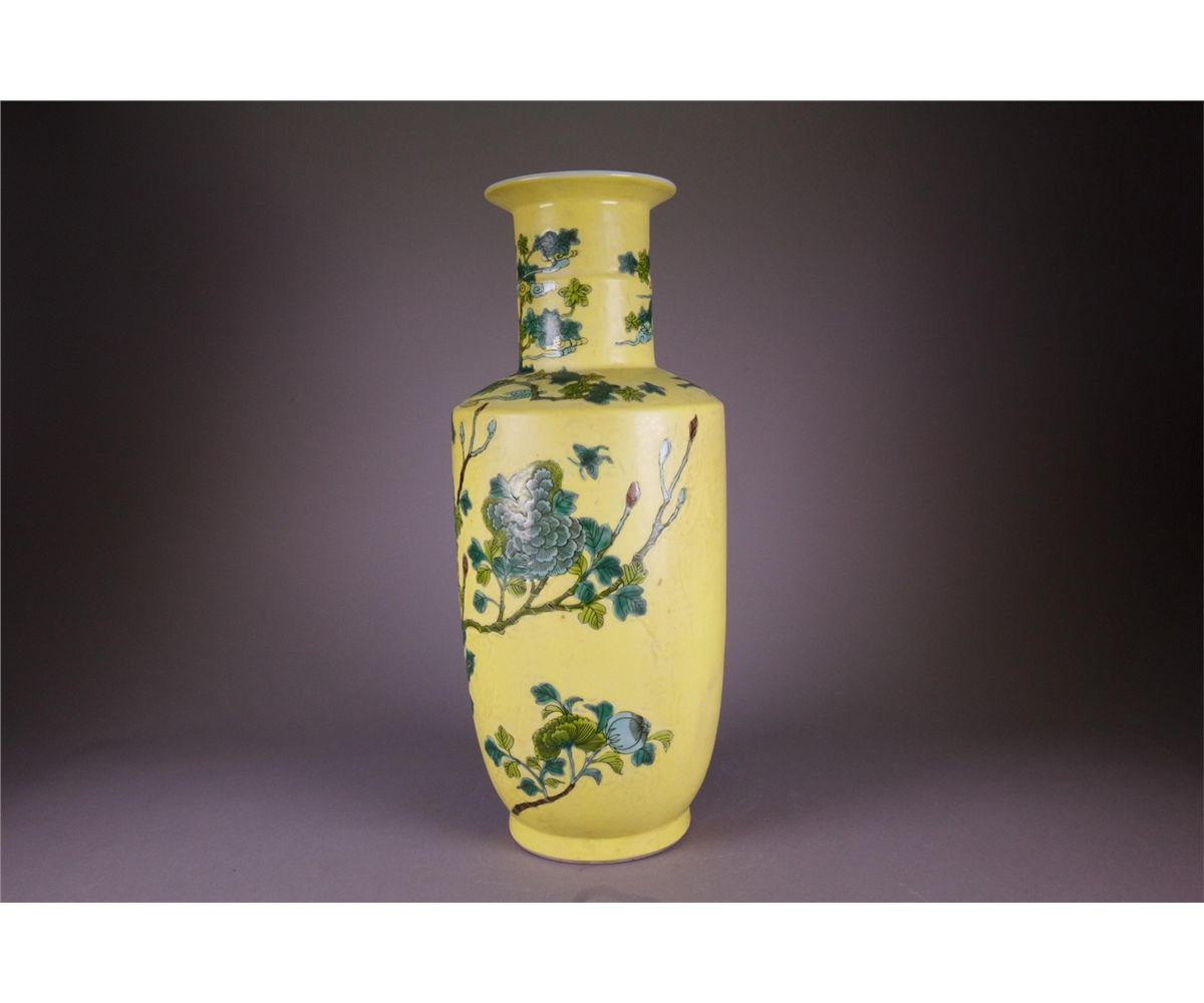 Chinese republic yellow glazed porcelain rouleaux vase; featuring green glazed flowers and birds on yellow ground; six-character Qing Kangxi mark with double circle on base; H: 44 cm, D: 21 cm, 2856 grams