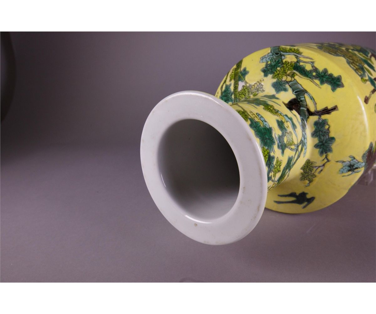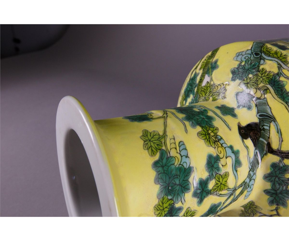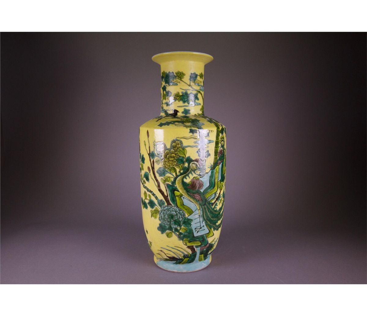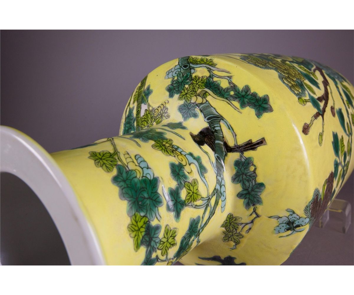Chinese republic yellow glazed porcelain rouleaux vase; featuring green glazed flowers and birds on yellow ground; six-character Qing Kangxi mark with double circle on base; H: 44 cm, D: 21 cm, 2856 grams