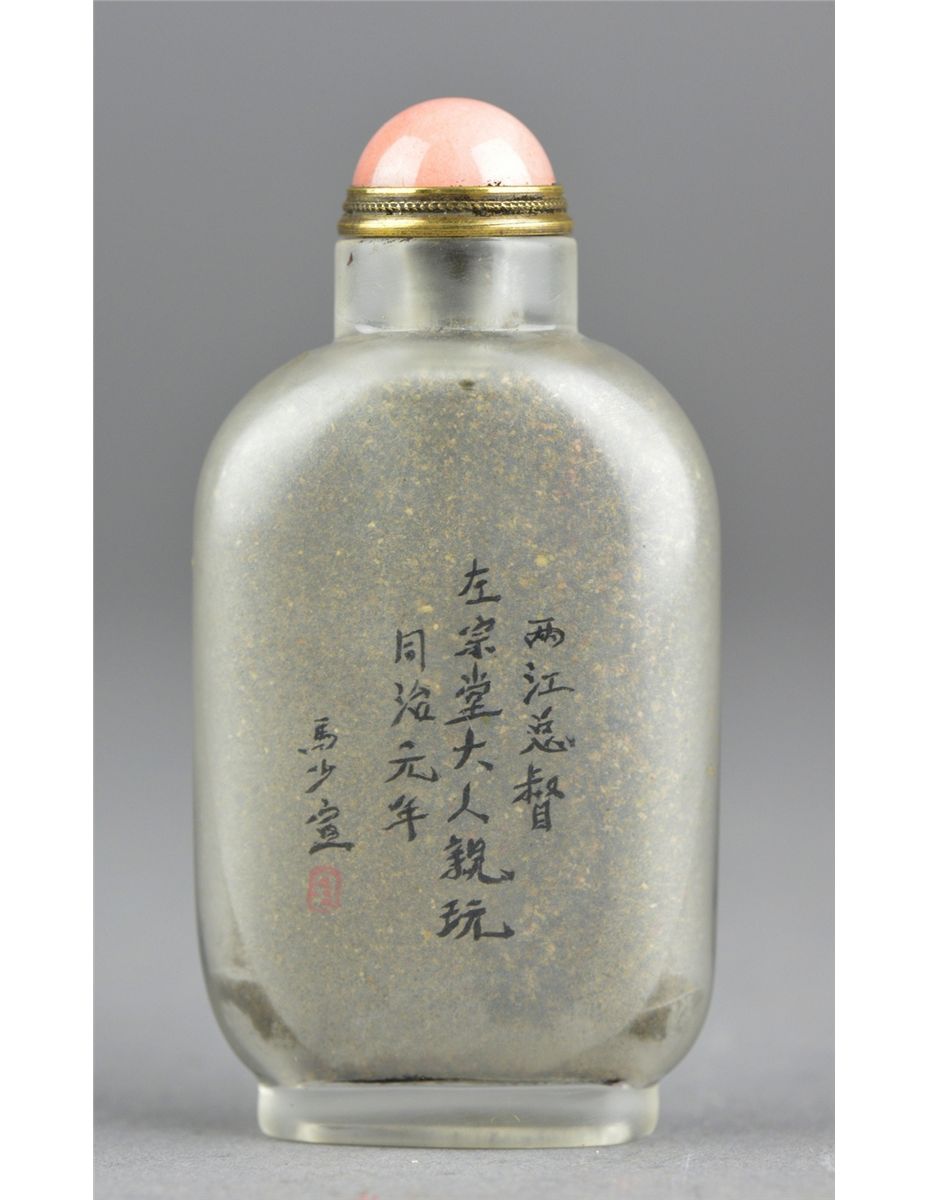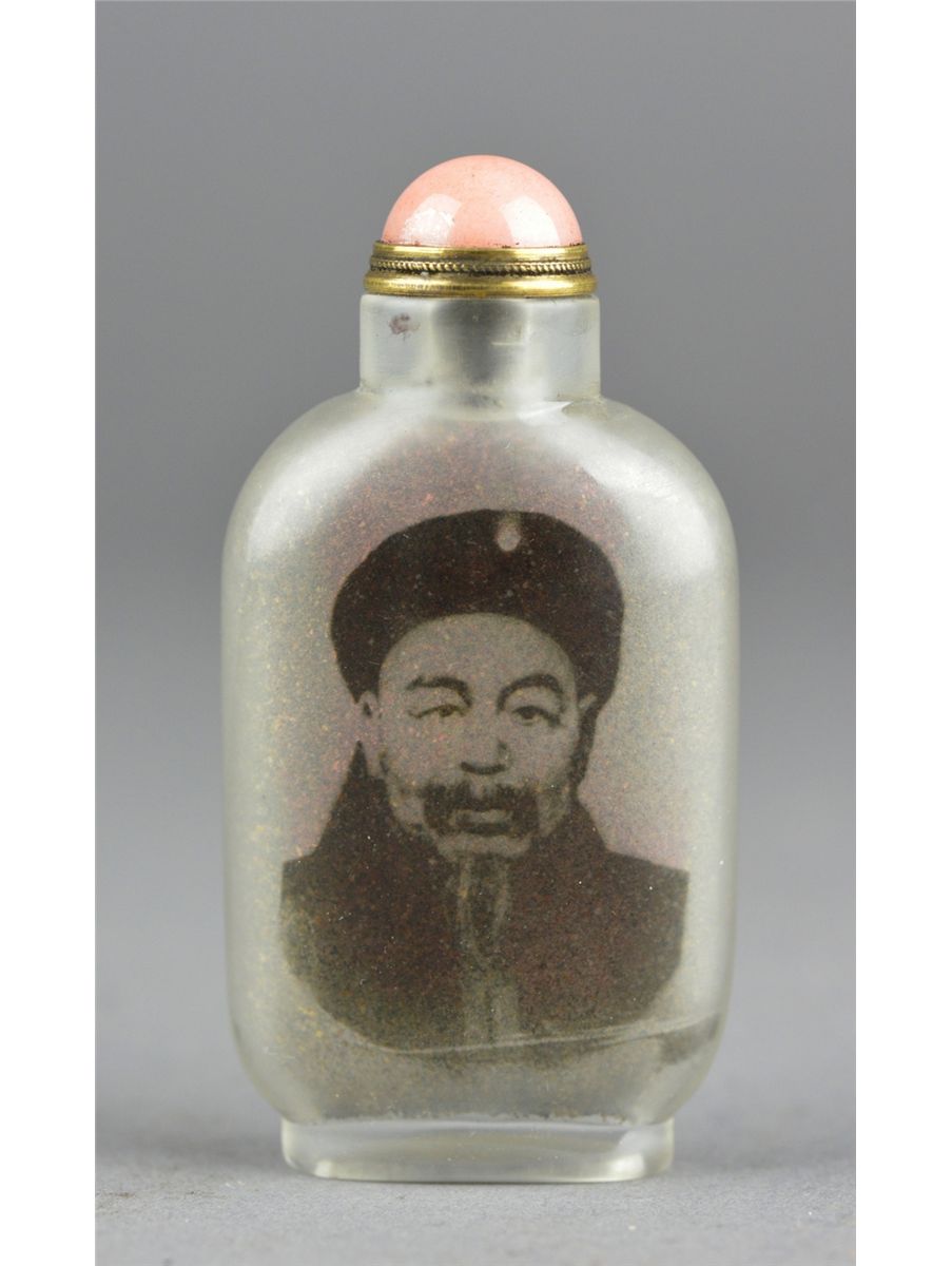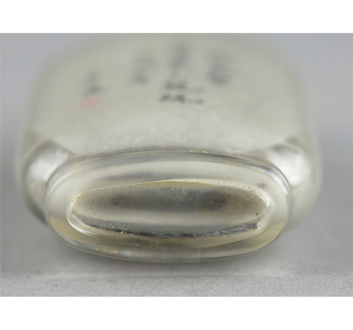 Chinese glass snuff bottle; featuring reverse painted interior image and signed; H: 8.5 cm, W: 4.25 cm