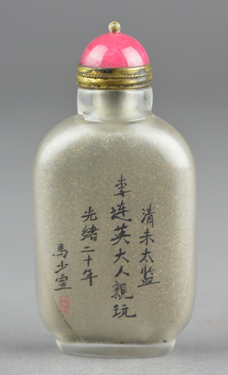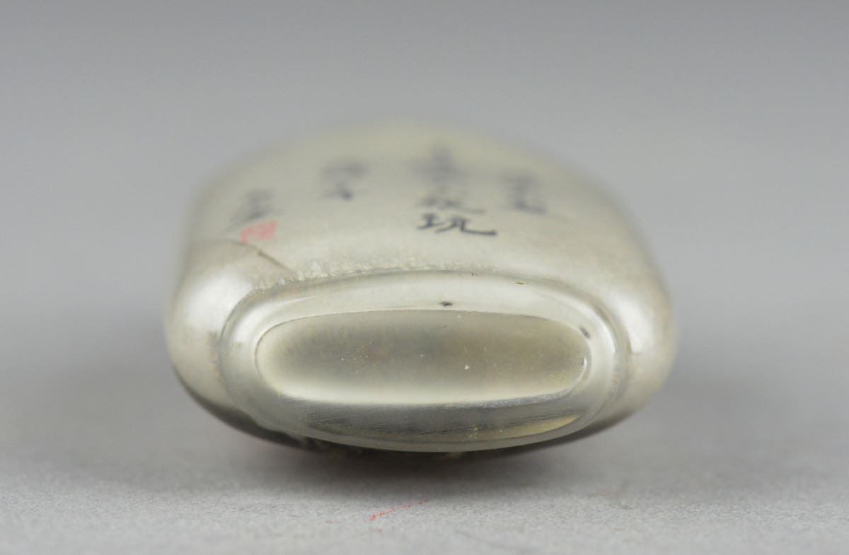 Chinese glass snuff bottle; featuring reverse painted image and signed; H: 8.5 cm, W: 4.25 cm