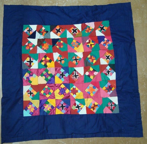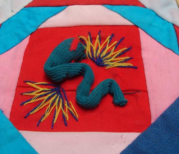 Chinese Reversible Quilt. Side One is appliqued with raised critters, scorpions, spiders, snakes, dragonflies. Three are missing. The center has two birds, a frog and bears. Side two is more of the traditional style quilt blocks. Beautiful colors. Machine stitched. 34'' x 36''