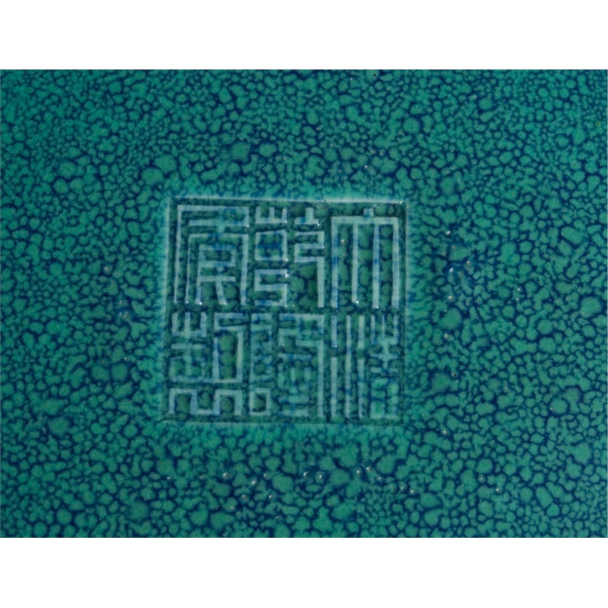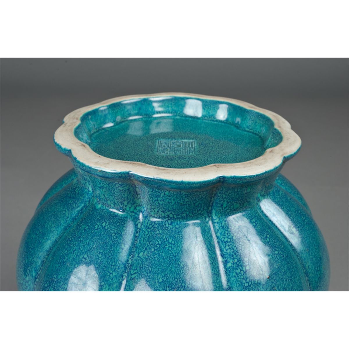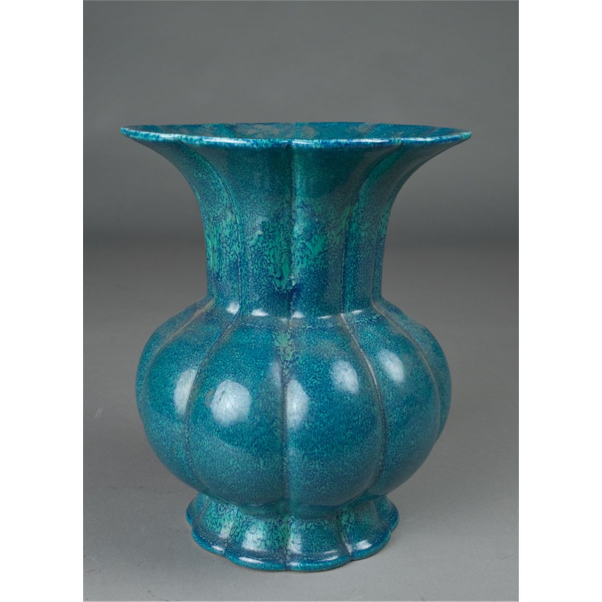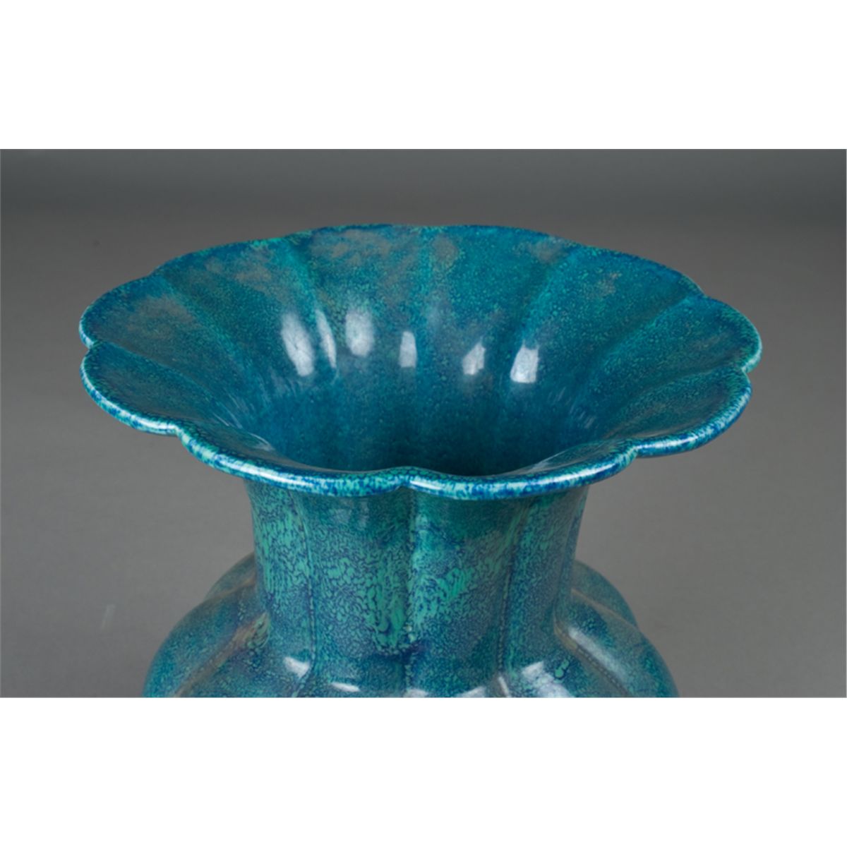 Scalloped form vase on foot glazed with blue and spattered robin egg blue. 10" H x 8" W, impressed with six character mark for great Qianlong Production on underside. 20th Century. Private collection Toronto, Canada.