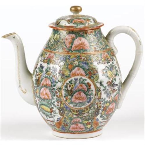 <B>Chinese Rose Medallion Teapot<BR></B></I>Unknown maker<BR>Twentieth Century<BR>The Chinese rose medallion/cabbage leaf covered teapot of ovoid form with an auricular handle and long spout.<BR>Unmarked<BR>7.2 inches high<BR><BR><b>Shipping:</b> Requires 3rd Party Shipping (<a target="_blank" href="http://www.heritageauctions.com/common/shipping.php">view shipping information</a>)