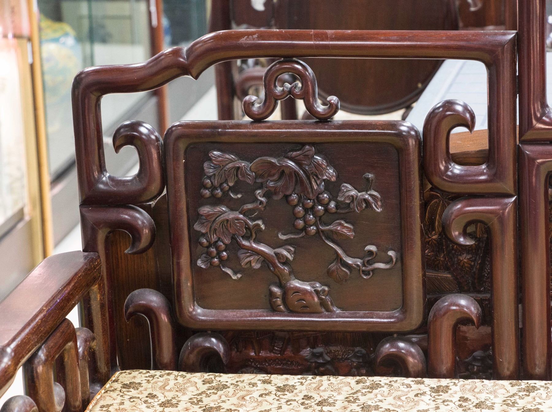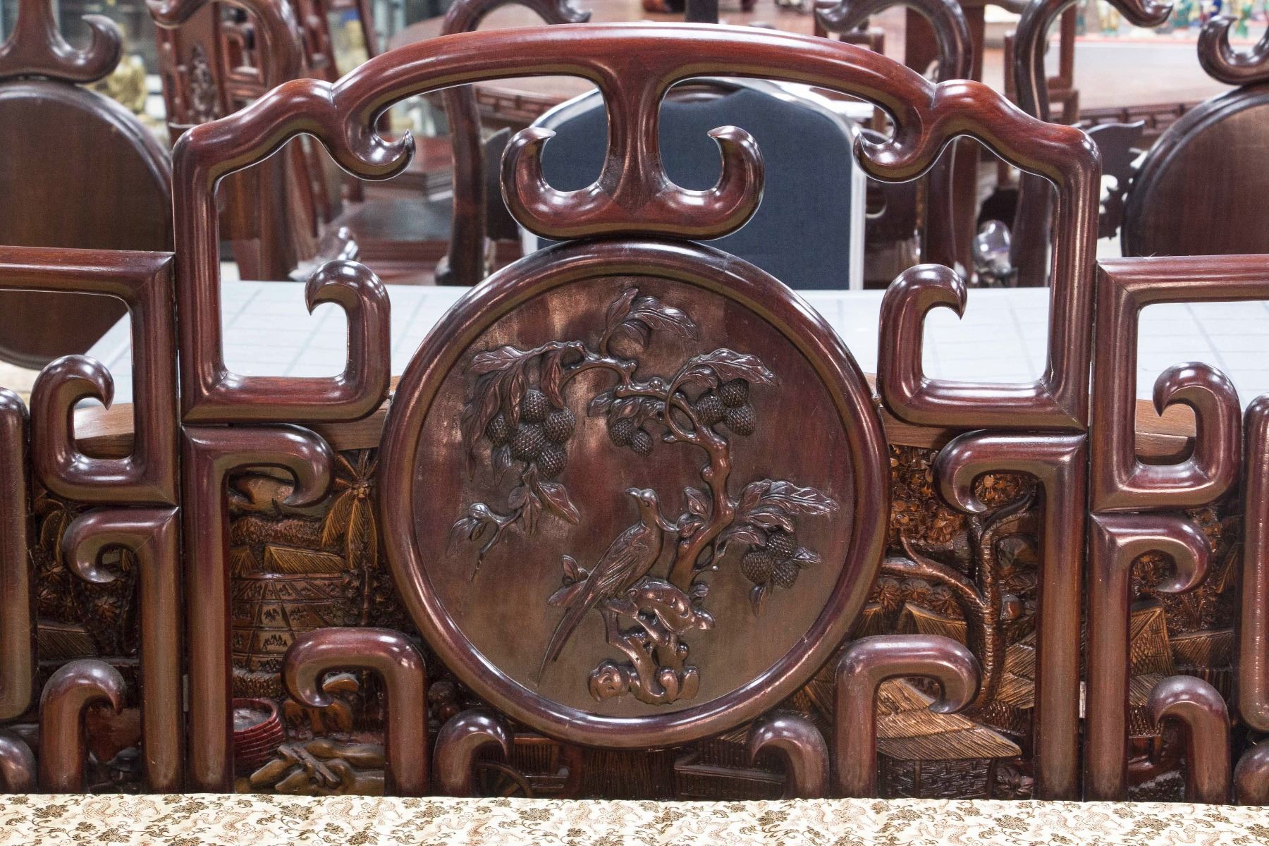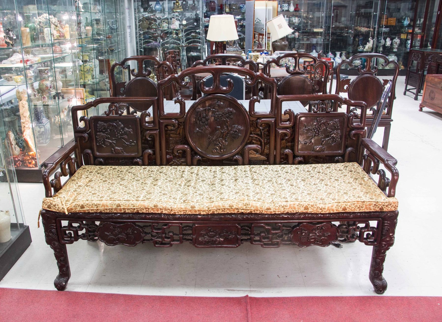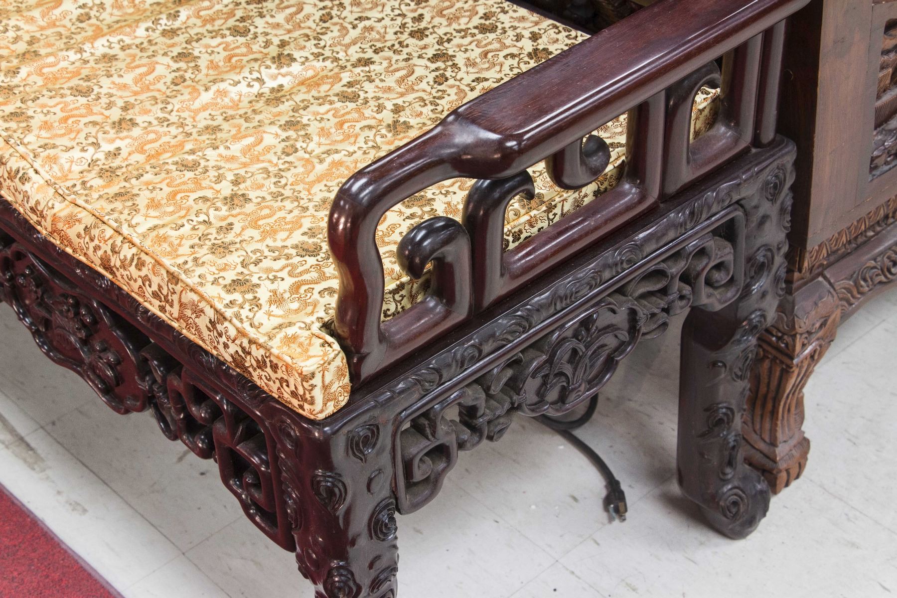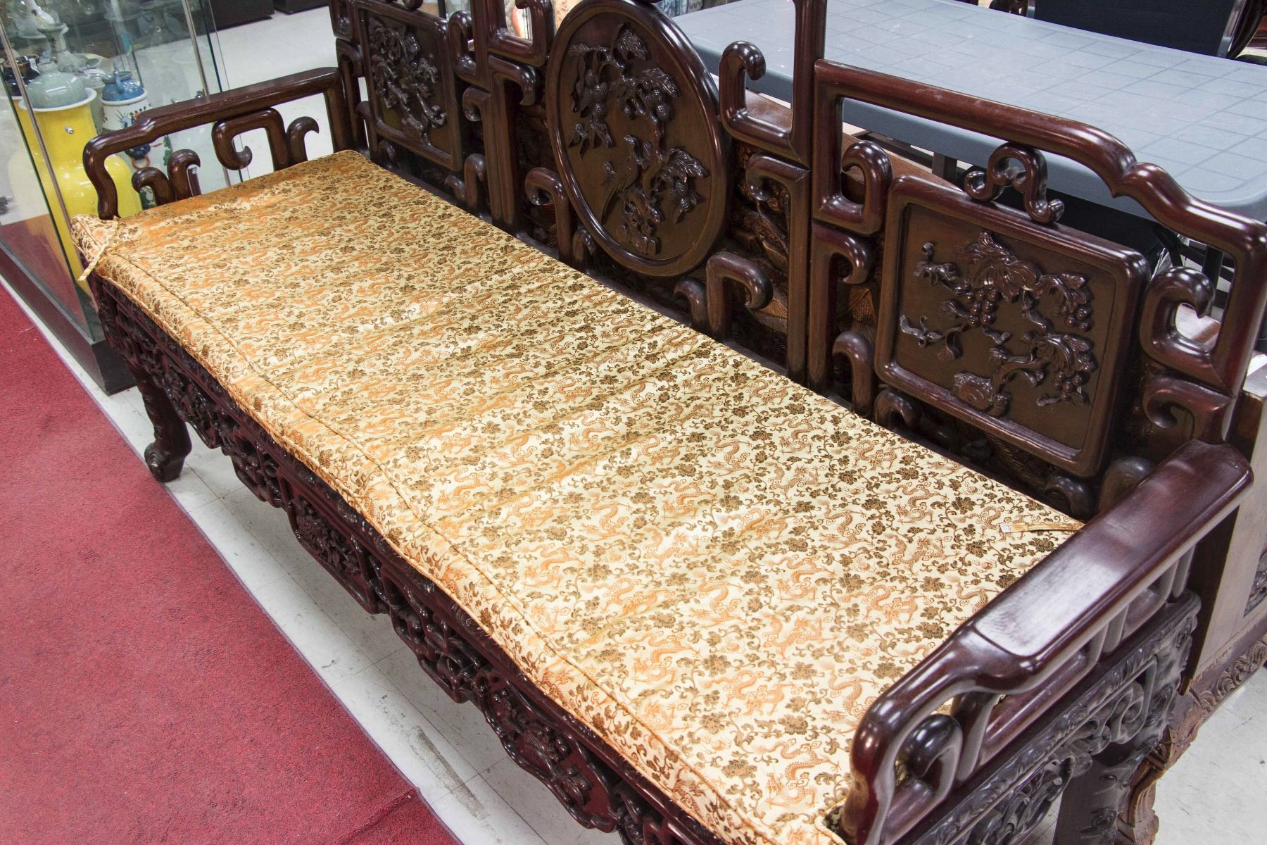Chinese rosewood sofa; decorated with open work carving; backrest with wood flower carving panels; with cushion; 110 cm x 186 cm