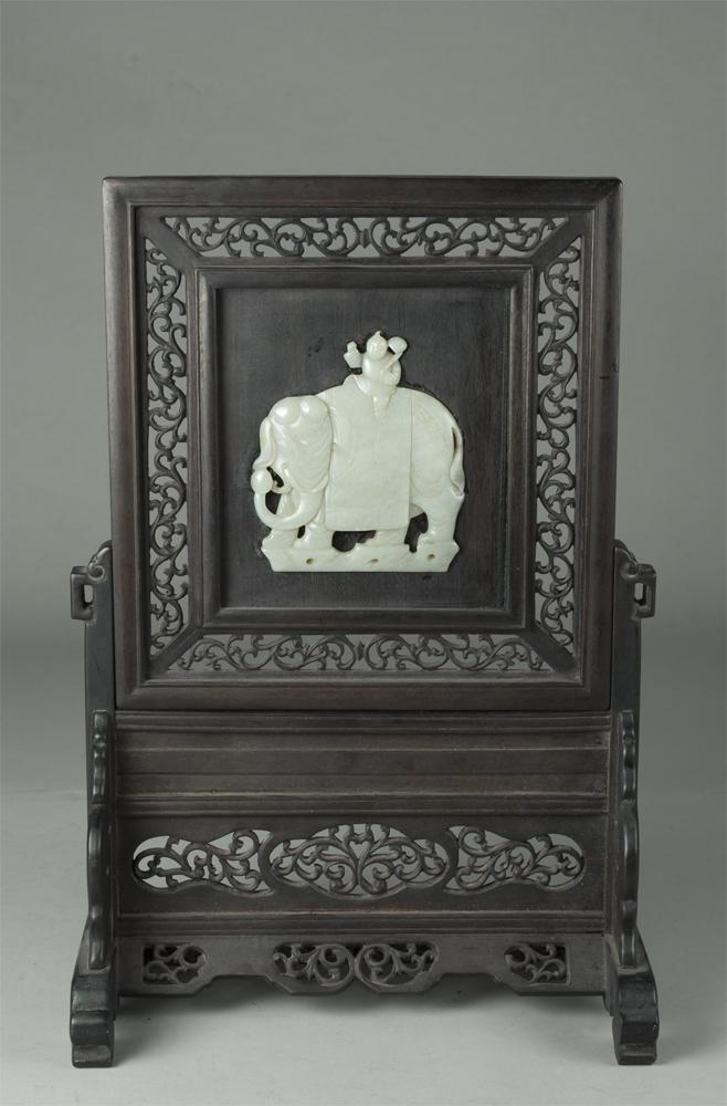 Carved Rosewood table screen with carved inset jade. The jade of pale celadon, finely carved to depict a boy on an elephant holding a sceptre. Framed by rectangular wooden stand of carved openwork scrolling designs. 18.5" H x 12.5" W x 7" D. 19th/20th Century.
