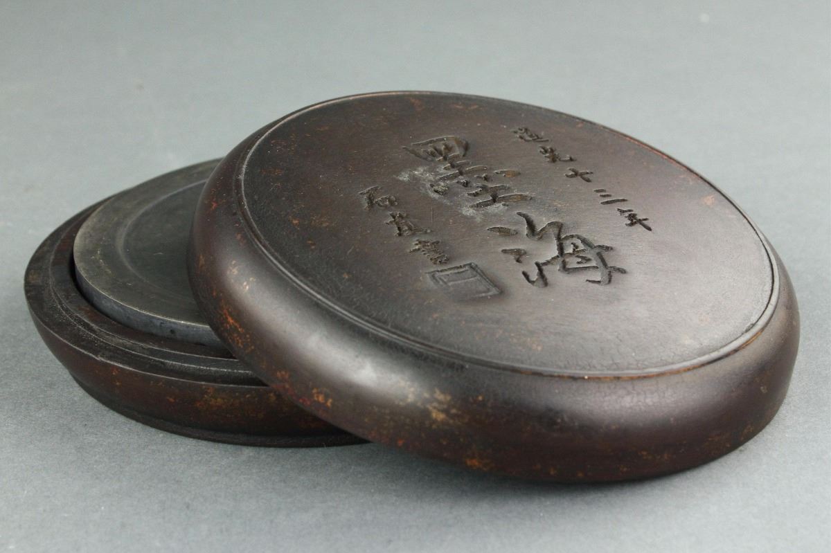 Chinese round ink stone with wood case and cover; Daoguang Thirteen Year mark on cover; five-character Sanyuan Laoren Zhenwan mark on inkstone; H: 5 cm, D: 15 cm, 1066 grams w/case