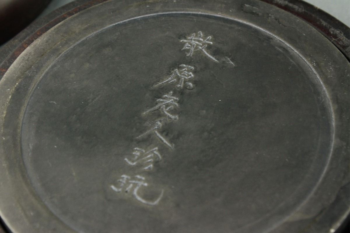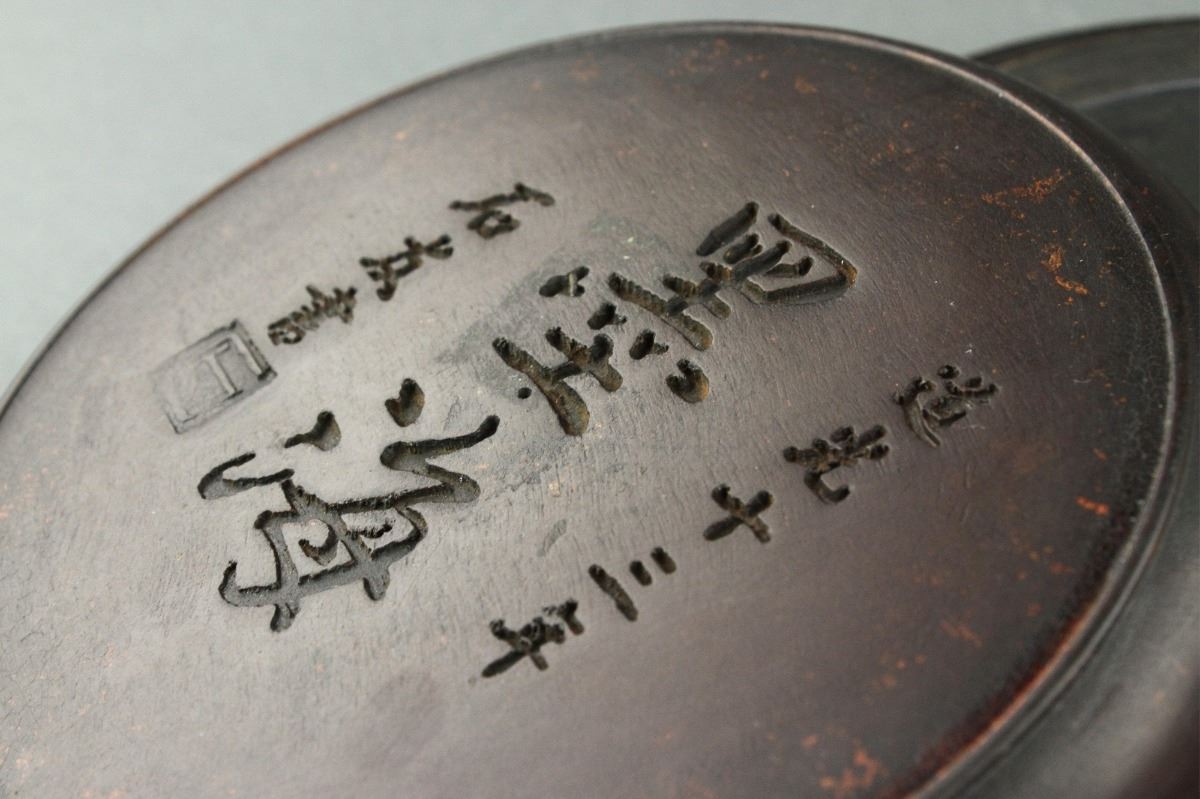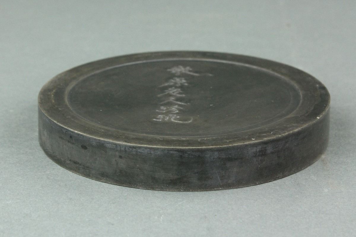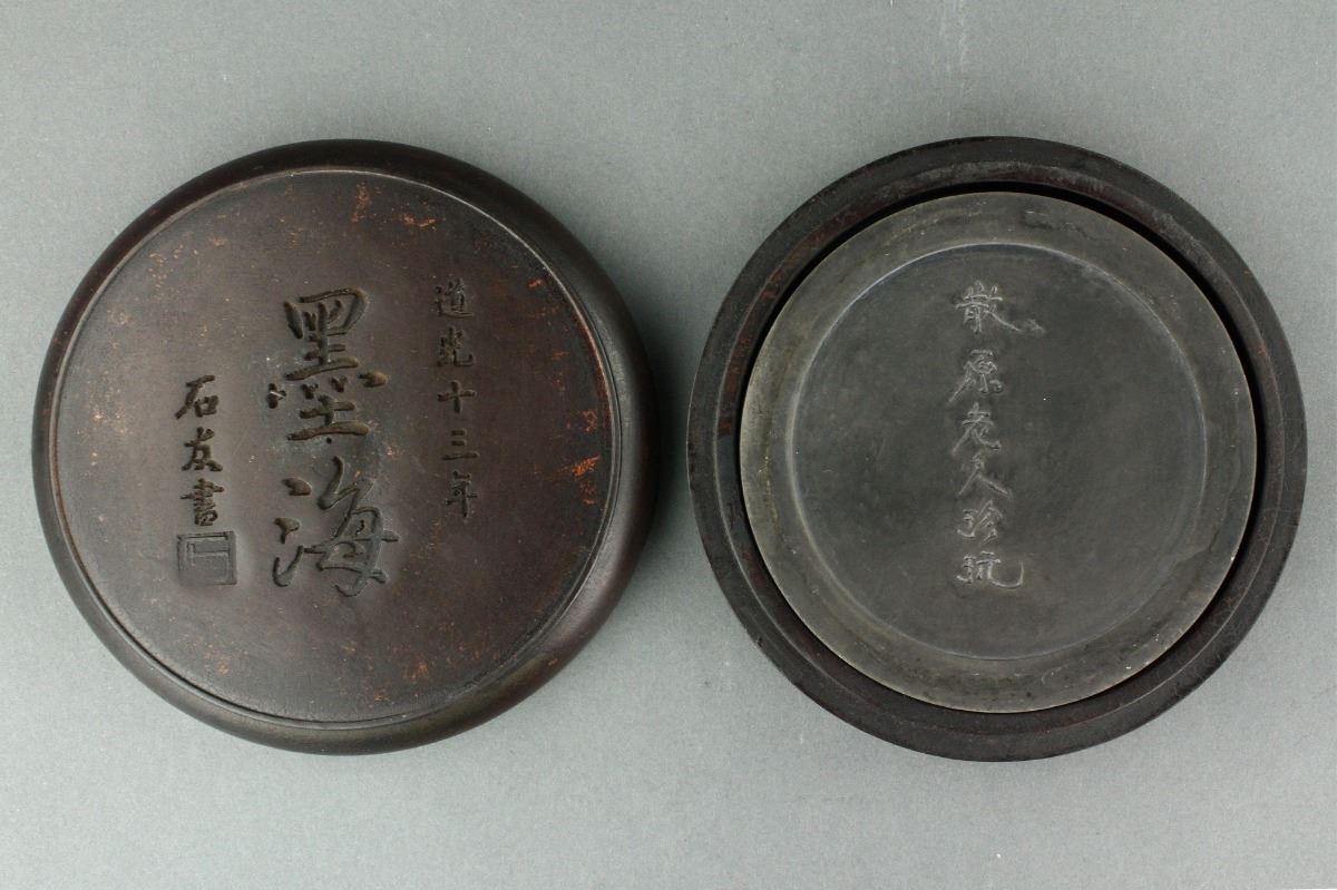 Chinese round ink stone with wood case and cover; Daoguang Thirteen Year mark on cover; five-character Sanyuan Laoren Zhenwan mark on inkstone; H: 5 cm, D: 15 cm, 1066 grams w/case