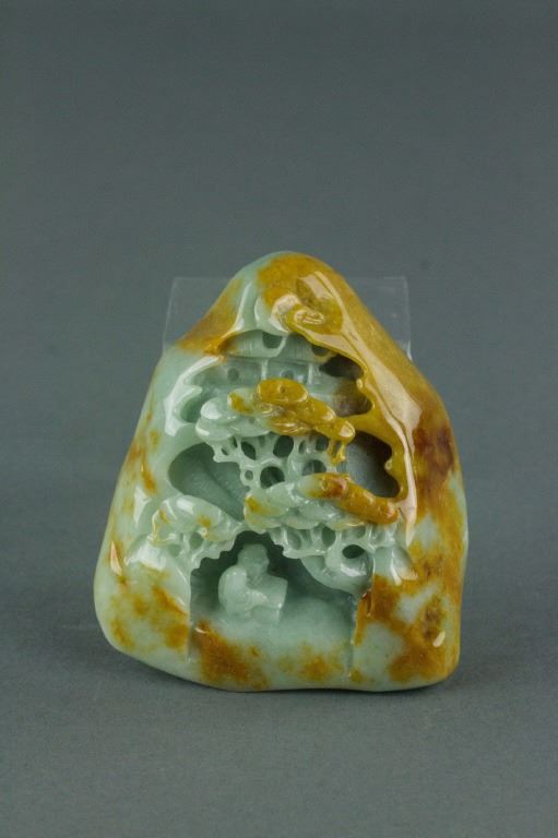 Chinese jadeite boulder; carved in high relief with an elderly figure underneath pine tree; the stone of pale celadon tone with russet skin; accompanied with Grade A jadeite certificate;H: 4 cm, W:7 cm, L: 8 cm, 364 grams, Density: 3.33