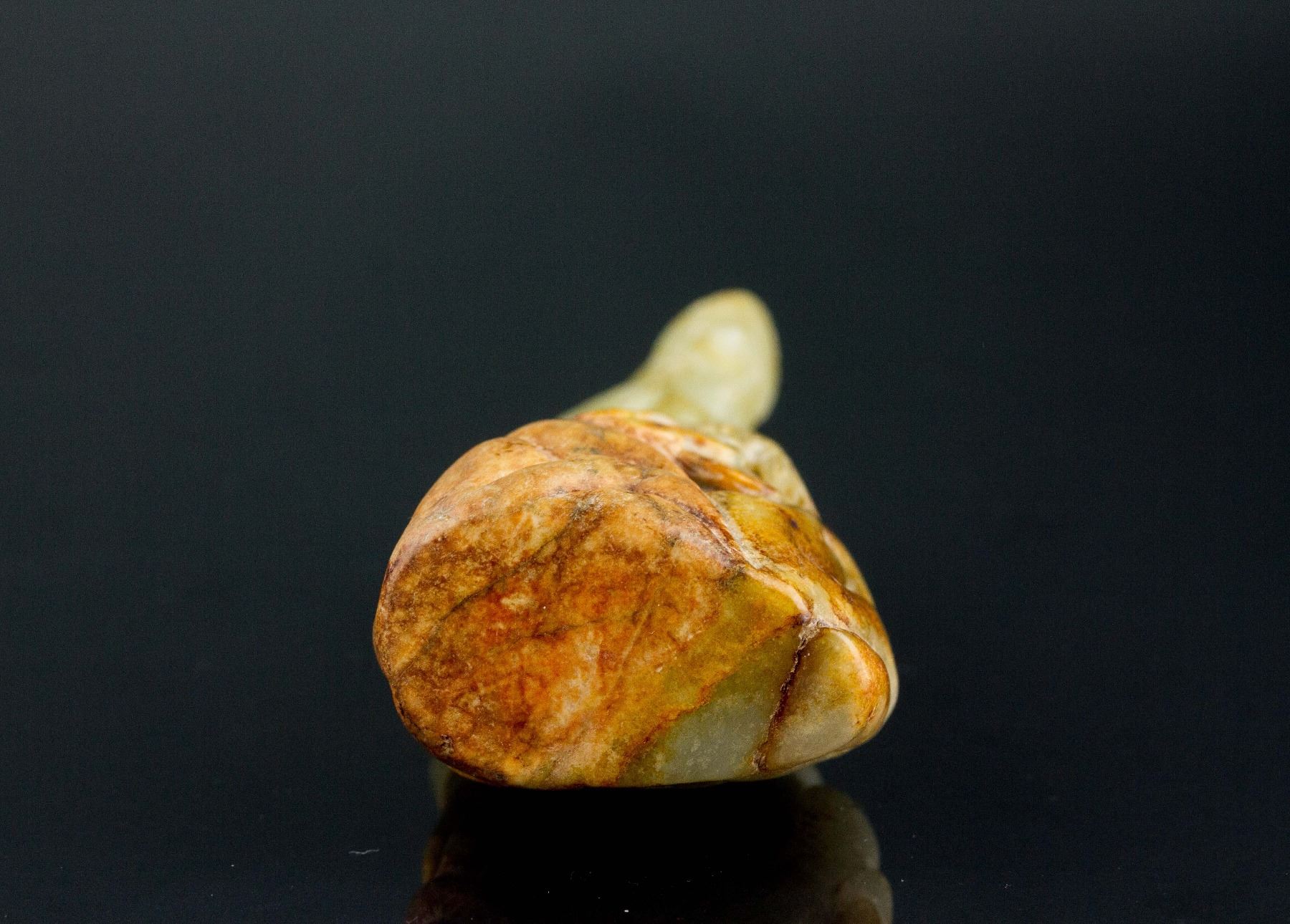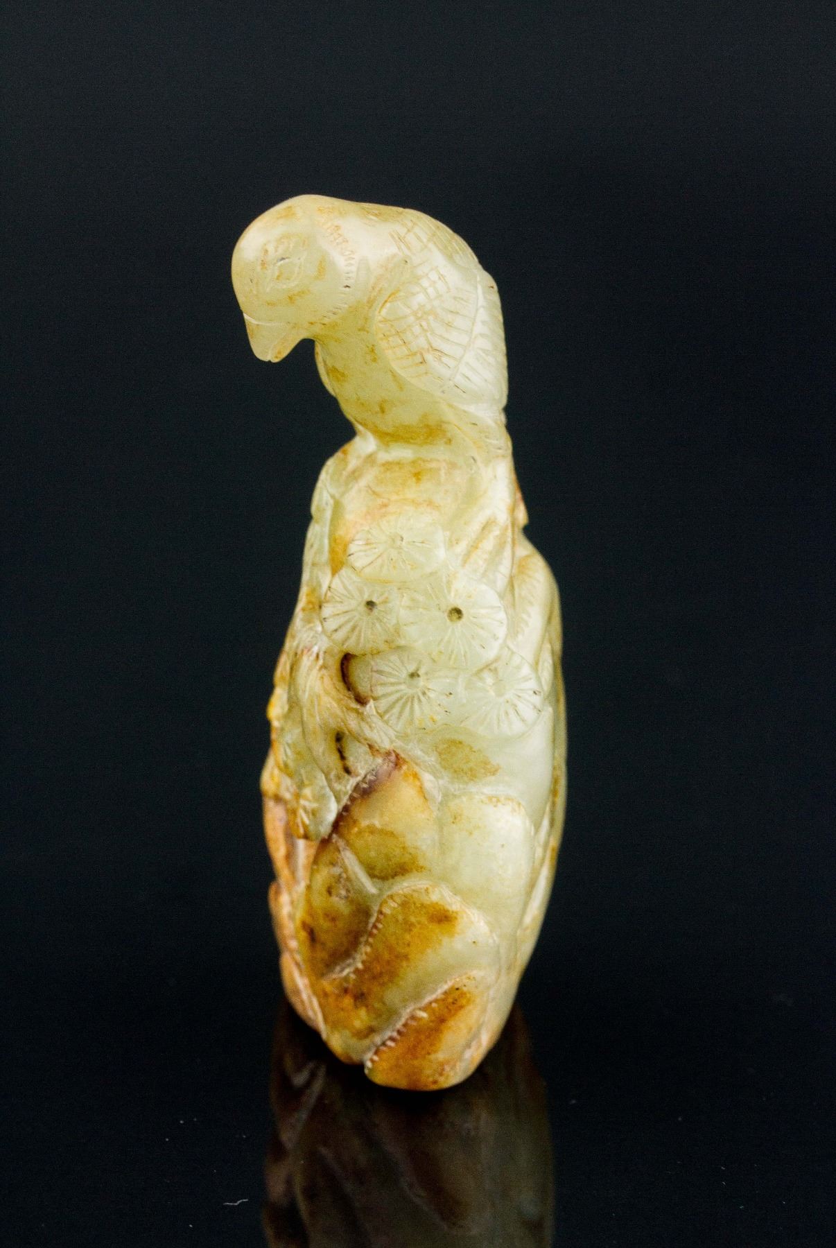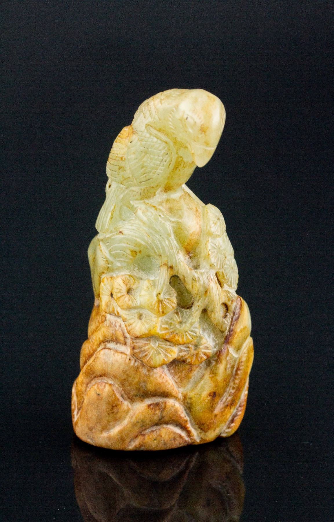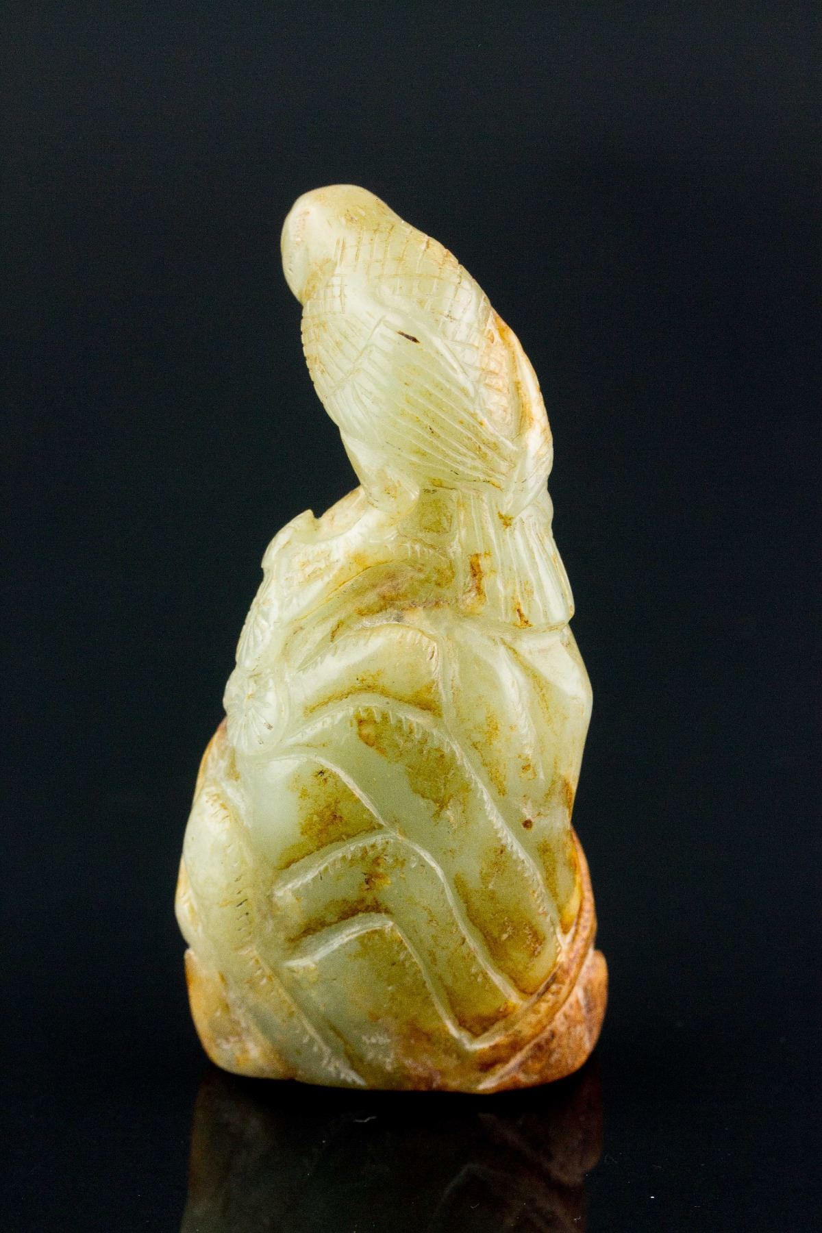 Chinese Hetian jade carved bird; depicting a bird standing on tree and rock; of pale green tone with russet skin; 9.5 cm x 4.5 cm, 201 grams, Density: 2.96