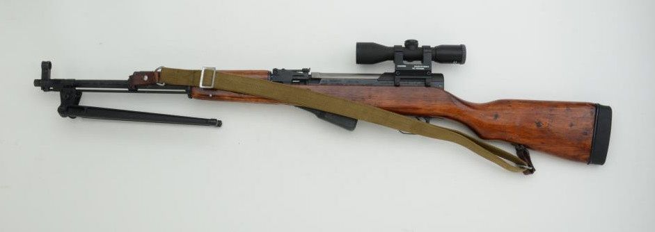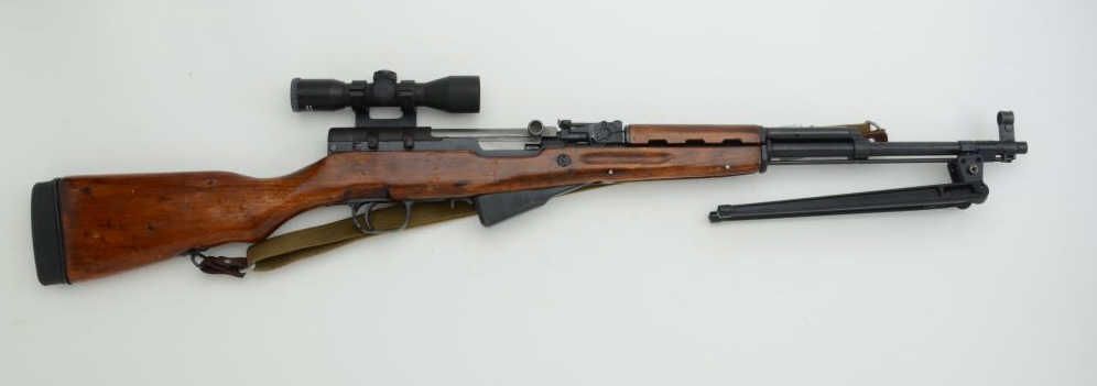 Chinese SKS semi-auto rifle, import-marked, with Leapers scope displaying good optics, 7.62mm cal., 19-1/2” barrel, re-blued, wood stock, woven sling, added bipod, #8904701 in overall good condition with good bore, action and wood stock; scattered surface erosion on barrel. Est.: $300-$500.