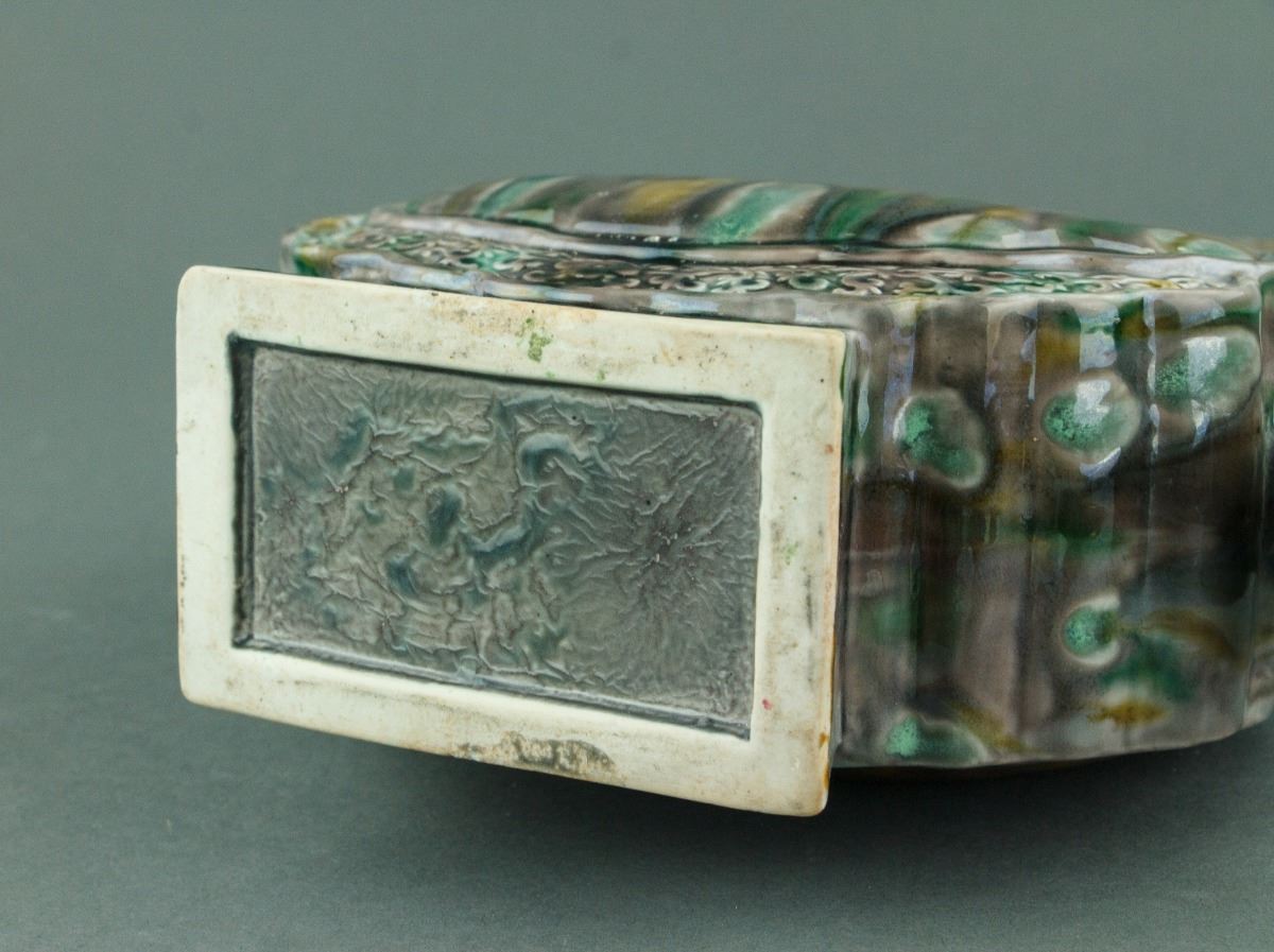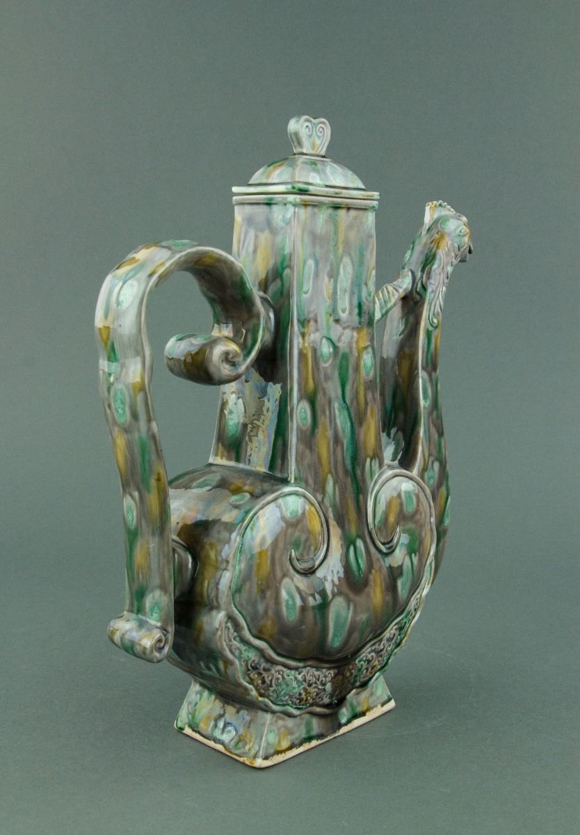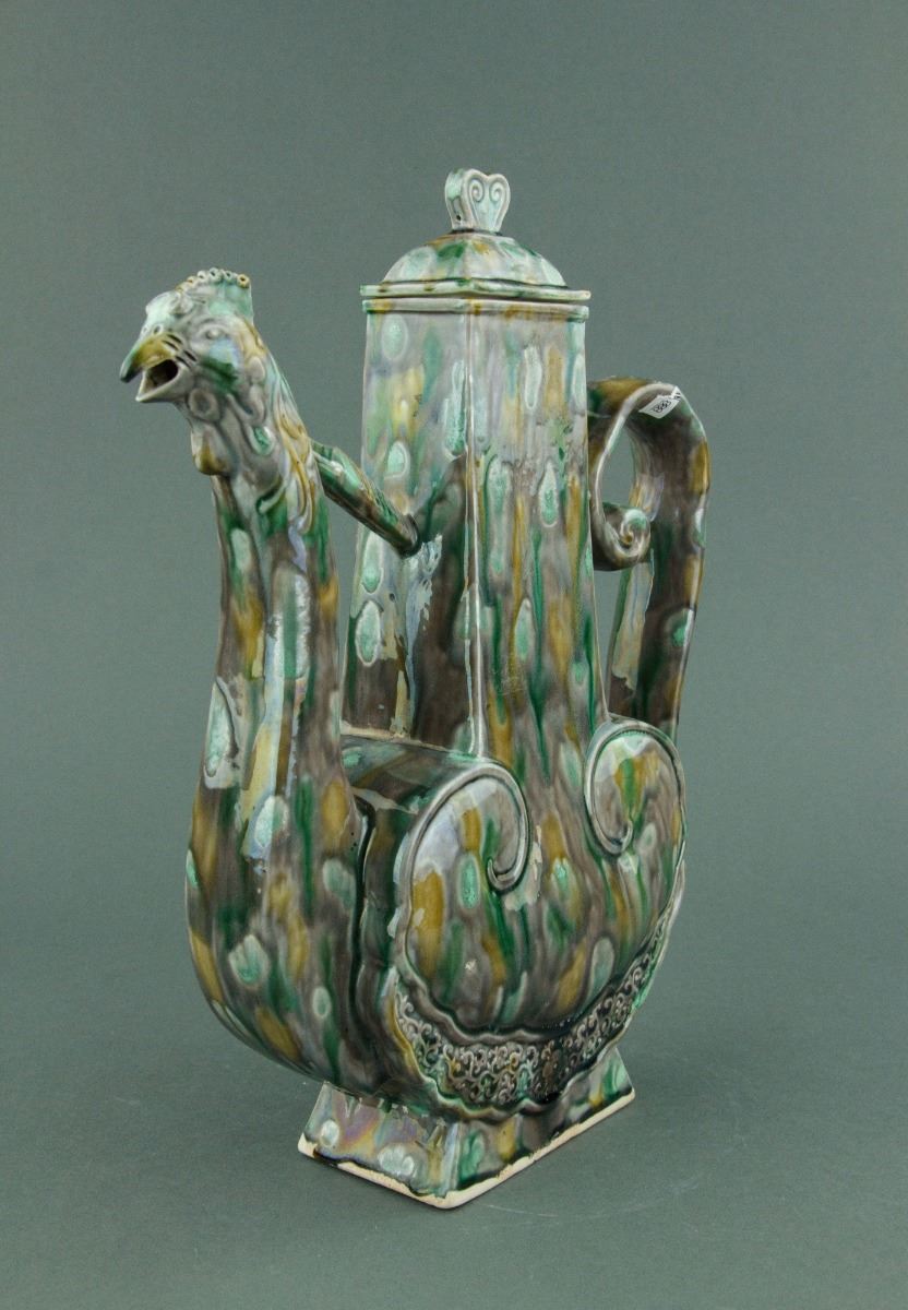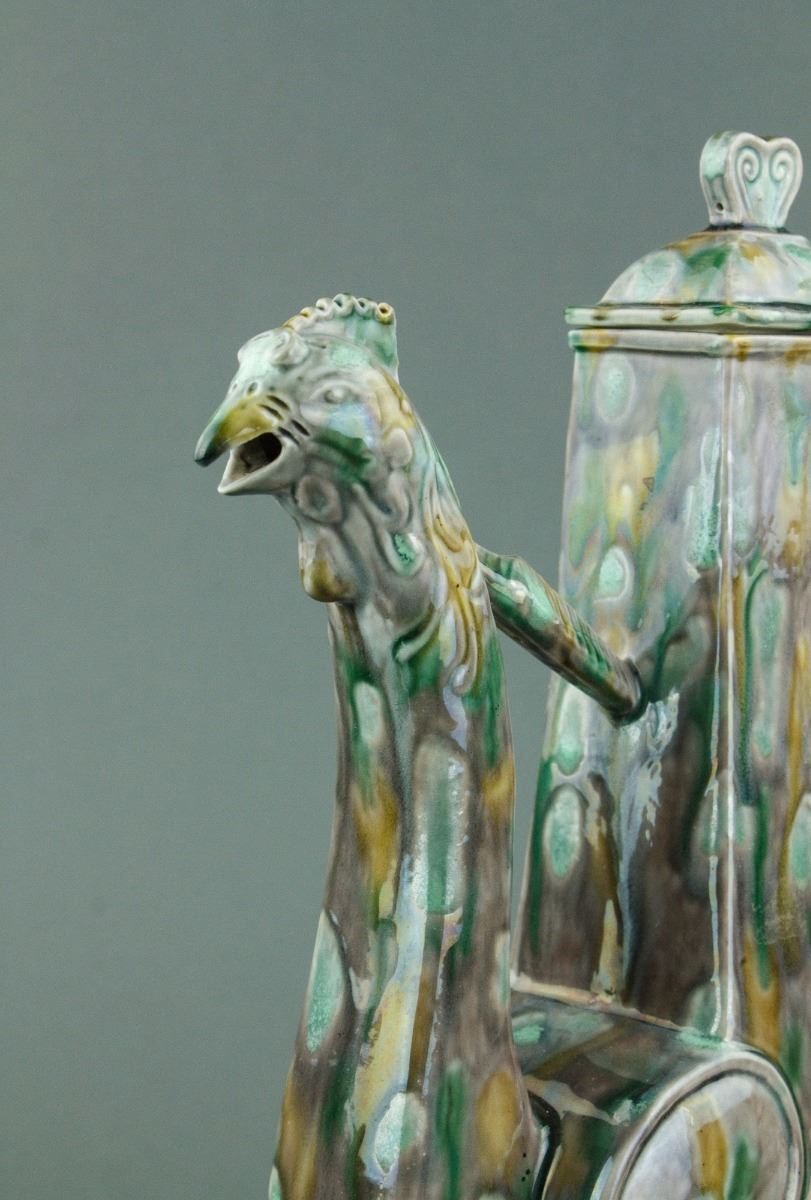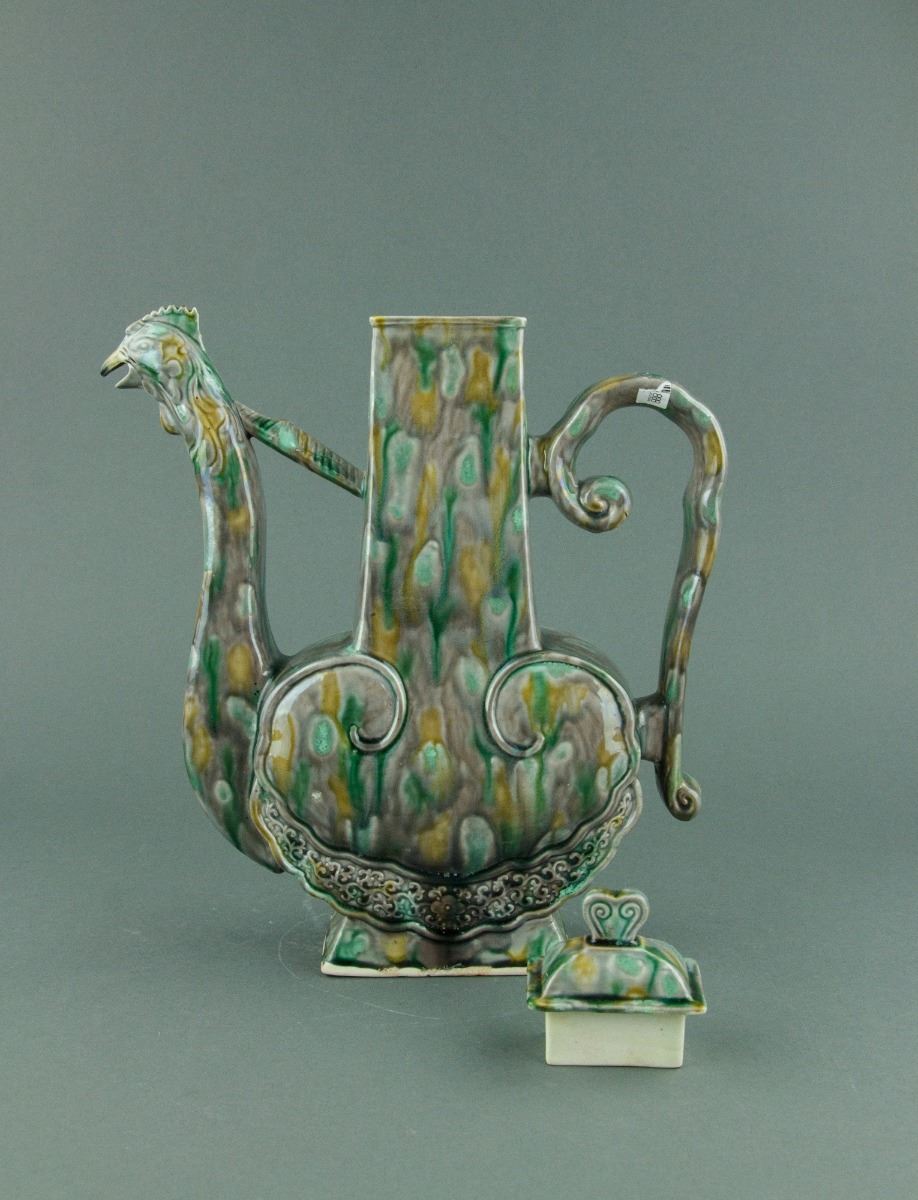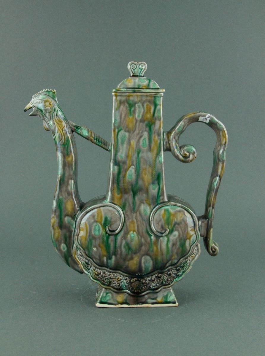 Chinese Sancai porcelain ewer with cover; of ruyi-shaped body connecting to a square elongated neck, rising from a splayed foot; flanked by a rooster-shaped spout and a flatten scroll handle; H: 32 cm W: 7 cm, L: 26 cm, 1455 grams