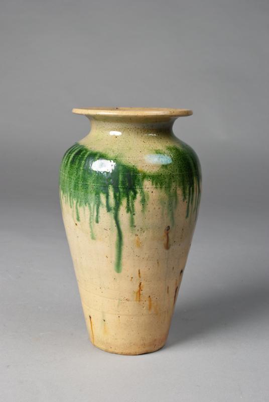 The pear shaped vase with extended rim and a wonderfull green to yellow glaze, 8"H, circa 19th century or earlier.