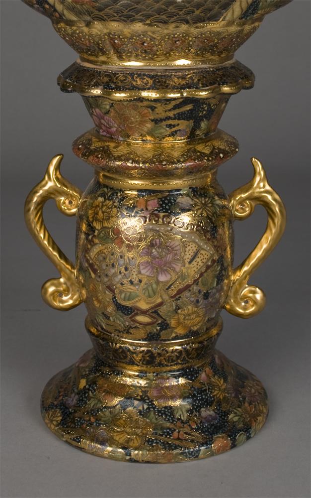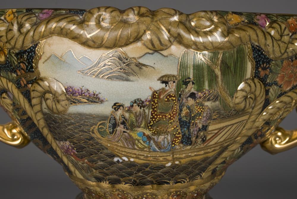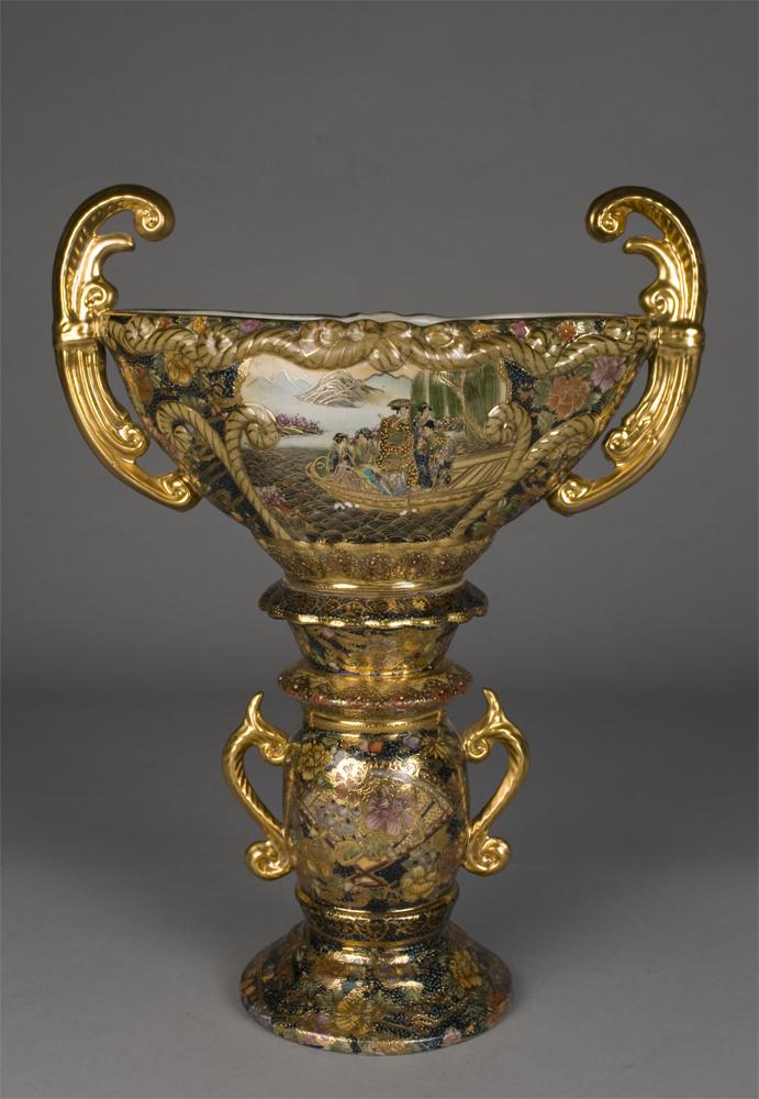 Two-handled bowl attached to pedestal decorated with figures in a boat, floral decorations and raised bows, decorated with moriage and heavy gilt highlights throughout. 17.25" H x 13.25" W. 20th Century.