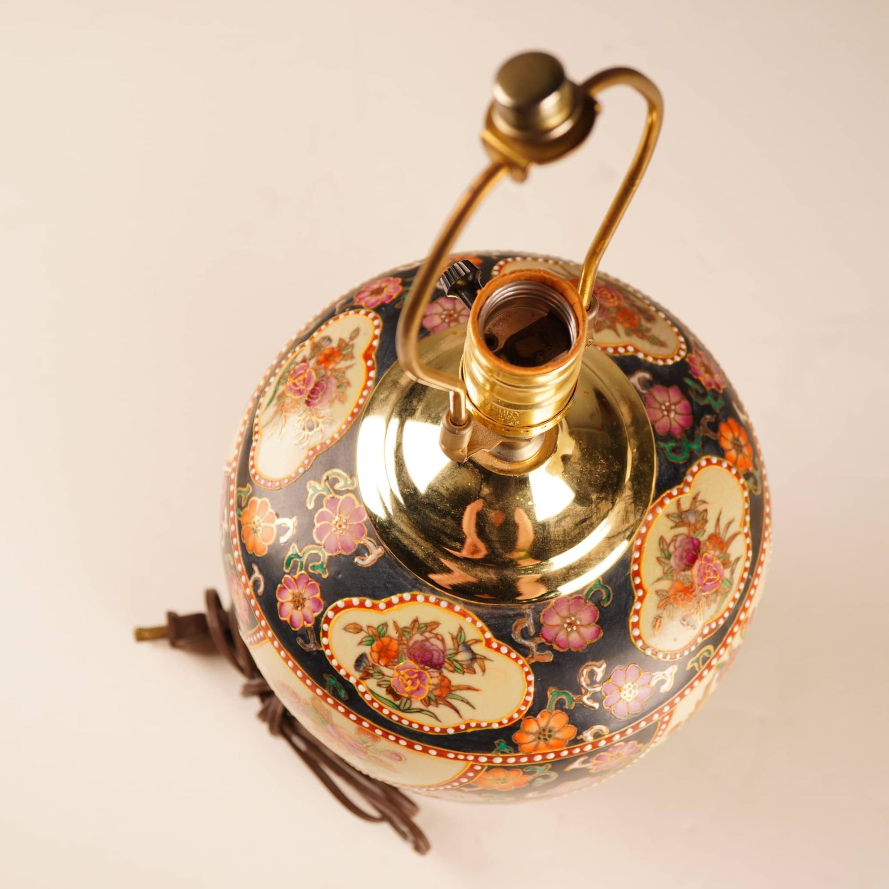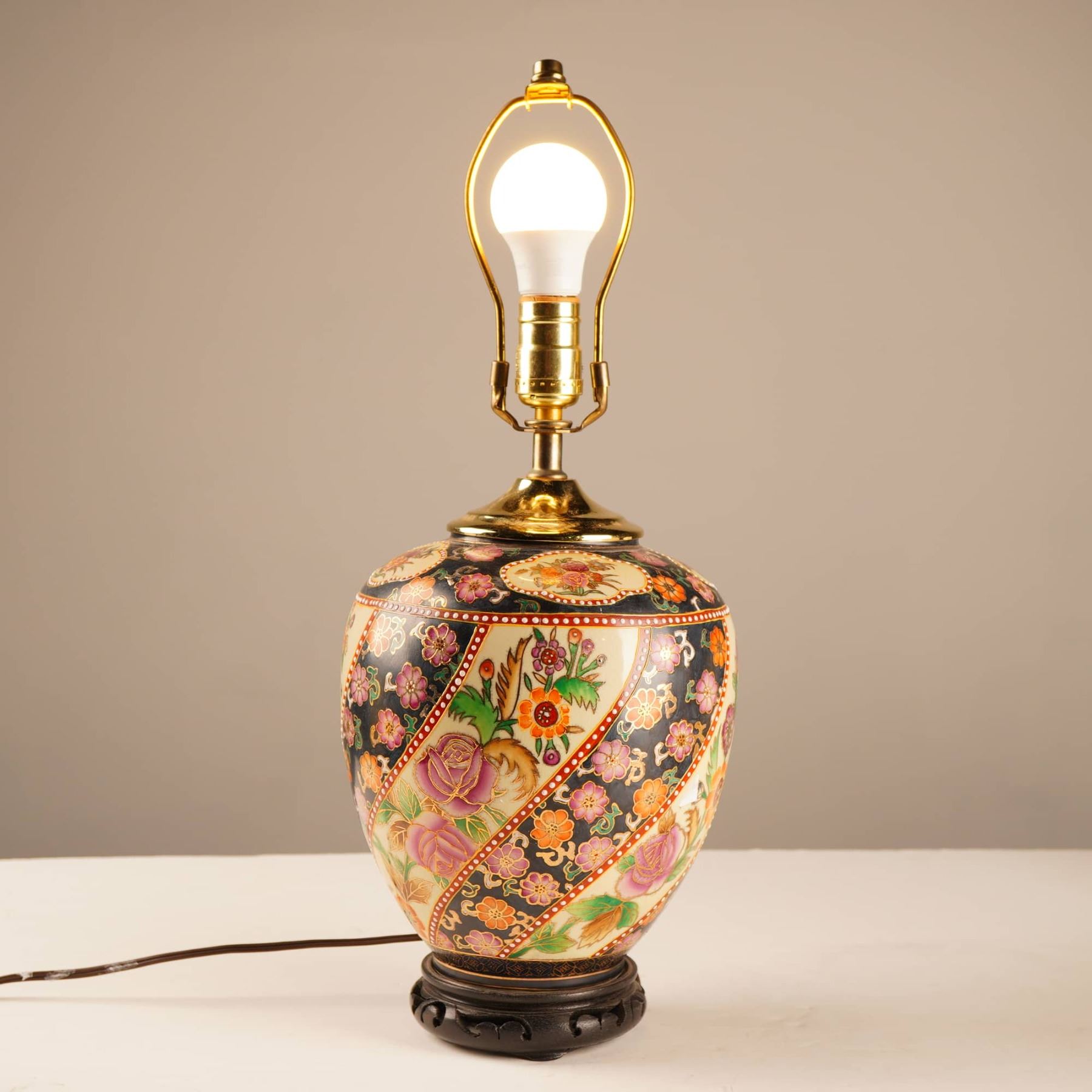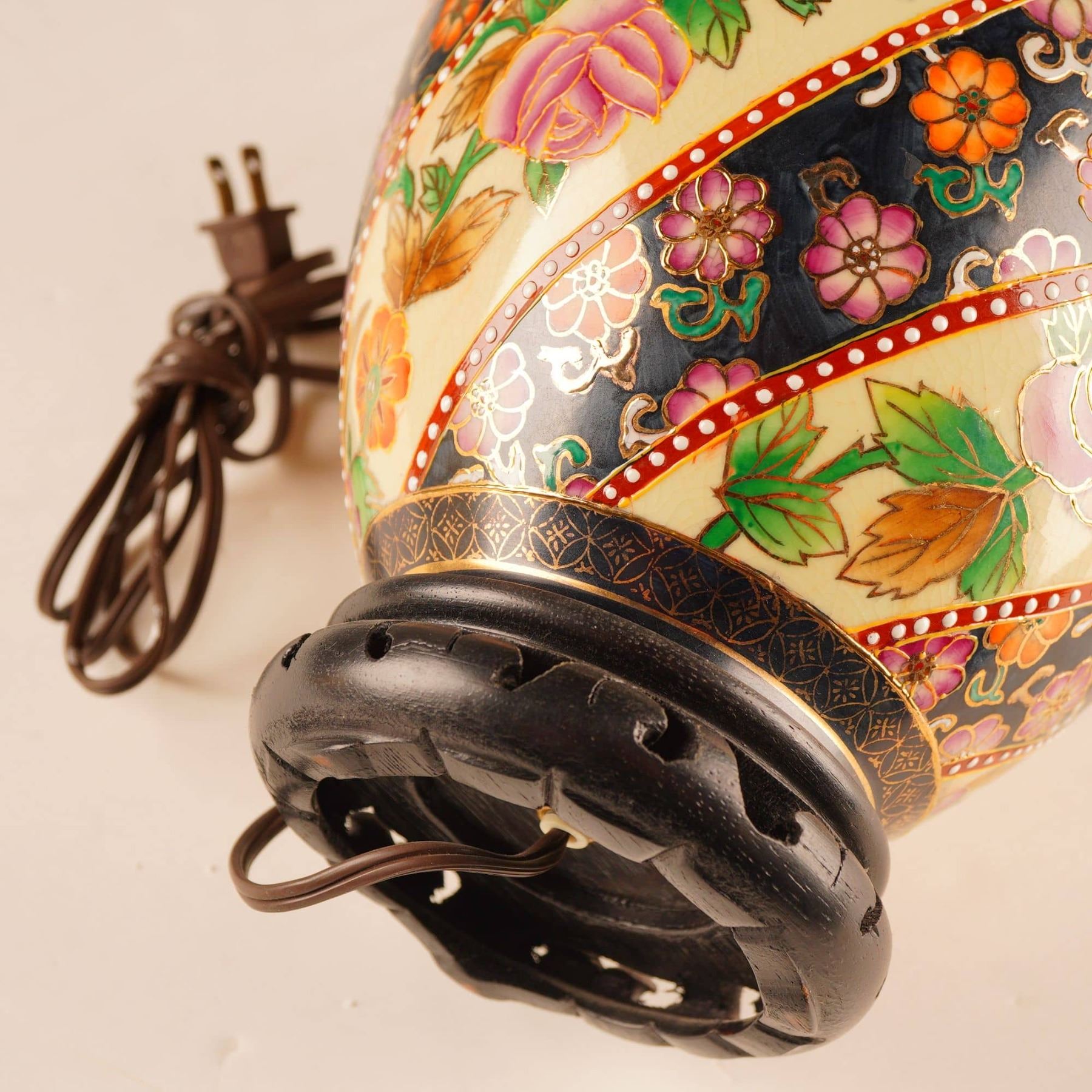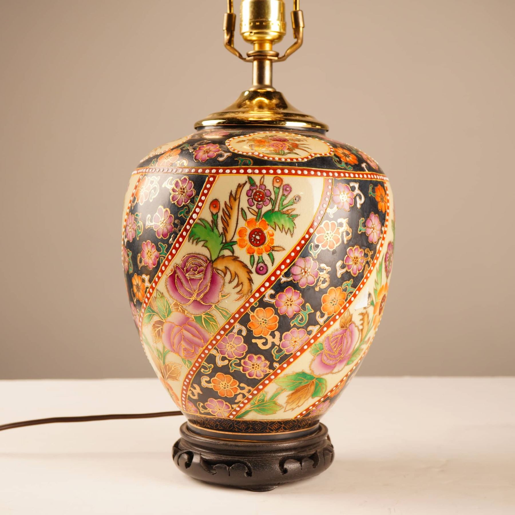 This Chinese Satsuma-style enameled ceramic table lamp features an ovoid body decorated with intricate floral and bird motifs, including peonies and chrysanthemums. The decoration is set against alternating diagonal bands of cream and black grounds and is accented by raised gilt highlights. The ceramic displays a fine craquelure glaze throughout. The lamp is mounted on a dark carved wooden base and fitted with brass-finished metal hardware, including a standard harp and socket.