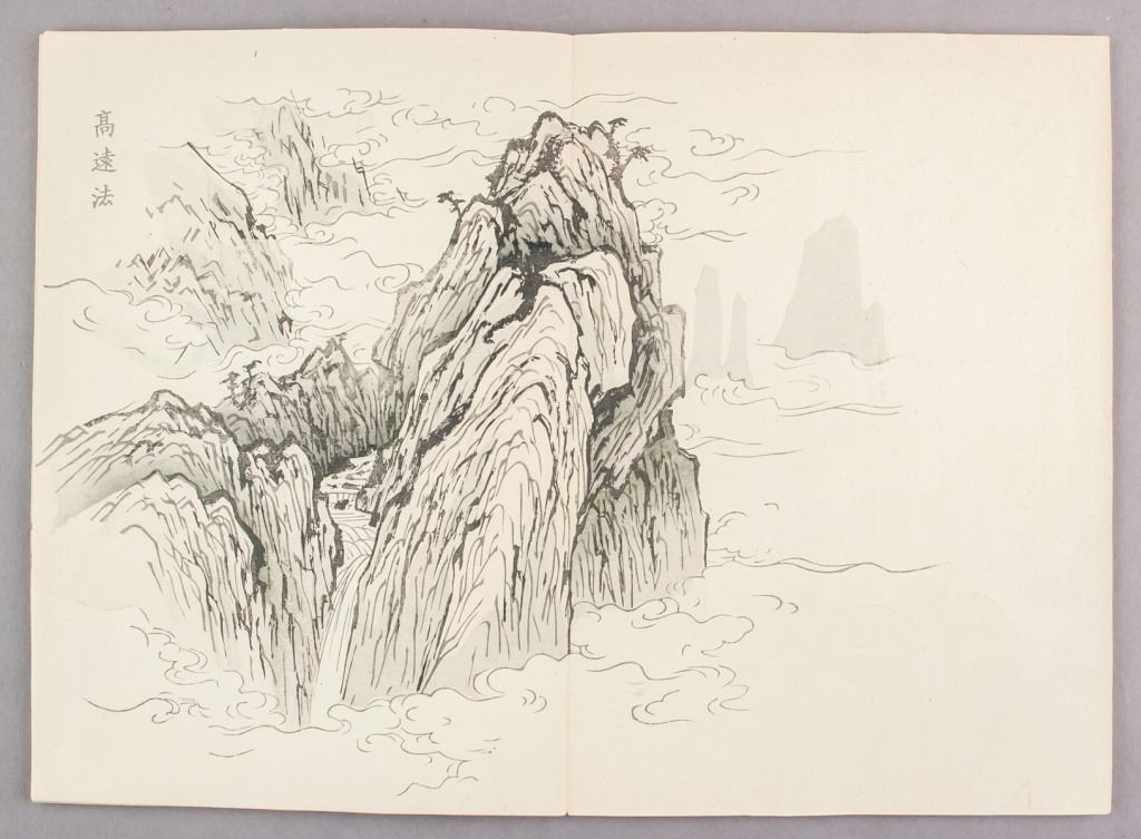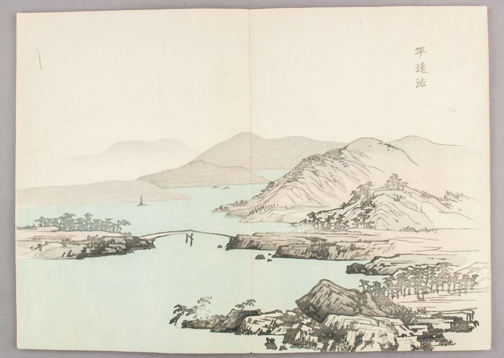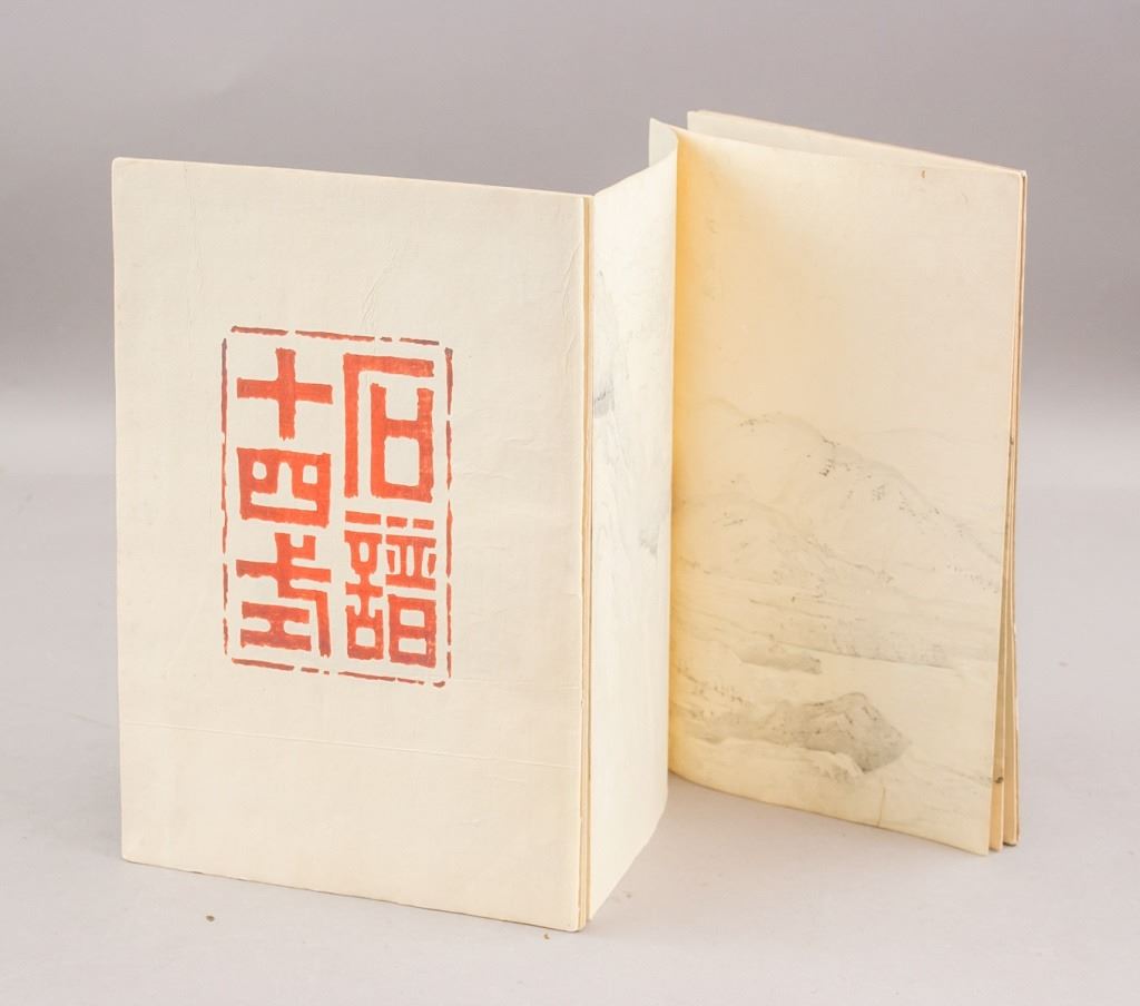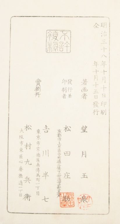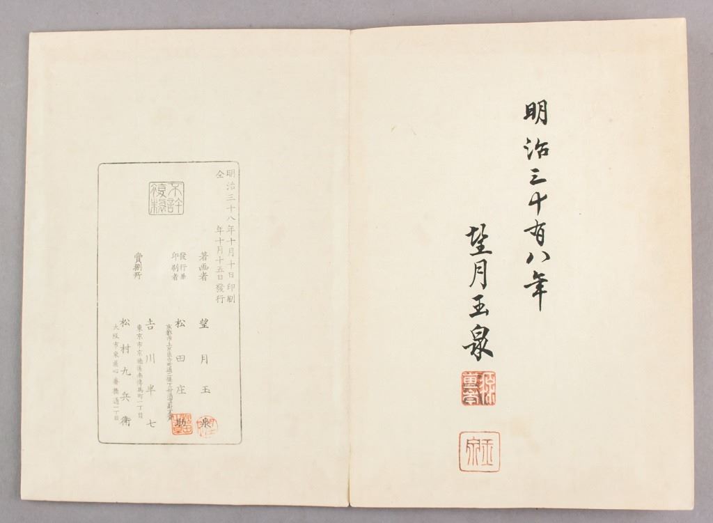 Chinese book, with various sceneries. Stamp inside cover reads: Printed in the 38th year of Mingzhi, on the tenth day of the tenth month. 22 x 16 cm.