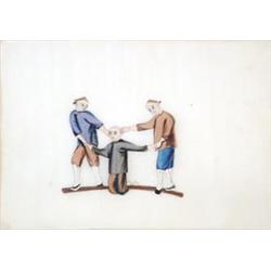 Chinese School, set of 12 gouaches on pith paper, torture scenes, 6.5ins x 9ins together with 2 s...