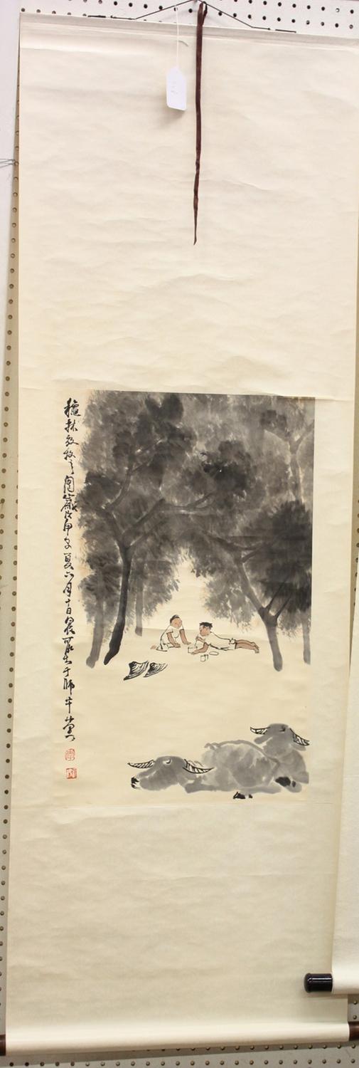 Chinese hanging scroll, Children and Oxen, after Li Keran (1907-1989), the left with a colophon and bearing a signature along with two seals, overall: 67''h x 22.75''w, image: 27.5''h x 17.5''w
