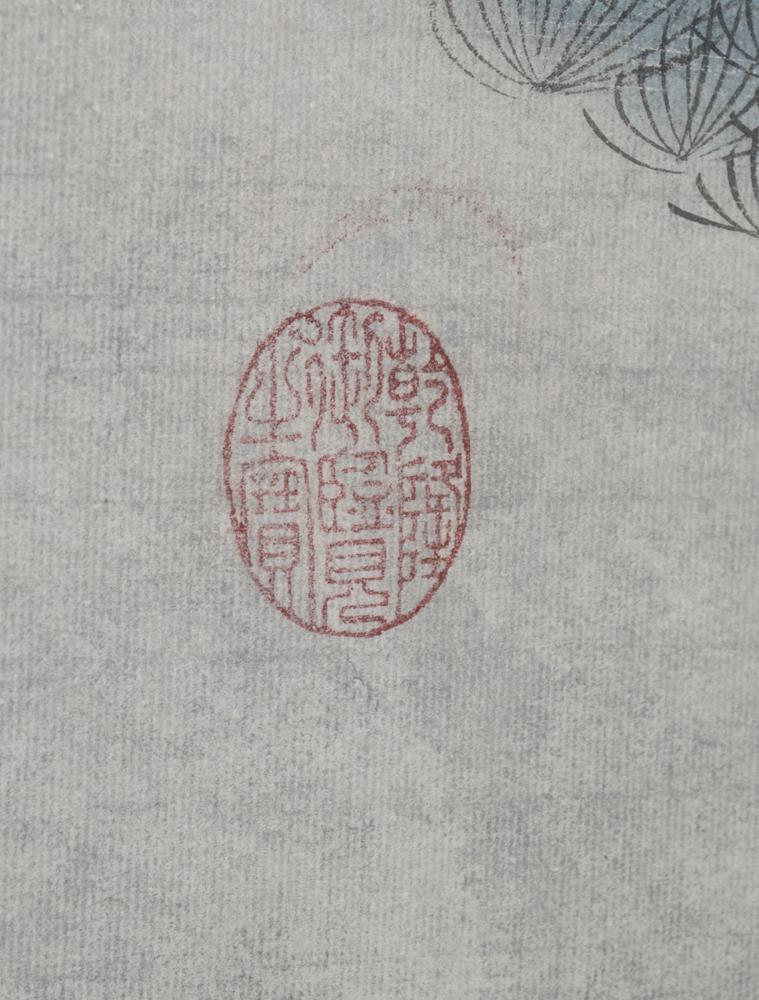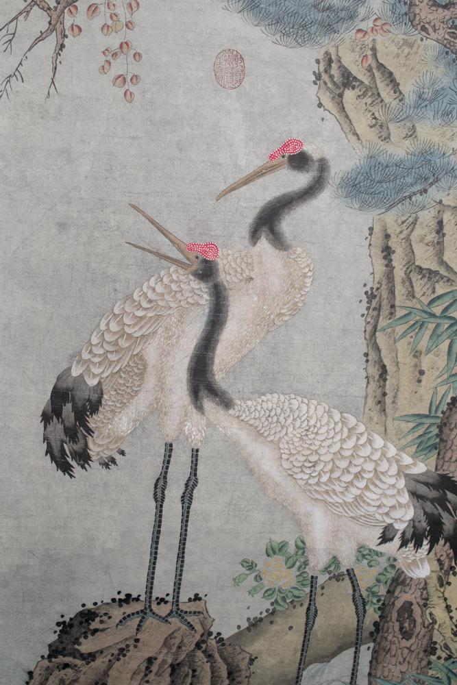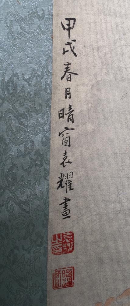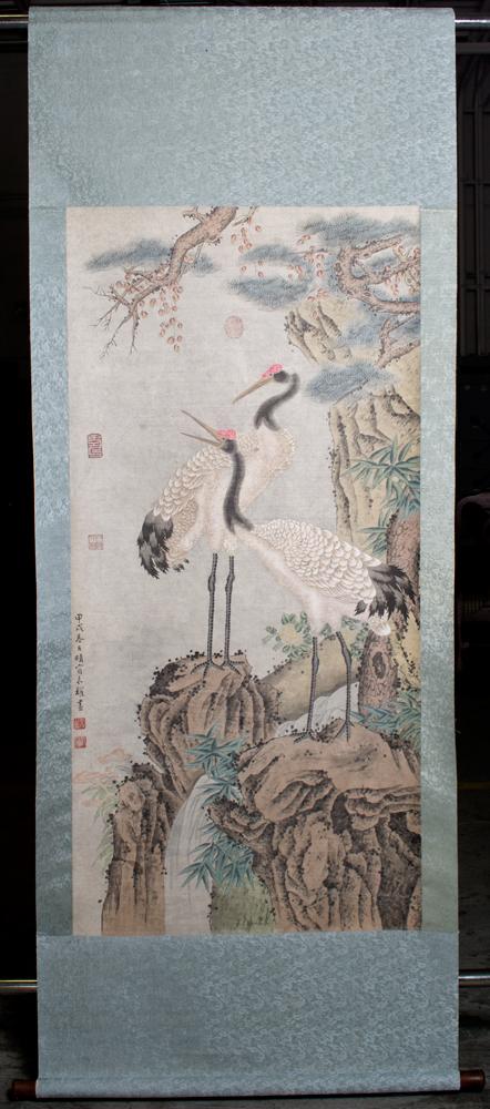 Attributed to Yuan Yao (1746-1780). Watercolor painting to depict two cranes atop a mountain waterfall with bamboo. Signed along left side with two iron red seal marks. Two additional iron red seal marks above signature and single iron red seal mark above cranes' heads. Attached to silk brocade, 52.5" H x 24.75" W, sight. Circa 20th century.