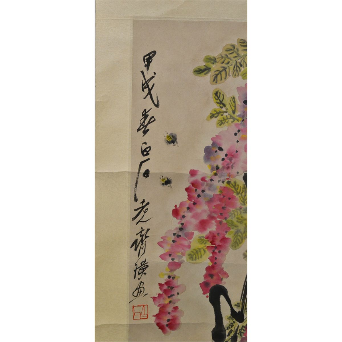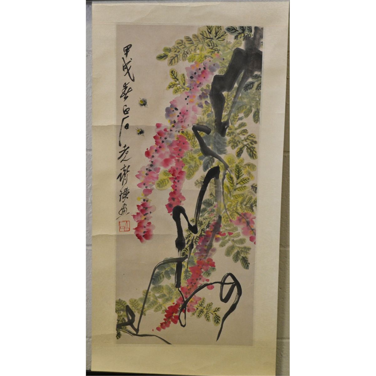 Attributed to Qi Baishi, (1864-1957). Watercolor painting to depict pink cascading blossoms. Signature and seal mark along left side, and attached to silk brocade. 25.75" H x 11.25" W, sight. Circa 20th century. Private collection Toronto, Canada.