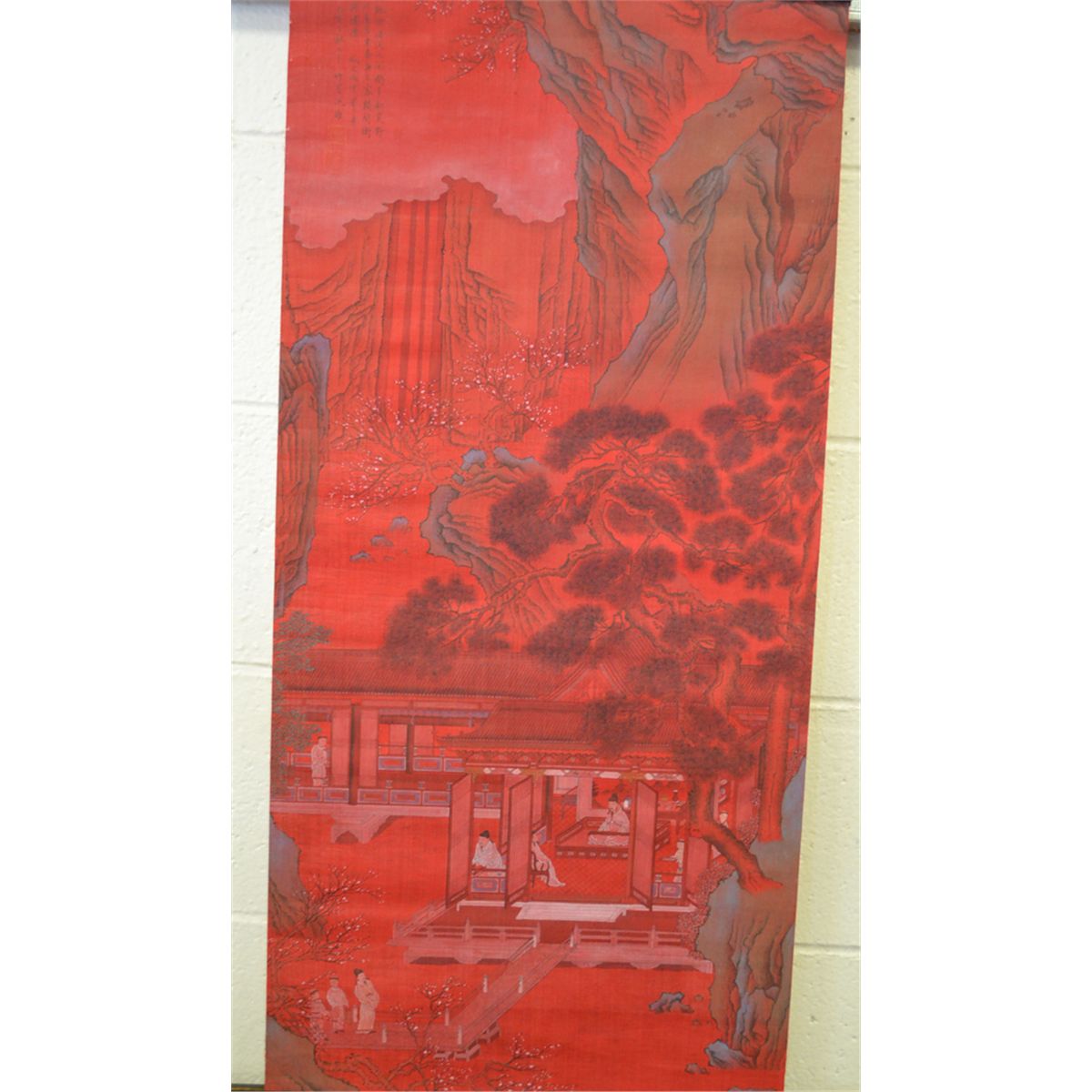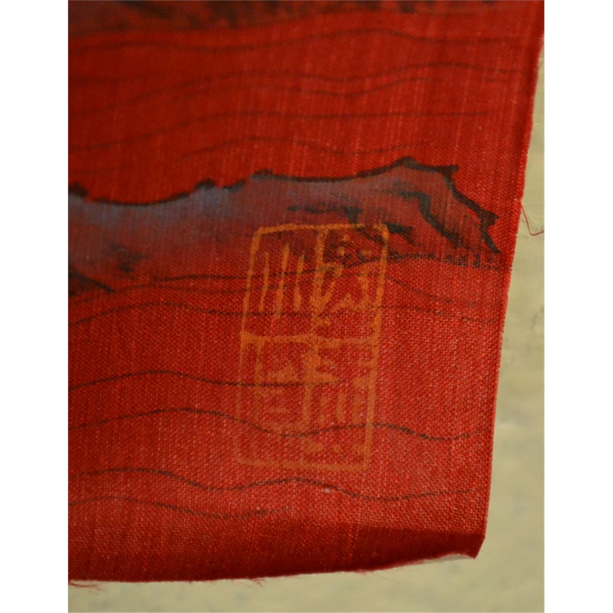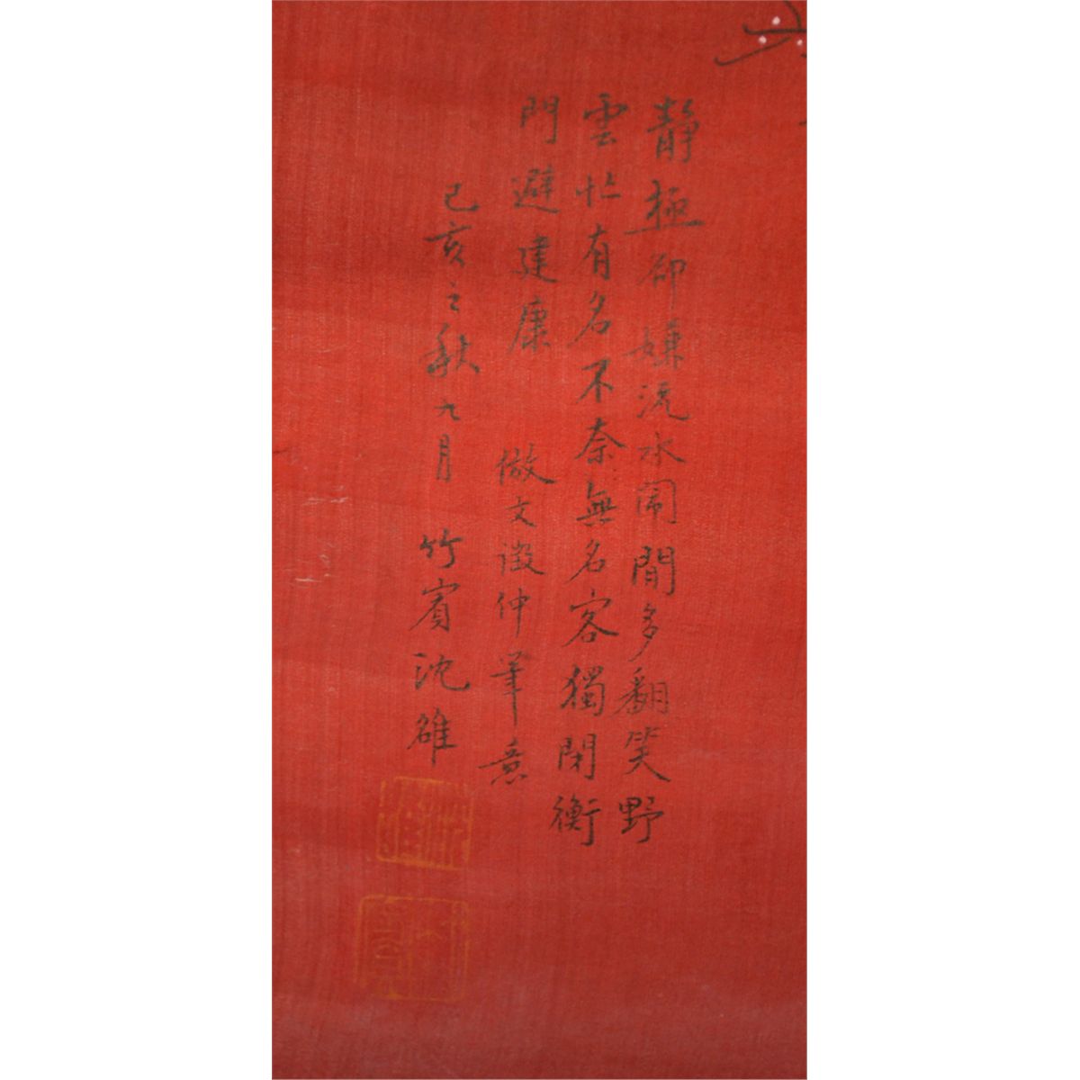Finely painted on silk in red field depicting a large mountain with figures in buildings with doors opened. Signature and two seal marks in UL. Shen Luo (1882-1954). 34" H x 15.5" W. Circa early 20th century. Private collection Toronto, Canada.