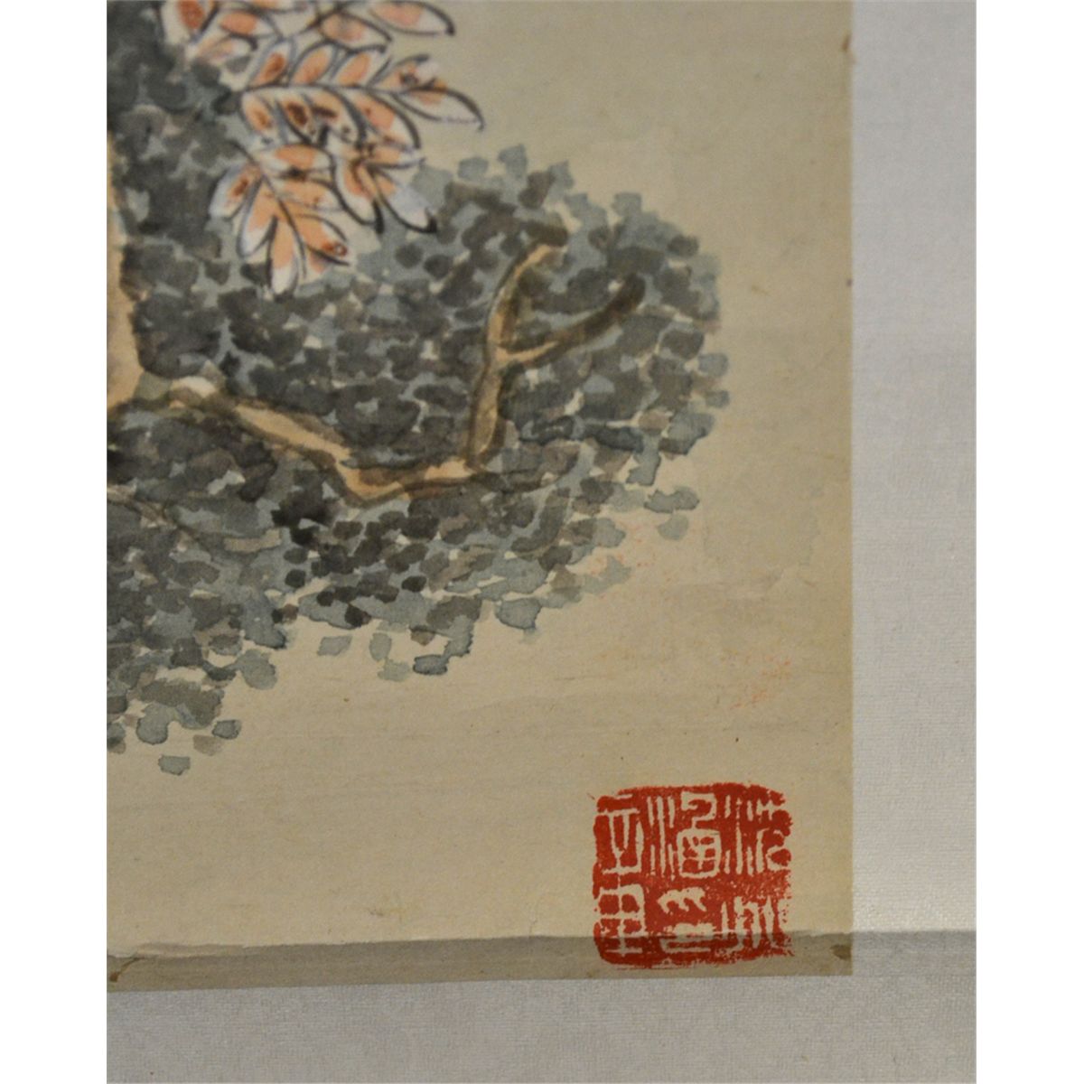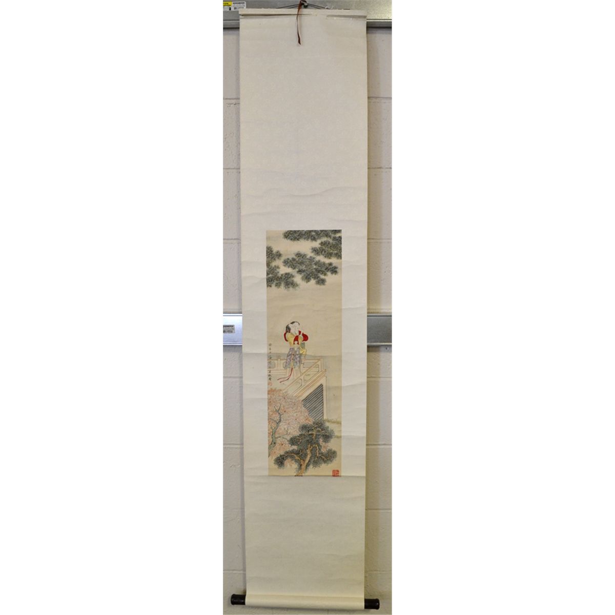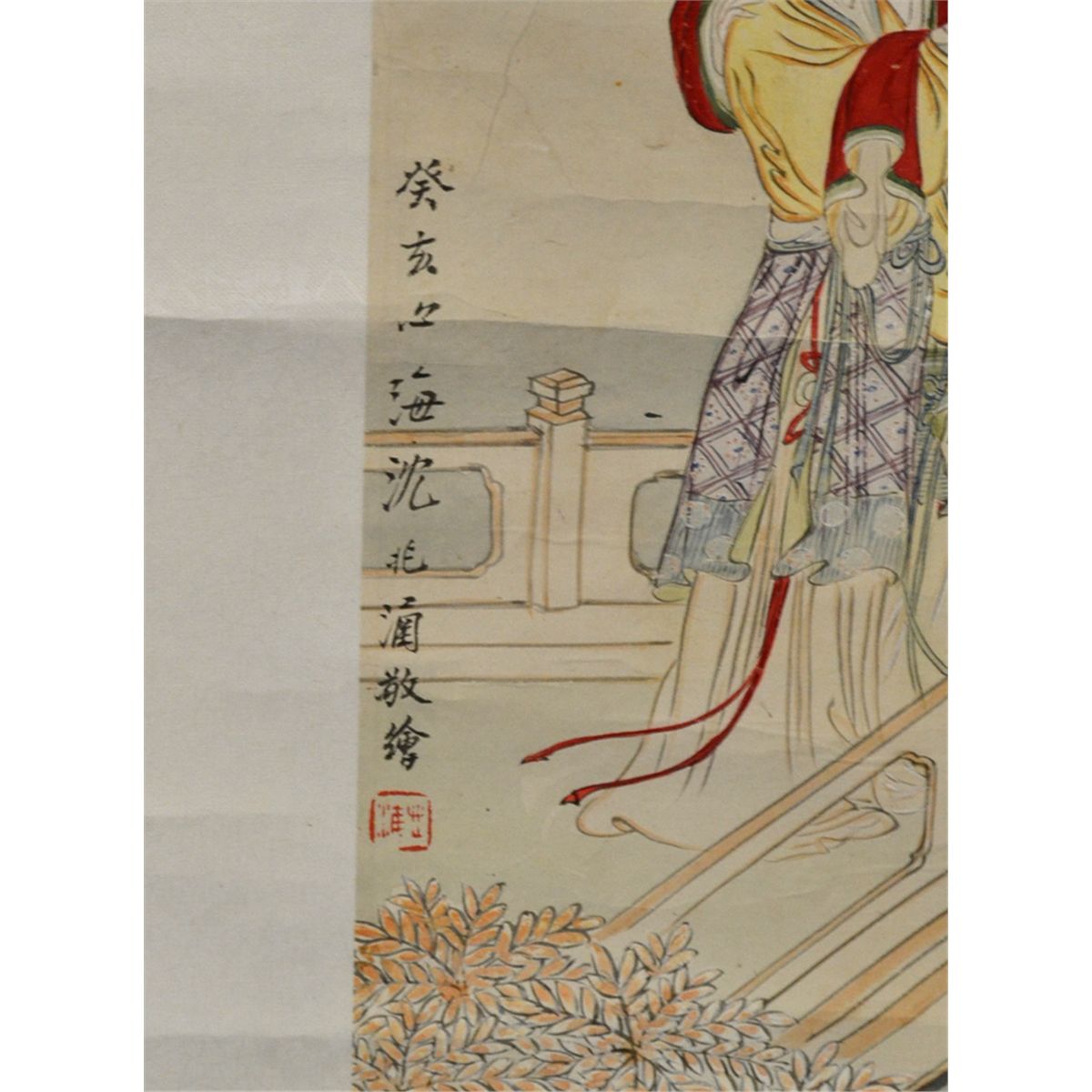 Attributed to Shen Zhao Han (1855-1941). Watercolor painting to depict two figures on a balcony beneath trees. Signature and seal mark in middle left, seal mark in LR, and attached to silk brocade. 27.75" H x 8.25" W, sight. Circa 20th century. Private collection Toronto, Canada.