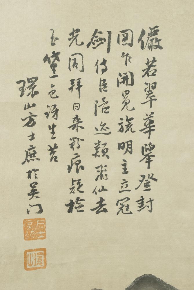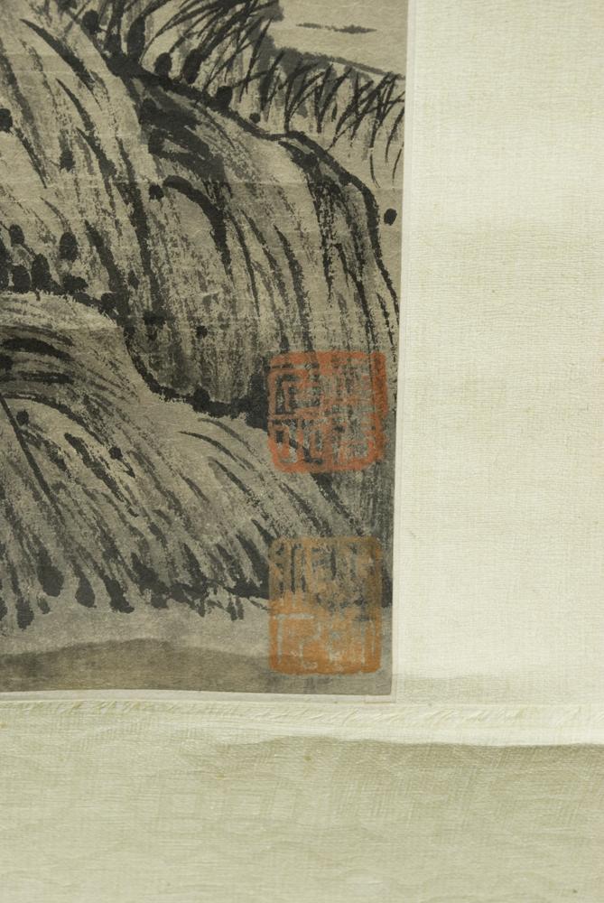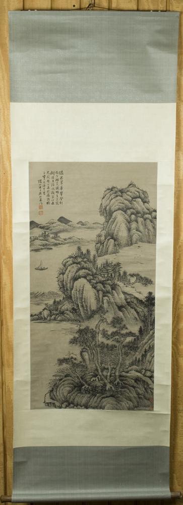 Bao Dong, 1799-1870. Watercolor painting depicting waterfront with several areas of rocky land with house/temple and figures in a boat. Signature and two seal marks in UL, two seal marks in LR, with silk brocade edging. 51" H x 18" W (sight).